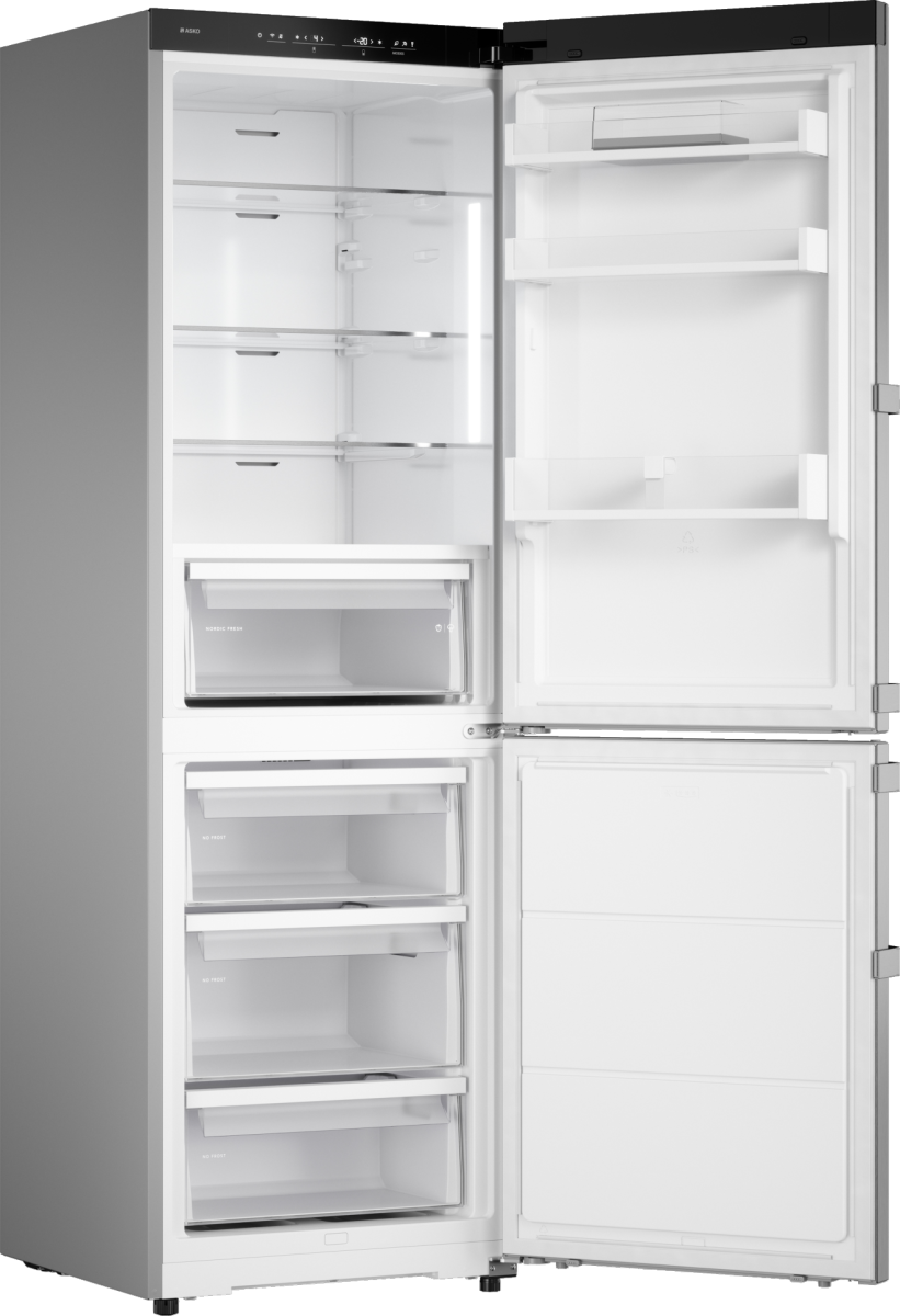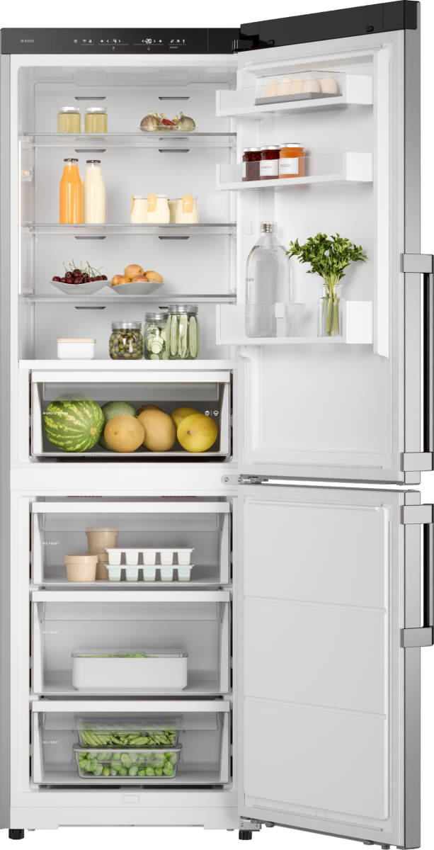 Холодильник ASKO RFC286KNBS1 — стильное и продуманное решение для современной кухни: корпус в цвете нержавеющая сталь, аккуратная ручка с гравировкой бренда и компактные габариты 185×59×59 см позволяют встроить прибор в нишу KitchenFit или установить отдельно с возможностью Side-by-Side, а регулируемые ножки и опция перевешивания дверцы дают свободу при монтаже. Двойная камера с морозильной секцией внизу обеспечивает универсальность хранения: общий полезный объем 306 л при общей емкости 357 л разделён на холодильное отделение 200 л и морозилку 106 л, где предусмотрены три вместительных ящика, лоток для льда и режим суперзамораживания с производительностью до 10 кг в сутки и автономным сохранением холода до 14 часов. Инверторный компрессор на R600A и циркуляционная система охлаждения поддерживают стабильную температуру при пониженном энергопотреблении класса A++, что сокращает расходы — годовой расход составляет 295 кВт·ч, при этом уровень шума держится на комфортных 34 дБ. Управление реализовано через электронный модуль с сенсорными кнопками и ярким LED-дисплеем, есть функция регулировки температур и приложение ConnectLife.TRIR для дистанционного контроля, а интеллектуальные режимы адаптивного контроля, режимы Вечеринка, Шаббат и очистки позволяют легко подстраивать работу под разные сценарии использования. Внутреннее пространство организовано эргономично: четыре стеклянные полки, сетка для бутылок, три полки на дверце и подставка для яиц, светодиодная подсветка упрощают доступ к продуктам; зона Nordic Fresh с регулировкой влажности и одним контейнером для свежести продлевает срок хранения мяса и рыбы, а функция суперохлаждения быстро понижает температуру для новых покупок. Система размораживания холодильника автоматическая, а морозильник оснащён технологией No Frost — это избавляет от регулярного ручного ухода. Корпус рассчитан на широкий климатический диапазон SN‑N‑ST‑T, а четырёхзвёздочное обозначение гарантирует хранение при низких температурах. Серийная комплектация включает телескопические направляющие и полку для бутылок, что повышает удобство эксплуатации, а индикация открытой двери звуковая, а при повышении температуры срабатывают световые и звуковые сигналы, что защищает продукты. Дизайн Series 2 гармонично сочетает строгие линии и функциональность: антибактериальное покрытие предотвращает рост микробов, эргономичная ручка и дисплей делают использование интуитивным, а мощность и экономичность в паре с продуманными отсеками обеспечивают комфорт на каждый день; этот холодильник от ASKO станет надежным помощником и подчеркнёт статус любой кухни.