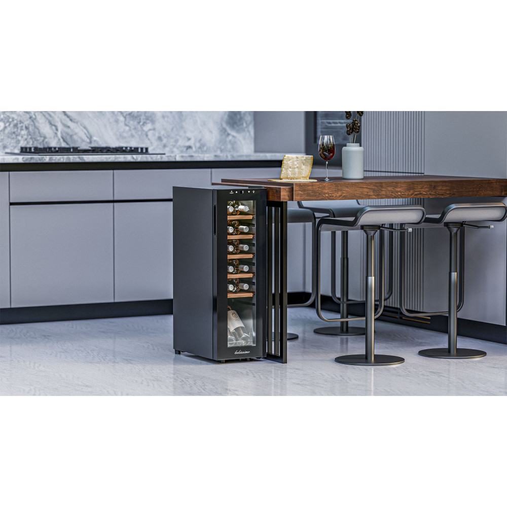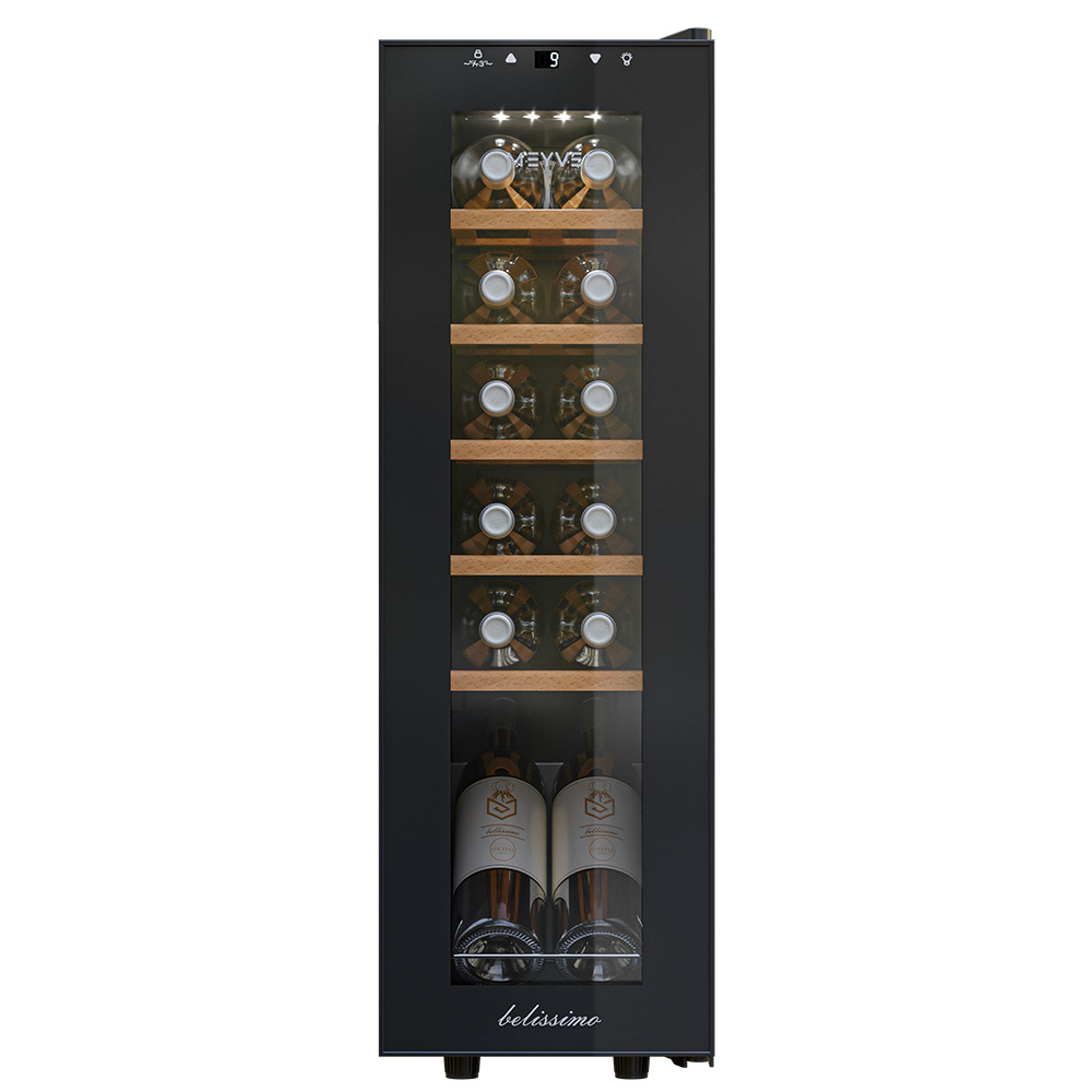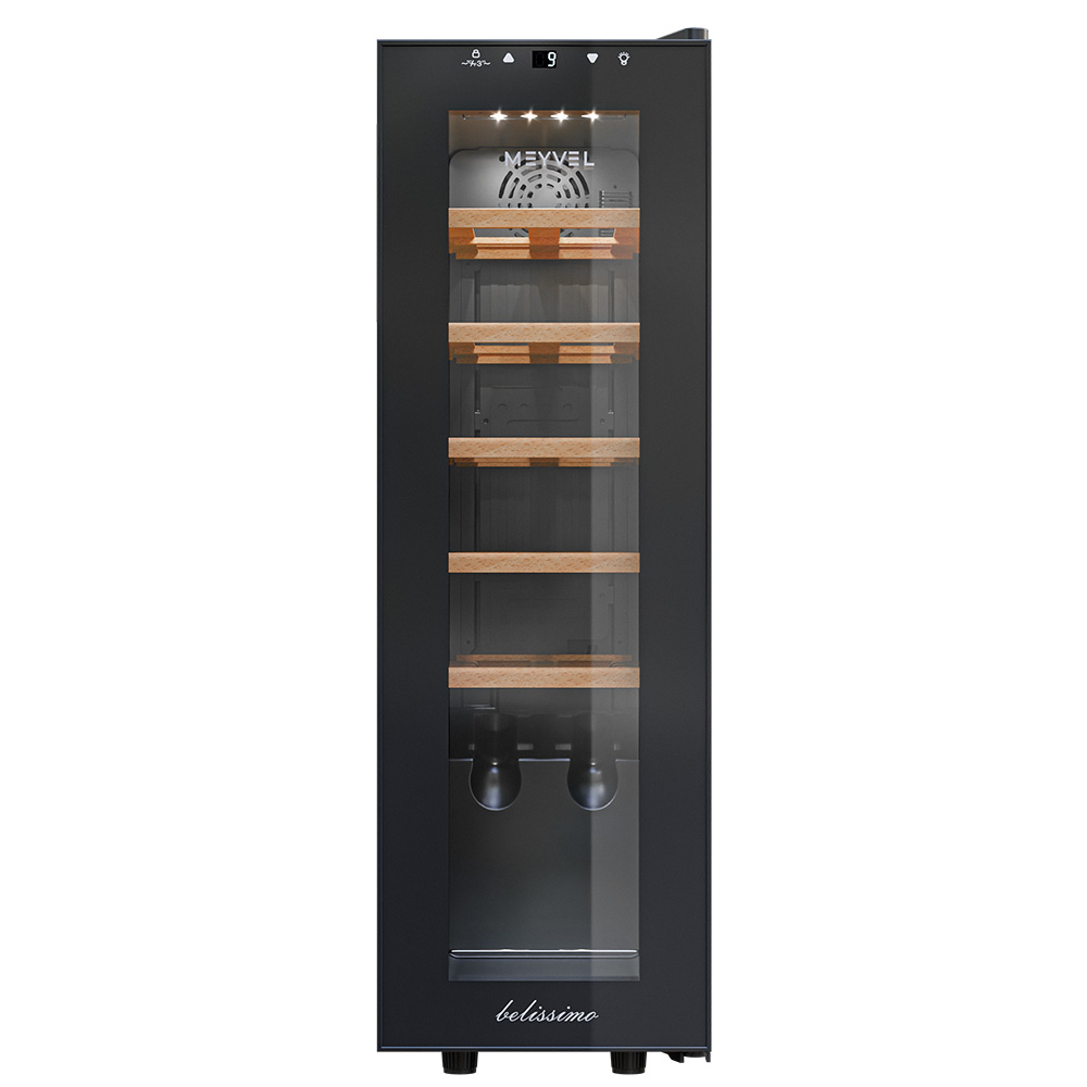 - ОписаниеКомпрессорный винный шкаф Meyvel MV12-CBF1 Винный шкаф Meyvel MV12-CBF1 — компактная и технологичная модель, разработанная специально для хранения вина при правильных температуре и уровне влажности. Он совмещает удобство использования с продуманными техническими характеристиками, не требует много места и сложного обслуживания. Компактность и дизайн В винный шкаф помещается 12 бутылок, и это оптимальный объём для тех, кто только начинает собирать коллекцию или предпочитает держать под рукой небольшой, но тщательно отобранный набор вин. При этом устройство не выглядит громоздким и отлично вписывается даже в небольшие помещения. Лаконичный и вместе с этим стильный корпус выполнен из металла глубокого чёрного цвета. Утопленная ручка подчёркивает минималистичный дизайн, не нарушая визуальную целостность фасада. Технические возможности Meyvel MV12-CBF1 оснащён компрессорной системой охлаждения, которая поддерживает стабильный температурный режим в диапазоне от +5 до +12°C. Эти показатели подходят разных типов вин — от белых и игристых до красных. Шкаф также сохраняет уровень влажности в пределах 60–80%, предотвращая пересыхание пробок. Для сохранения правильного микроклимата в конструкции предусмотрены отверстие для отвода влаги и поддон для конденсата. Последний собирает излишки влаги, благодаря чему внутри не образуется плесень и неприятный запах. Защита и удобство Винные бутылки чувствительны к внешним факторам, и производитель предусмотрел несколько решений для их защиты. Стеклянная дверь оснащена фильтром от ультрафиолета, который блокирует солнечные лучи и не даёт напитку «состариться» раньше времени. Шкаф работает практически бесшумно и не вибрирует — уровень шума составляет всего 30 дБ, что сравнимо с шёпотом. Его можно смело ставить в гостиной или кухне-студии, не опасаясь дискомфорта. Для удобства предусмотрена светодиодная подсветка, которую можно включить кнопкой. Она мягко подсвечивает бутылки, создавая эффектный акцент и помогая легко найти нужное вино даже вечером. Полки: классические и демонстрационная Внутреннее пространство разделено на пять стандартных полок и одну особую — демонстрационную. Её назначение — выгодно выделить одну или несколько бутылок, разместив их под наклоном. Это не только красиво смотрится, но и удобно, если хочется сразу показать гостям фаворитов коллекции. Практичные детали Винный шкаф устойчив благодаря регулируемым ножкам — их можно подстроить под неровный пол. Панель управления имеет функцию блокировки, что защищает настройки от случайного изменения, например, детьми. Все элементы продуманы так, чтобы техника служила долго и не требовала сложного ухода. Meyvel MV12-CBF1 — это практичное и элегантное решение для хранения вина в домашних условиях, ресторанах или барах. Он сочетает компактность, современный дизайн и техническую надёжность. В нём предусмотрены все ключевые аспекты: поддержка температуры и влажности, защита от ультрафиолета, бесшумная работа и удобная организация внутреннего пространства.