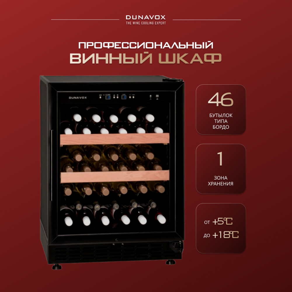 - ОписаниеУцененный винный шкаф Dunavox DX-46.103K Наличие товара и вид дефекта уточняйте у менеджера. На уцененную модель предоставляется стандартная гарантия. Компрессорный винный шкаф Dunavox DX-46.103K Винный холодильник DX-46.103K - самый компактный из серии Horeca для ресторанов и погребов. Шкаф оснащен угольным фильтром и имеет одну зону охлаждения. В базовую комплектацию входят две полки из дерева Сапеле, которое, кроме превосходных декоративных свойств, является очень прочным, и полки из него способны выдержать значительные нагрузки. Винный шкаф DX-46.103K может использоваться как отдельностоящий, так и встроенный, с соблюдением необходимых для охлаждения зазоров 2-5 см, так как охлаждение системы компрессора осуществляется через вентиляционные решетки внизу шкафа. Данная модель снята с производства, но Вы можете приобрести уцененный винный шкаф Dunavox DX-46.103K. Отличительные особенности Одна зона охлаждения Угольный фильтр в базовом комплекте (рекомендуется менять 1 раз в год). Простое встраивание в мебельную нишу. Две особо прочные деревянные без лакового покрытия. Возможность дополнительного заказа демонстрационных полок для презентации лучших вин коллекции и хранения открытых бутылок. Функциональные особенности: Дверца шкафа выполнена из тонированного стекла с защитой от УФ лучей в рамке из нержавеющей стали. Температурный режим в диапазоне от +5°C до +22°C подходит для хранения любых сортов вин. Электронная панель управления . Угольный фильтр служит для улучшения воздухообмена в шкафу, очищения от посторонних запахов и устранения лишней влаги. Дверь не перевешивается (петли справа). Замок, встроенный в металлическую рамку двери. Внутреннее освещение (светодиодная подсветка). Климатические классы N: от + 16 °C до + 32 °C SN: от + 10 °C до + 32 °C ST: от + 18 °C до + 38 °C T: от + 18 °C до + 43 °C