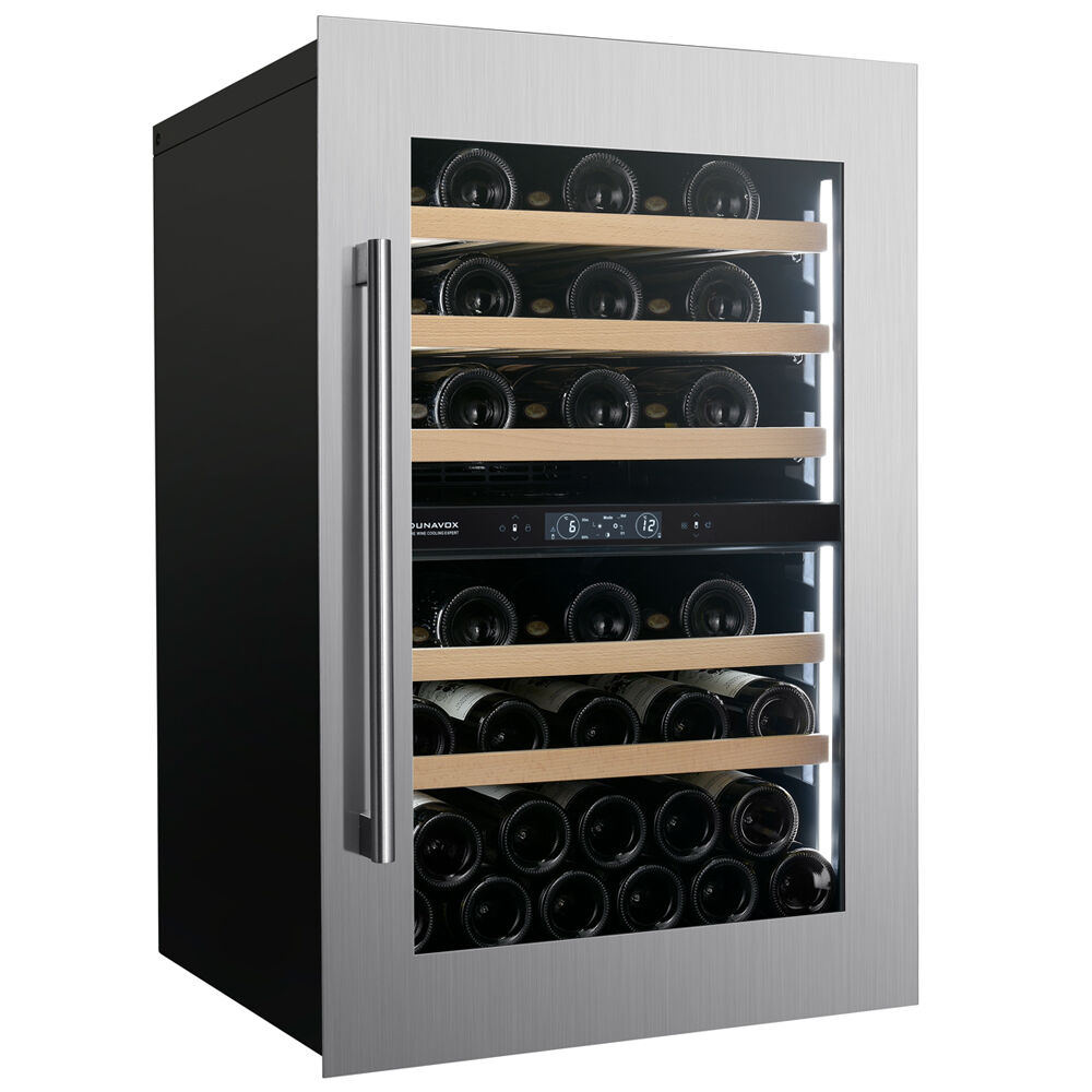 - ОписаниеКомпрессорный винный шкаф Dunavox DVS-44.120DSS Инженеры компании Dunavox разработали новую модель винного шкафа DVS-44.120DSS, входящего в серию «ЭНЕРГИЯ» («SPIRIT»). В линейке представлено оборудование премиум-класса со встроенной системой вентиляции, ручкой, ЖК-дисплеем, а также возможностью управлять настройками через мобильное приложение. Встроенная подсветка трех цветов (белая/синяя/янтарная). Каждая буква и цифра в названии модели DVS-44.120DSS говорит о его функциях: DVS — встраиваемый шкаф, оснащен ручкой и встроенной системой вентиляции; 44 — количество вмещаемых бутылок; 120 — внутренний объем в литрах; DSS — шкаф с двумя температурными зонами и серебристой дверцей из нержавеющей стали. Изысканная модель Dunavox DVS-44.120DSS вместимостью 44 бутылки с ЖК-экраном. Встраивается в колонну, полноценно вливаясь в кухонный гарнитур. Сочетая в себе передовые технологии с элегантным современным дизайном, этот винный холодильник является воплощением роскоши и удобства для любого ценителя вина. Он впишется как в классический, так и минималистический интерьер, став его изюминкой, притягивающей взгляды гостей. Преимущества Dunavox DVS-44.120DSS Оптимальное сохранение вина. Поддерживайте идеальную температуру вина с помощью двухзонной технологии охлаждения, когда температура верхнего отсека от +5 до +10°С, а нижнего — от +10 до +18°С. Каждая бутылка будет содержаться в идеальных условиях, сохраняя вкус и качество напитка. Интегрированная система вентиляции. Простая установка без вентиляционного отверстия в цоколе; позволяет интегрировать устройства в колонну, дополняя дизайн кухни. Подключение по WiFi. Управляйте устройством из любой точки мира. Регулируйте настройки, получайте оповещения и следите за своей коллекцией через специальное приложение на смартфоне или планшете. Интегрированный дизайн. Модель DVS-44.120DSS идеально вписывается в интерьер кухни или бара. Лаконичный минималистский дизайн повысит эстетическую привлекательность помещения. Энергоэффективность. Винный холодильник, разработанный с использованием экологически чистых технологий, обеспечивает высокую производительность при низком потреблении энергии, сокращая выбросы углекислого газа без ущерба для качества.