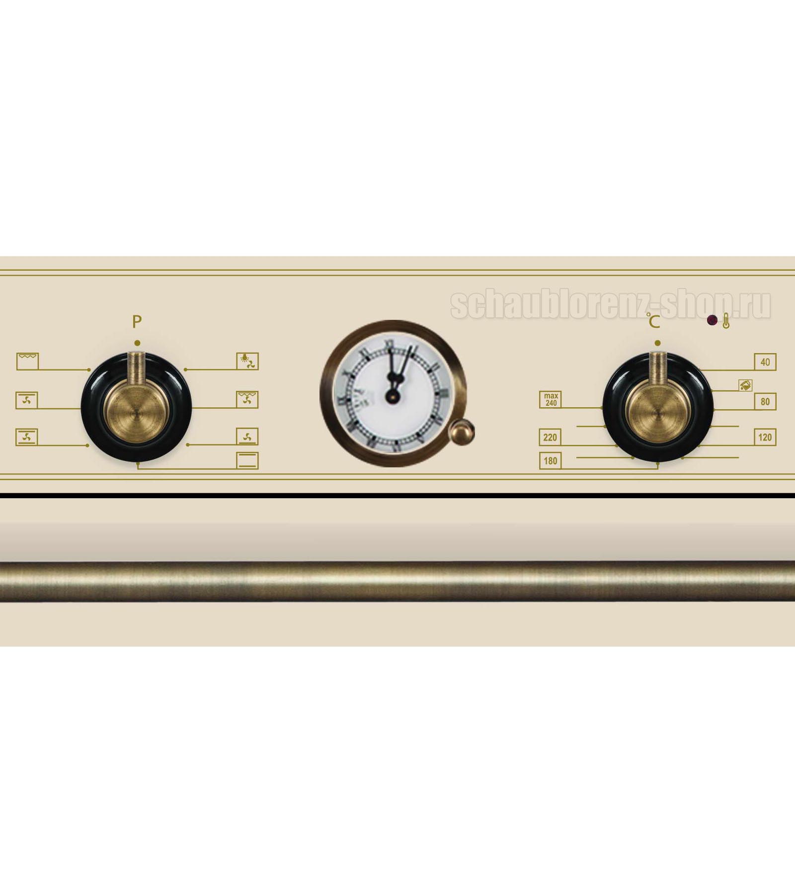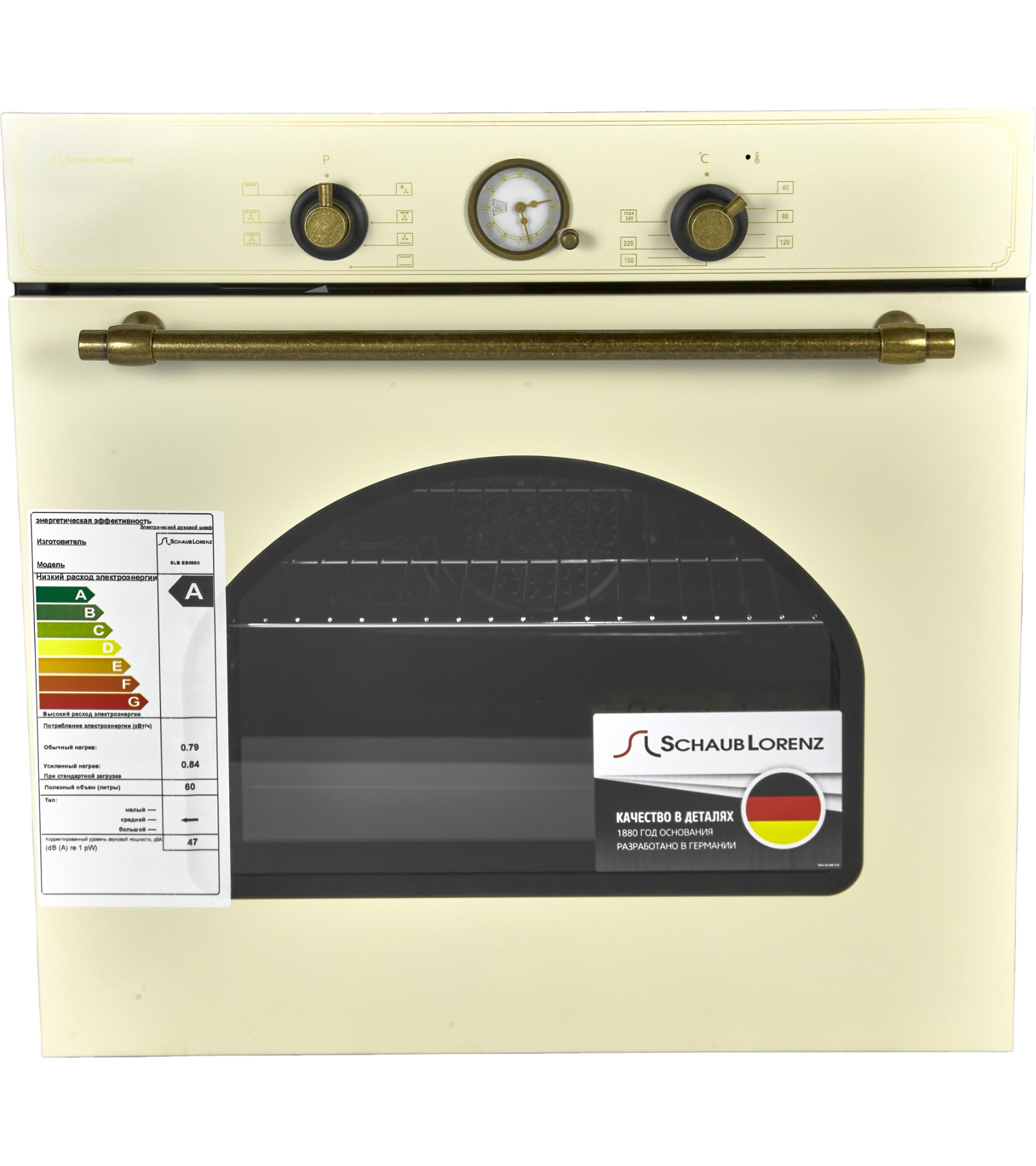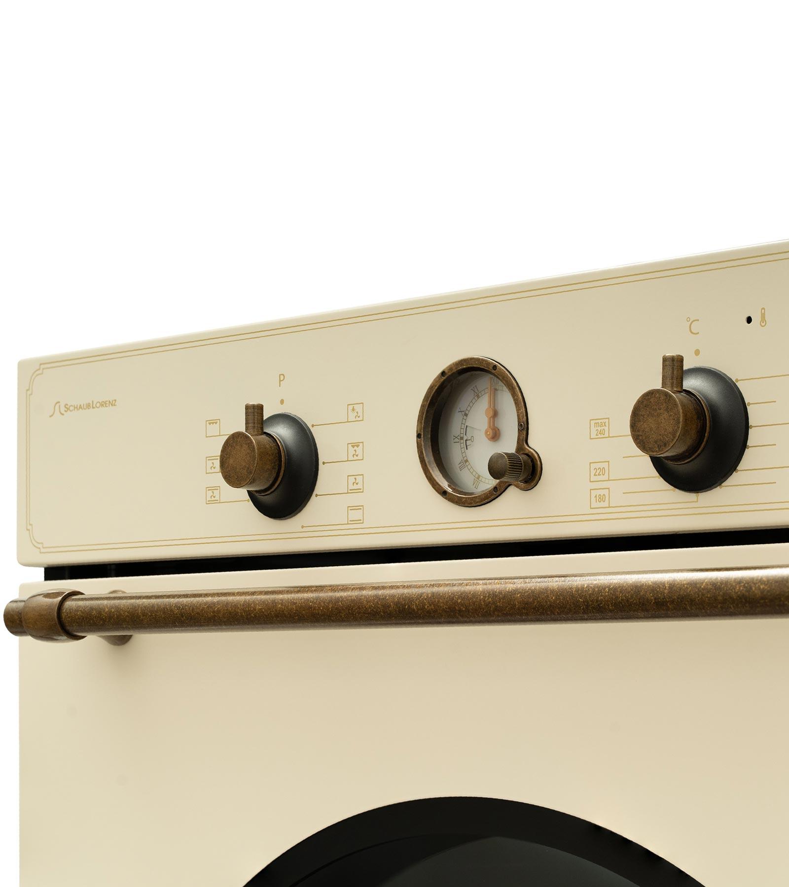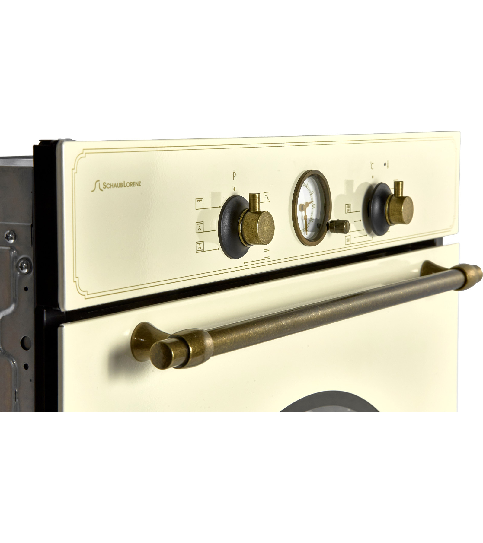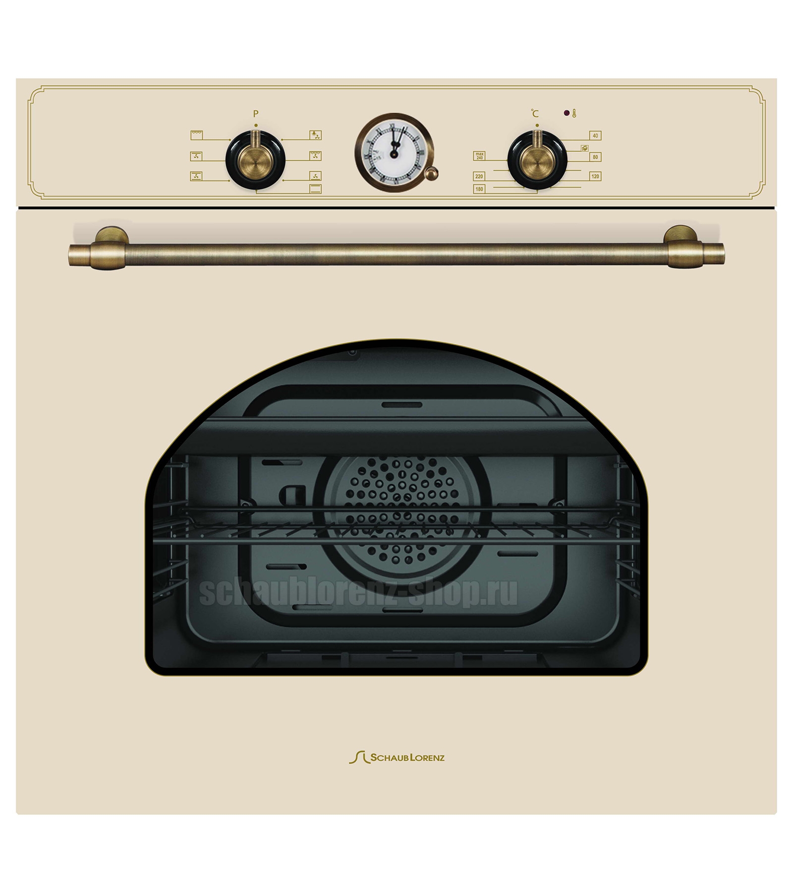 - ОписаниеМультифункциональный электрический духовой шкаф Schaub Lorenz SLB EB6860. Модель в ретро-дизайне со стеклом в форме отверстия традиционной дровяной печи дополнена латунной фурнитурой под старину, двумя поворотными переключателями и аналоговыми часами. Необычный стильный дизайн модели создаст особую атмосферу на вашей кухне.