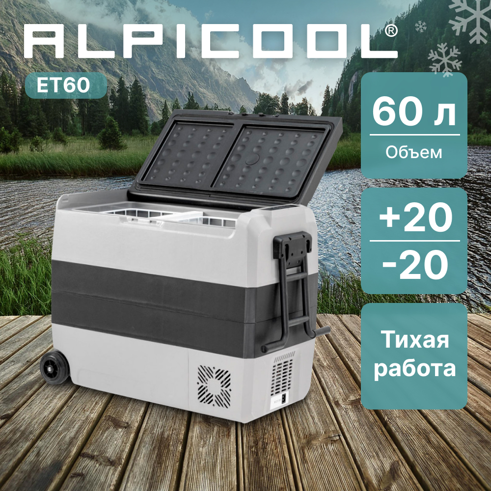 ОписаниеКомпрессорный автохолодильник Alpicool ET60 (12/24) Alpicool ET60 (12/24) - одна из моделей последнего поколения! Стильный и современный компрессорный автохолодильник с внутренним объемом 60 литров, работающий на безопасном и эффективном хладагенте R-134A. Внутреннее пространство данной модели представлено в виде просторного отсека, разделенного на две части, в каждой из которых Вы можете устанавливать необходимую температуру. Отсеки разделяет специальная перегородка, при изъятии которой, внутри холодильника образуется единый температурный режим. Вы можете с легкостью разместить достаточно большое количество продуктов и ёмкостей с напитками внутри каждого отделения. При открытии автохолодильника срабатывает датчик, за счет чего сразу же включается внутреннее освещение, равномерно распределяющее свет на оба отсека (даже при выключенном питании). Данная модель может работать в трех режимах: охлаждение, заморозка и глубокая заморозка. Охлаждение происходит по всем четырем внутренним стенкам отсека, за счет чего Вы можете не переживать за сохранение свежести содержимого – все продукты останутся в их первозданном виде.Обратите внимание, что температура в зоне компрессора должна устанавливаться либо такой же, либо ниже, чем во второй зоне. Рабочая температура автохолодильника может настраиваться и автоматически и поддерживаться в диапазоне от +20 °C до -20 °C. На дне морозильной камеры есть специальное сливное отверстие, закрытое герметичной пробкой. Эта приятная мелочь сделает процесс размораживания и мойки автохолодильника простым и удобным.Дополнительная внешняя батарея позволяет установке работать в автономном режиме. Эта функция крайне удобна в различных случаях, где невозможно произвести зарядку от сети электропитания, например, если Вы решили выбраться на природу – на пикник, рыбалку, отдых с палатками, и у Вас нет возможности находиться рядом с автомобилем, чтобы осуществить зарядку от прикуривателя. Внешняя батарея позволяет автохолодильнику работать без подзарядки около 7 часов. Внешний вид модели Alpicool ET60 (12/24) отвечает всем необходимым требованиям – автохолодильник выполнен в спокойной серой цветовой гамме и оснащён дисплеем повышенной яркости. Благодаря этому данная модель прекрасно подойдет под дизайн любого автомобиля, а показания на дисплее будут хорошо видны даже в солнечную погоду. Рядом с дисплеем находится удобная панель управления, на которой расположены: кнопка включения и выключения; кнопка настройки, с помощью которой можно установить экономичный или максимальный режим работы компрессора, а также один из трёх уровней защиты аккумулятора автомобиля от разрядки; кнопки "+" и "-" для повышения и понижения заданной температуры; разъём USB для питания и зарядки небольших устройств. Крышка ET60 – съемная. Это крайне удобная функция, поскольку благодаря ей, процесс извлечения/загрузки продуктов в автохолодильник становится куда более простым и быстрым. Поскольку данная модель относится к серии нового поколения, она оснащена большим количеством современных функций: USB-вход , благодаря которому Вы можете подсоединить какое-либо устройство к автохолодильнику, для его работы или осуществления подзарядки;два дисплея, каждый из которых показывает температуру, заданную в разных отсеках; максимальный угол накл