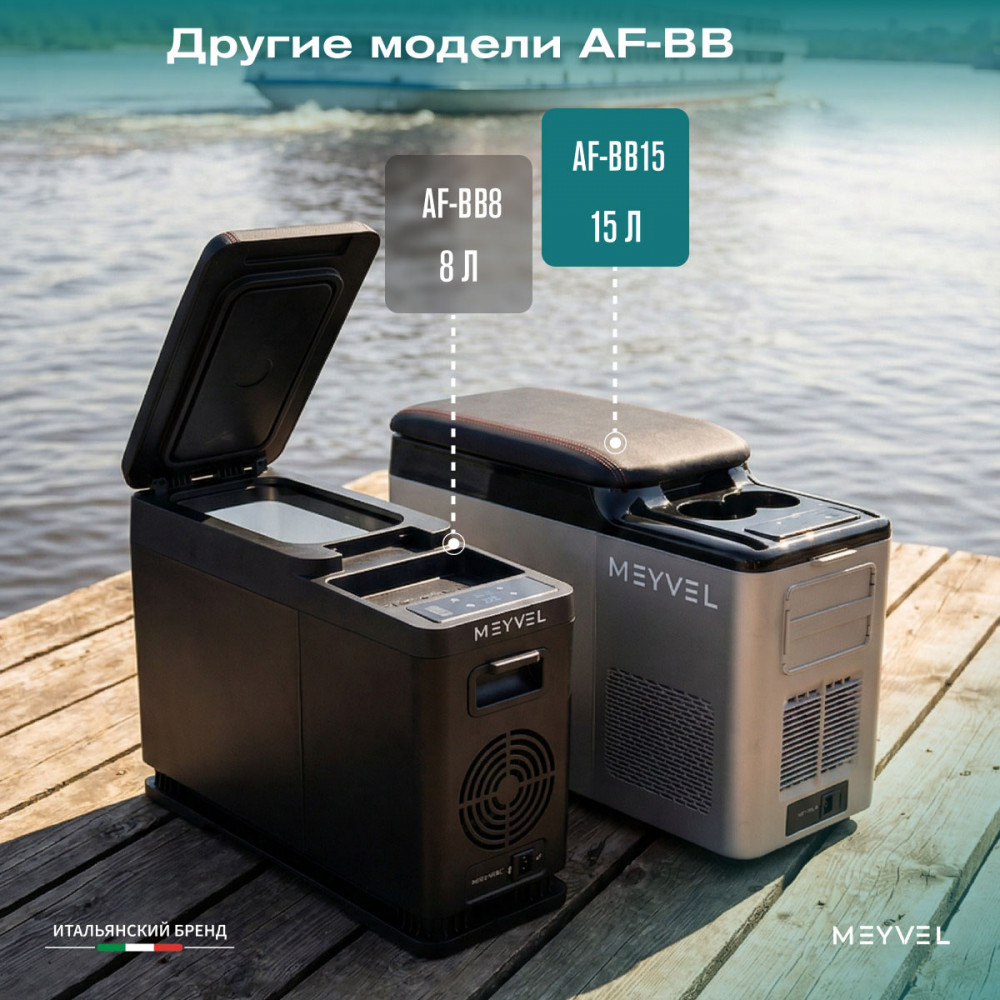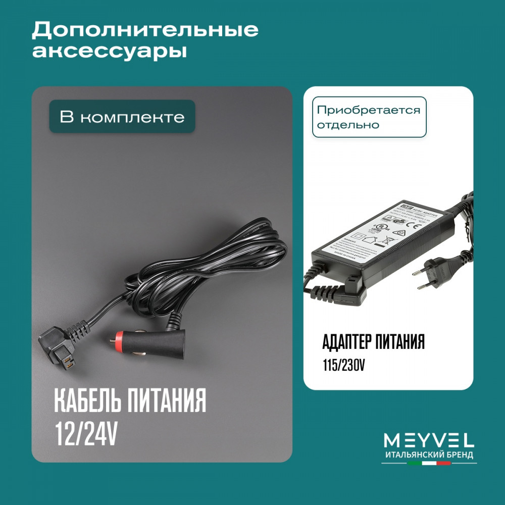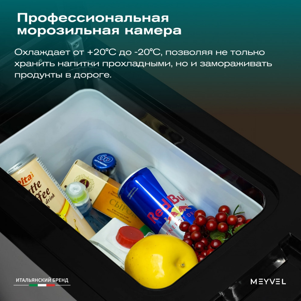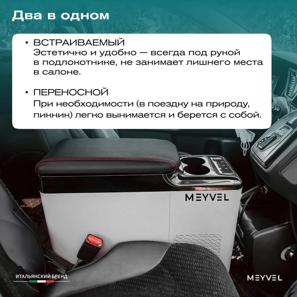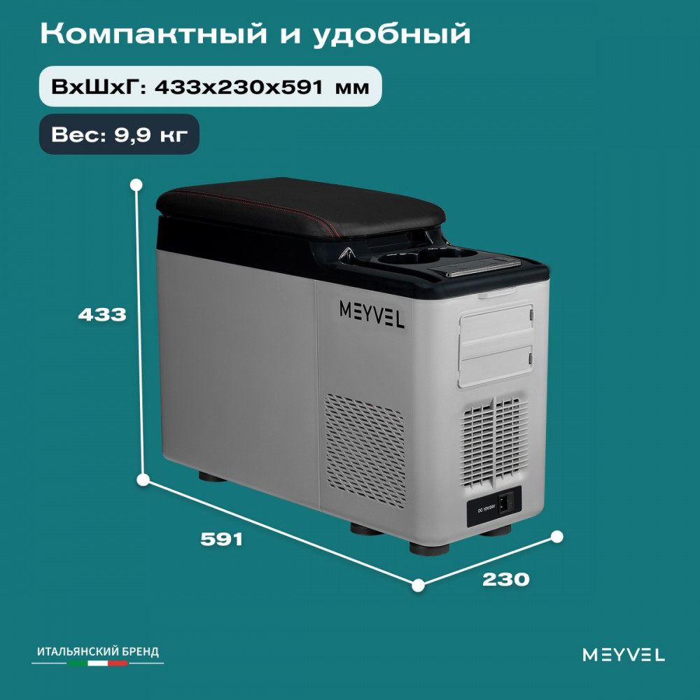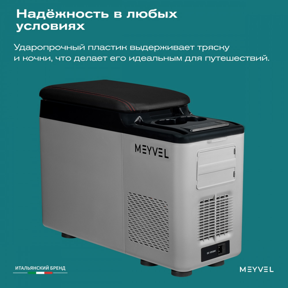 ОписаниеАвтохолодильник Meyvel AF-BB15 Итальянская компания MEYVEL была основана в Сицилии. Мы представляем инновационную продукцию, которая отлично подойдет для транспортировки и хранения любимых продуктов и напитков. Так же, благодаря использованию качественных комплектующих и высокотехнологичного производства, наши товары отличаются высокой конкурентоспособностью и отличным качеством. Автохолодильник AF-BB15 это самая компактная модель из всей линейки бренда Meyvel. Он предназначен для установки в качестве подлокотника в легковых автомобилях. Так же, он может устанавливаться в микроавтобусах, грузовиках, сельскохозяйственной и строительной технике, возле капитанской рубки на яхтах и катерах и конечно же в автодомах и кемперах возле места водителя. Холодильник с одной камерой и объёмом 15 литров работает от сети 12/24 В, а благодаря тихому современному компрессору с системой защиты от разгерметизации и с регулируемой скоростью вращения, Вы можете эффективно поддерживать нужную температуру продуктов и напитков, в дороге и на природе. Ключевыми техническими особенностями AF-BB15 являются: Увеличенный испаритель на всех внутренних стенках камеры, который способствует более равномерному распределению холодного воздуха и быстрому охлаждению; Память настроек - при внезапном отключении питания или недостаточном напряжении, во время повторного подключения холодильник возобновит работу с ранее заданными параметрами; Трехуровневая система защиты от разряда аккумулятора автомобиля; Защита компрессора от перегрева; Точный электронный термостат с возможностью корректировки и настройки; Дисплей повышенной яркости и высокое разрешение; Индикация ошибок на дисплее; Наличие установочного комплекта; Кроме того, данная модель имеет три режима работы: Стандартный - позволяет установить внутри холодильника нужную температуру; Турбо – дает возможность максимально быстро заморозить содержимое; Экономичный - устройство расходует меньше энергии, сохраняя свежесть продуктов. Так же, у данной модели присутствует функция для беспроводной зарядки телефонов и дополнительные USB-разъёмы на задней стороне холодильника. Холодильник имеет небольшой вес и может быстро сниматься с неподвижного крепления для перемещения из автомобиля в автомобиль. Для переноски в корпусе есть ручки, а для быстрого подключения холодильник укомплектован кабелем со штекером для прикуривателя. Крышка фиксируется магнитами и оборудована автодоводчиком для плавного закрытия. Экологически чистый хладагент, защищённый испаритель и эффективная изоляция обеспечат безопасную, долгую и надёжную работу автомобильного морозильника. Благодаря использованию качественных комплектующих и высокотехнологичному производству, все холодильники Meyvel обладают высокой эффективностью и надежностью. Дизайнеры и инженеры Meyvel позаботились о Вашем комфорте и разработали полностью русифицированное мобильное приложение MEYVEL CAR FRIDGE. Скачайте его бесплатно в App Store или Google Play Store и подключитесь к своему автохолодильнику Meyvel. Вы можете управлять устройством всего лишь одним касанием. Включайте и отключайте устройство, меняйте и настраивайте температурный режим прямо в дороге. Мы также предлагаем приобрести к данной модели: Адаптер для подключения автохолодильника к сети 220В чтобы Вы м