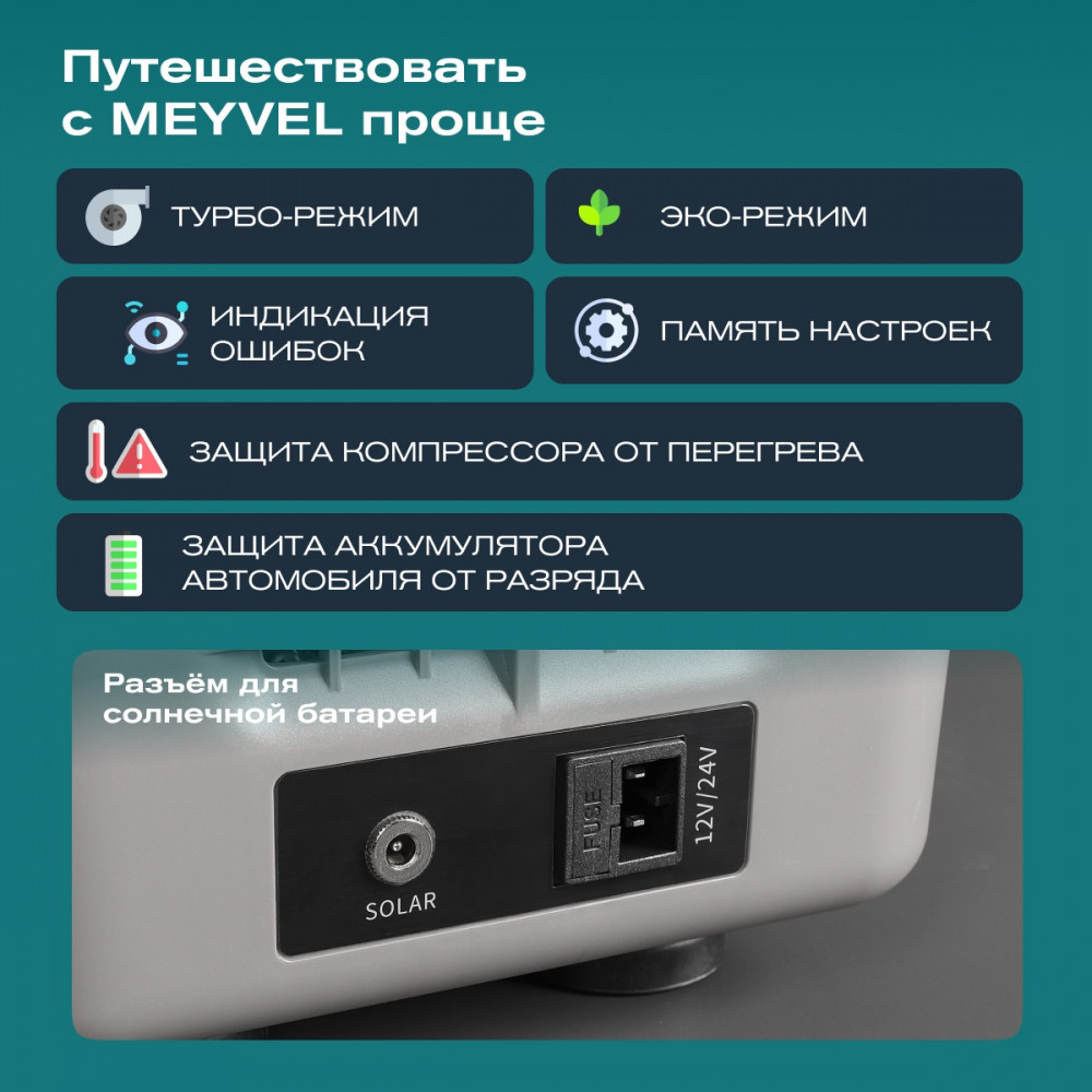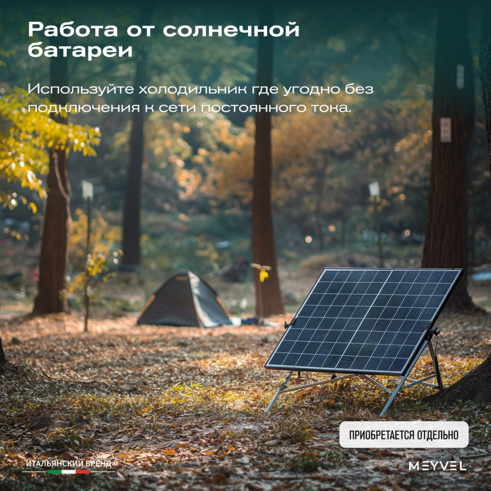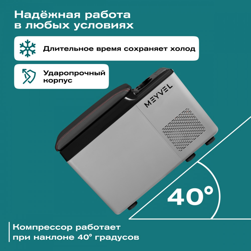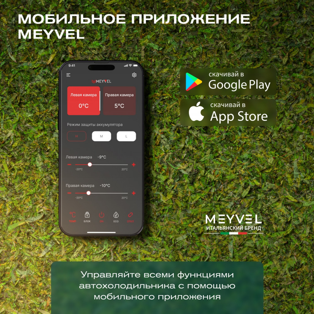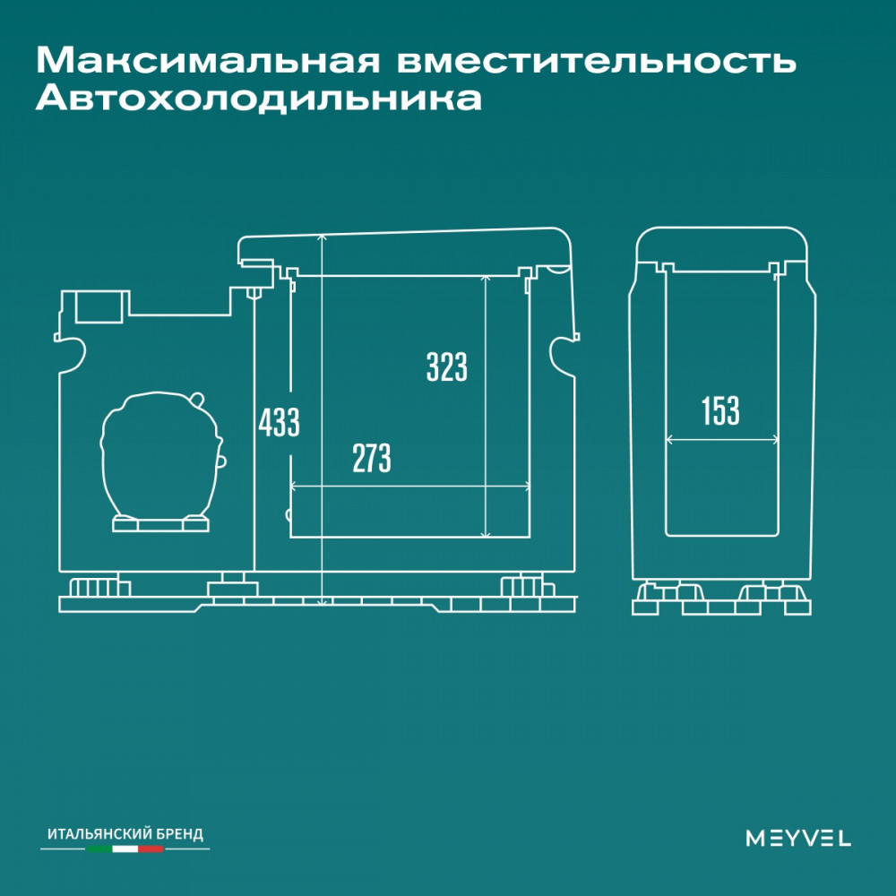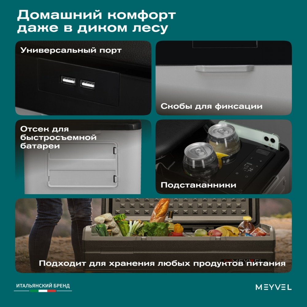 ОписаниеАвтохолодильник Meyvel AF-BB15 Итальянская компания MEYVEL была основана в Сицилии. Мы представляем инновационную продукцию, которая отлично подойдет для транспортировки и хранения любимых продуктов и напитков. Так же, благодаря использованию качественных комплектующих и высокотехнологичного производства, наши товары отличаются высокой конкурентоспособностью и отличным качеством. Автохолодильник AF-BB15 это самая компактная модель из всей линейки бренда Meyvel. Он предназначен для установки в качестве подлокотника в легковых автомобилях. Так же, он может устанавливаться в микроавтобусах, грузовиках, сельскохозяйственной и строительной технике, возле капитанской рубки на яхтах и катерах и конечно же в автодомах и кемперах возле места водителя. Холодильник с одной камерой и объёмом 15 литров работает от сети 12/24 В, а благодаря тихому современному компрессору с системой защиты от разгерметизации и с регулируемой скоростью вращения, Вы можете эффективно поддерживать нужную температуру продуктов и напитков, в дороге и на природе. Ключевыми техническими особенностями AF-BB15 являются: Увеличенный испаритель на всех внутренних стенках камеры, который способствует более равномерному распределению холодного воздуха и быстрому охлаждению; Память настроек - при внезапном отключении питания или недостаточном напряжении, во время повторного подключения холодильник возобновит работу с ранее заданными параметрами; Трехуровневая система защиты от разряда аккумулятора автомобиля; Защита компрессора от перегрева; Точный электронный термостат с возможностью корректировки и настройки; Дисплей повышенной яркости и высокое разрешение; Индикация ошибок на дисплее; Наличие установочного комплекта; Кроме того, данная модель имеет три режима работы: Стандартный - позволяет установить внутри холодильника нужную температуру; Турбо – дает возможность максимально быстро заморозить содержимое; Экономичный - устройство расходует меньше энергии, сохраняя свежесть продуктов. Так же, у данной модели присутствует функция для беспроводной зарядки телефонов и дополнительные USB-разъёмы на задней стороне холодильника. Холодильник имеет небольшой вес и может быстро сниматься с неподвижного крепления для перемещения из автомобиля в автомобиль. Для переноски в корпусе есть ручки, а для быстрого подключения холодильник укомплектован кабелем со штекером для прикуривателя. Крышка фиксируется магнитами и оборудована автодоводчиком для плавного закрытия. Экологически чистый хладагент, защищённый испаритель и эффективная изоляция обеспечат безопасную, долгую и надёжную работу автомобильного морозильника. Благодаря использованию качественных комплектующих и высокотехнологичному производству, все холодильники Meyvel обладают высокой эффективностью и надежностью. Дизайнеры и инженеры Meyvel позаботились о Вашем комфорте и разработали полностью русифицированное мобильное приложение MEYVEL CAR FRIDGE. Скачайте его бесплатно в App Store или Google Play Store и подключитесь к своему автохолодильнику Meyvel. Вы можете управлять устройством всего лишь одним касанием. Включайте и отключайте устройство, меняйте и настраивайте температурный режим прямо в дороге. Мы также предлагаем приобрести к данной модели: Адаптер для подключения автохолодильника к сети 220В чтобы Вы м