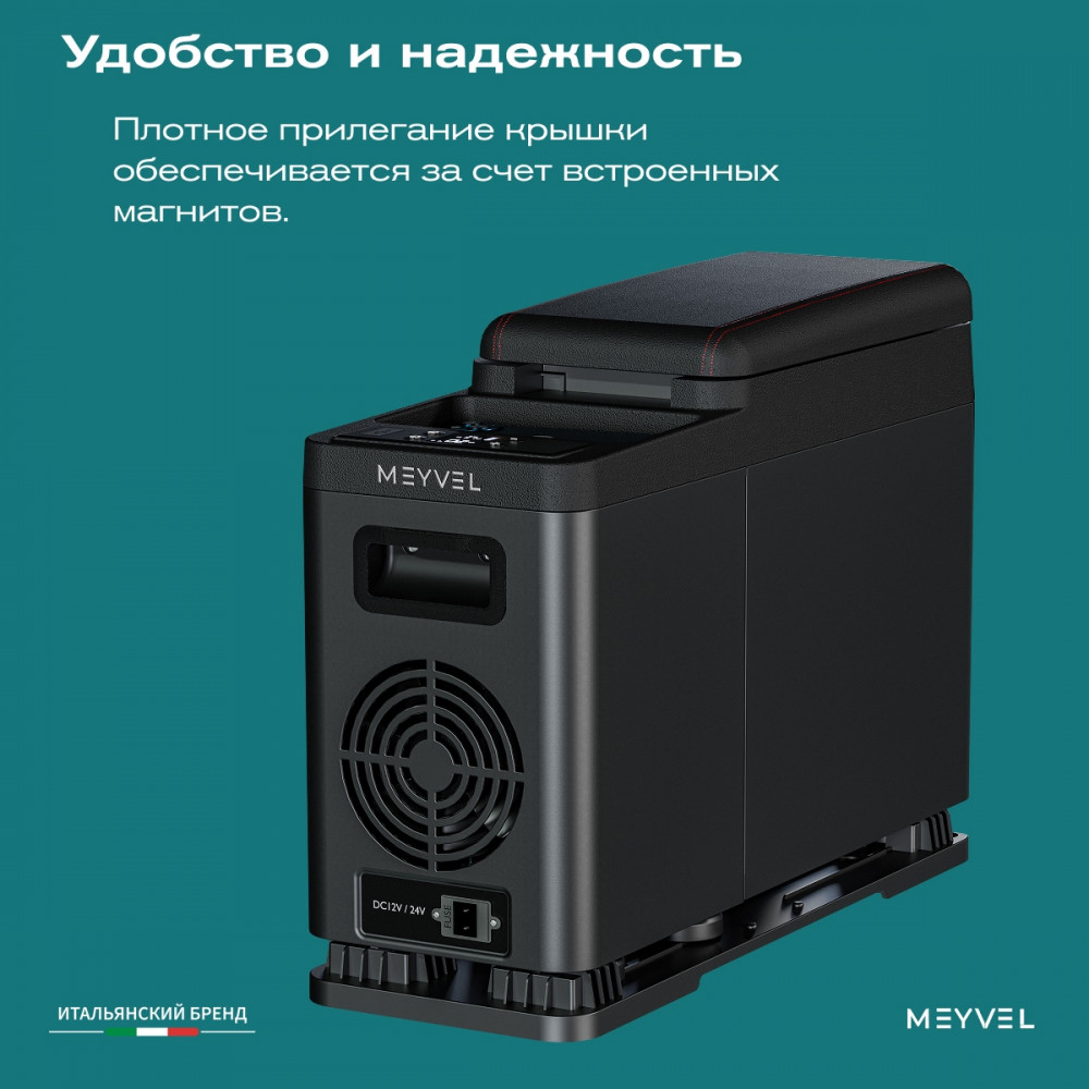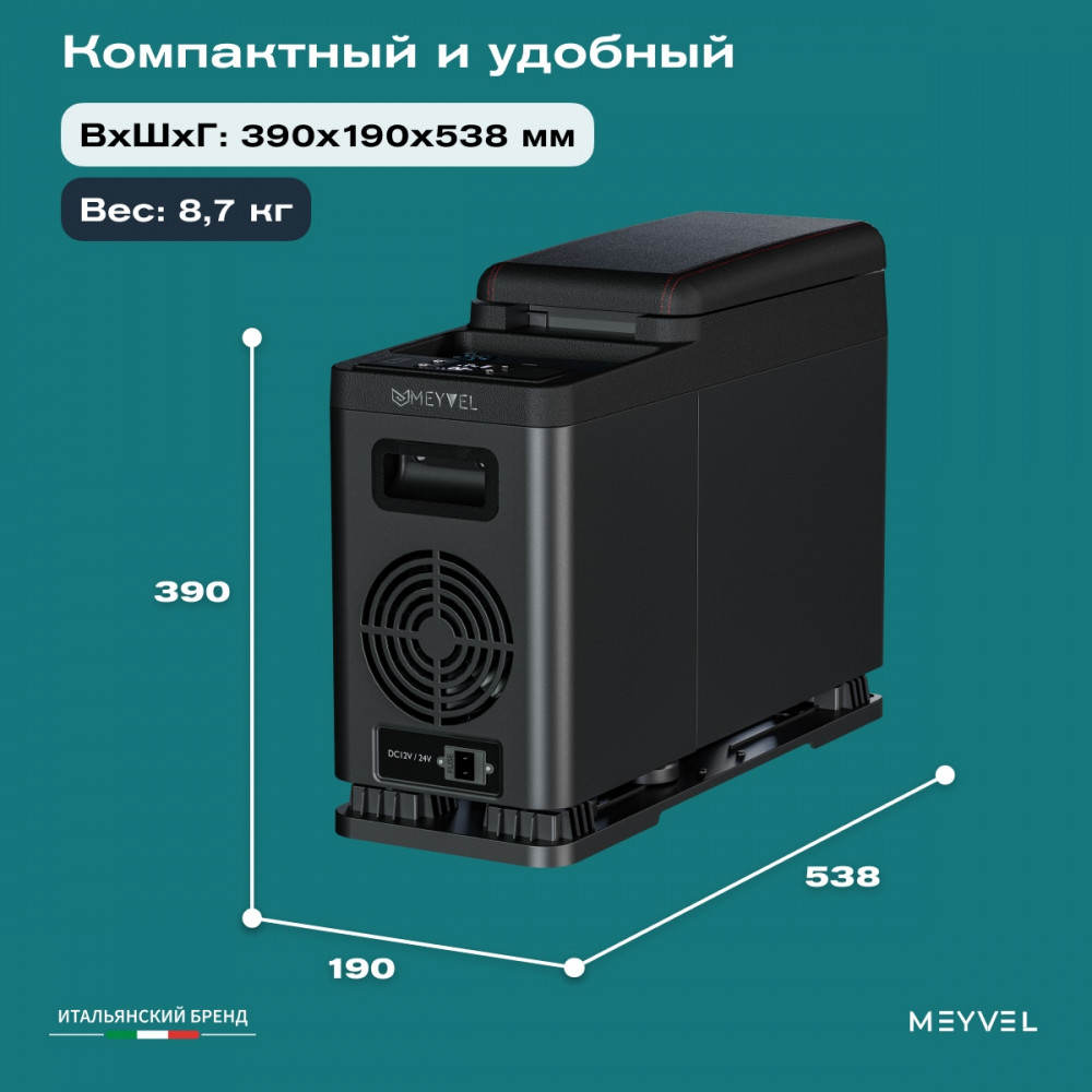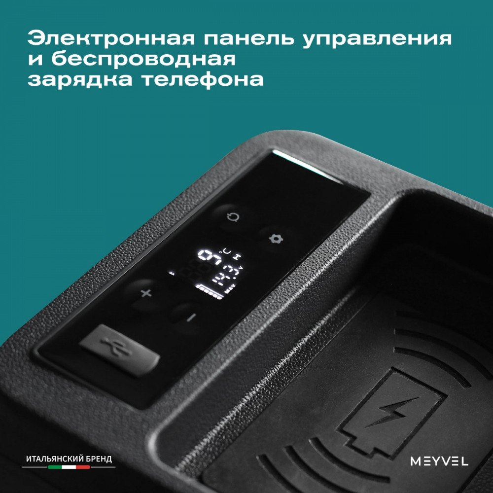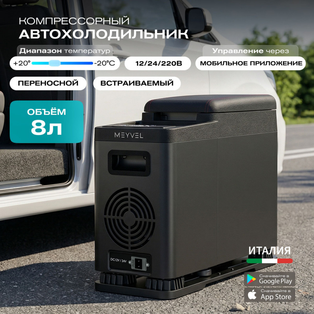 - ОписаниеАвтохолодильник Meyvel AF-BB8 Итальянская компания MEYVEL была основана в Сицилии. Мы представляем инновационную продукцию, которая отлично подойдет для транспортировки и хранения любимых продуктов и напитков. Так же, благодаря использованию качественных комплектующих и высокотехнологичного производства, наши товары отличаются высокой конкурентоспособностью и отличным качеством. Автохолодильник AF-BB8 это самая компактная модель из всей линейки бренда Meyvel. Он предназначен для установки в качестве подлокотника в легковых автомобилях. Так же, он может устанавливаться в микроавтобусах, грузовиках, сельскохозяйственной и строительной технике, возле капитанской рубки на яхтах и катерах и конечно же в автодомах и кемперах возле места водителя. Холодильник с одной камерой и объёмом 8 литров работает от сети 12/24 В, а благодаря тихому современному компрессору с системой защиты от разгерметизации и с регулируемой скоростью вращения, Вы можете эффективно поддерживать нужную температуру продуктов и напитков, в дороге и на природе. Ключевыми техническими особенностями AF-BB8 являются: Увеличенный испаритель на всех внутренних стенках камеры, который способствует более равномерному распределению холодного воздуха и быстрому охлаждению; Память настроек - при внезапном отключении питания или недостаточном напряжении, во время повторного подключения холодильник возобновит работу с ранее заданными параметрами; Трехуровневая система защиты от разряда аккумулятора автомобиля; Защита компрессора от перегрева; Точный электронный термостат с возможностью корректировки и настройки; Дисплей повышенной яркости и высокое разрешение; Индикация ошибок на дисплее; Наличие установочного комплекта; Кроме того, данная модель имеет три режима работы: Стандартный - позволяет установить внутри холодильника нужную температуру; Турбо – дает возможность максимально быстро заморозить содержимое; Экономичный - устройство расходует меньше энергии, сохраняя свежесть продуктов. Также, у данной модели присутствует функция для беспроводной зарядки телефонов и дополнительные разъёмы USB на задней стороне холодильника. Холодильник имеет небольшой вес и может быстро сниматься с неподвижного крепления для перемещения из автомобиля в автомобиль. Для переноски в корпусе есть ручки, а для быстрого подключения холодильник укомплектован кабелем со штекером для прикуривателя. Крышка фиксируется магнитами и оборудована автодоводчиком для плавного закрытия. Экологически чистый хладагент, защищённый испаритель и эффективная изоляция обеспечат безопасную, долгую и надёжную работу автомобильного морозильника. Благодаря использованию качественных комплектующих и высокотехнологичному производству, все холодильники Meyvel обладают высокой эффективностью и надежностью. Дизайнеры и инженеры Meyvel позаботились о Вашем комфорте и разработали полностью русифицированное мобильное приложение. Скачайте его бесплатно и подключитесь к своему автохолодильнику Meyvel. Вы можете управлять устройством всего лишь одним касанием. Включайте и отключайте устройство, меняйте и настраивайте температурный режим прямо в дороге. Мы также предлагаем приобрести к данной модели: Адаптер для подключения автохолодильника к сети 220В чтобы Вы могли максимально использовать в