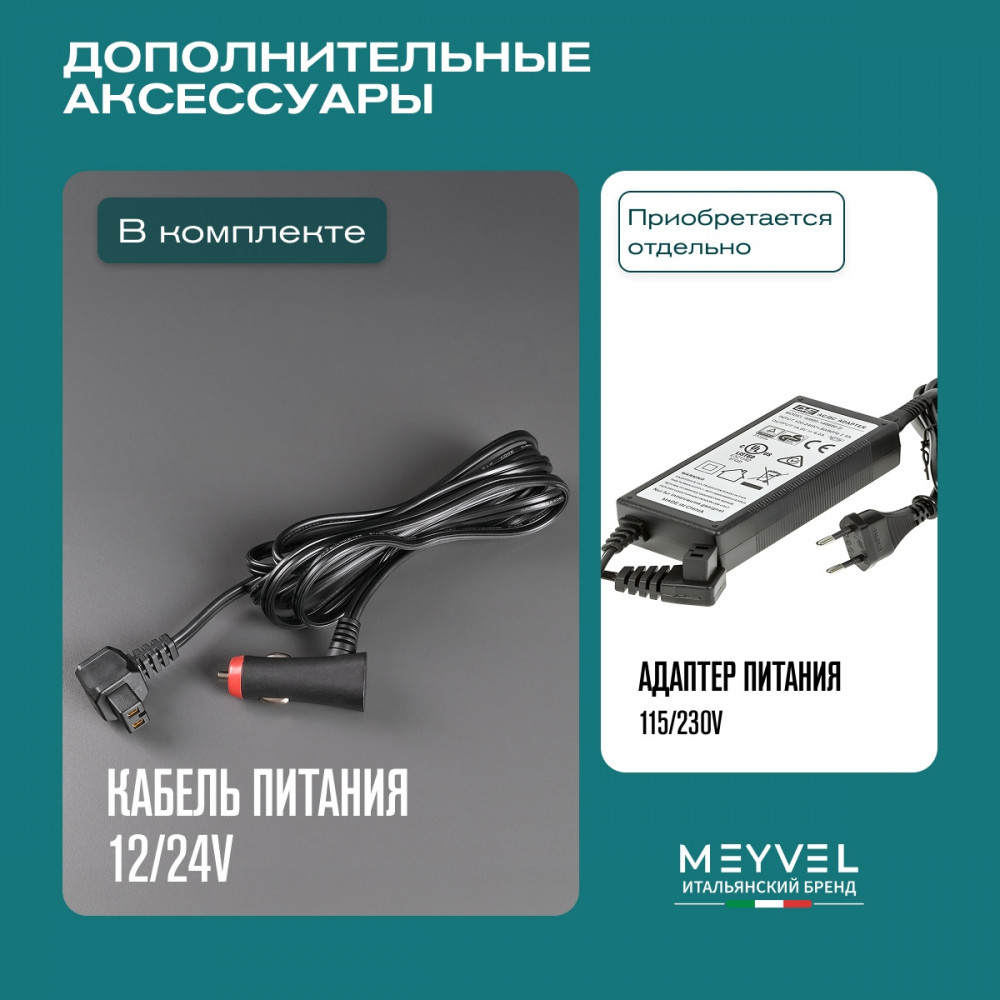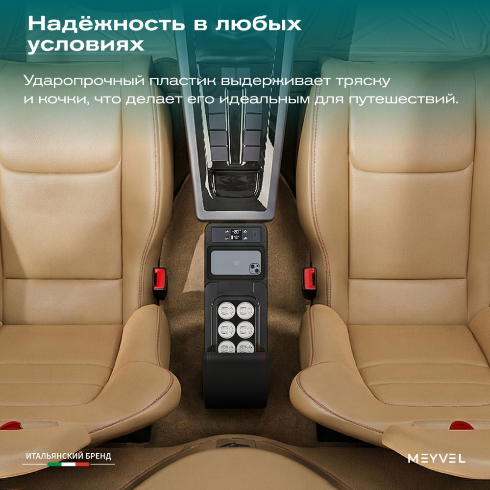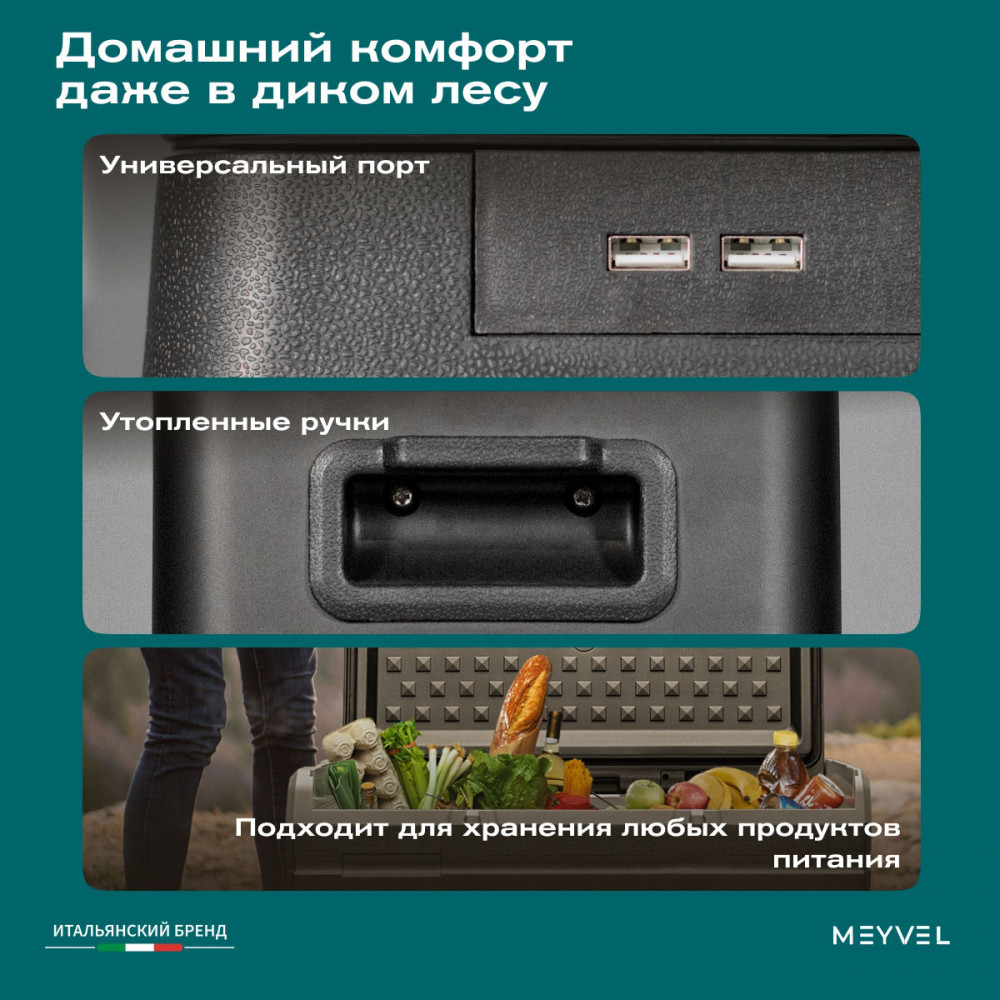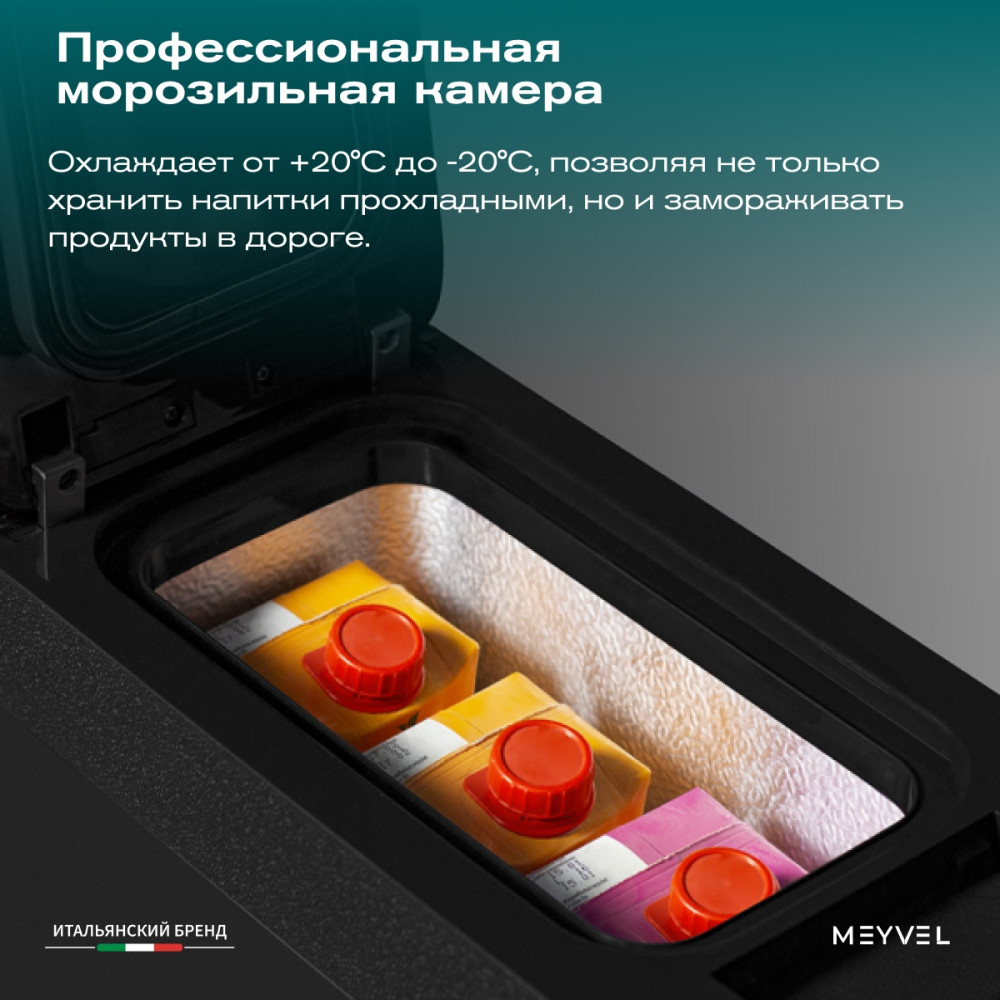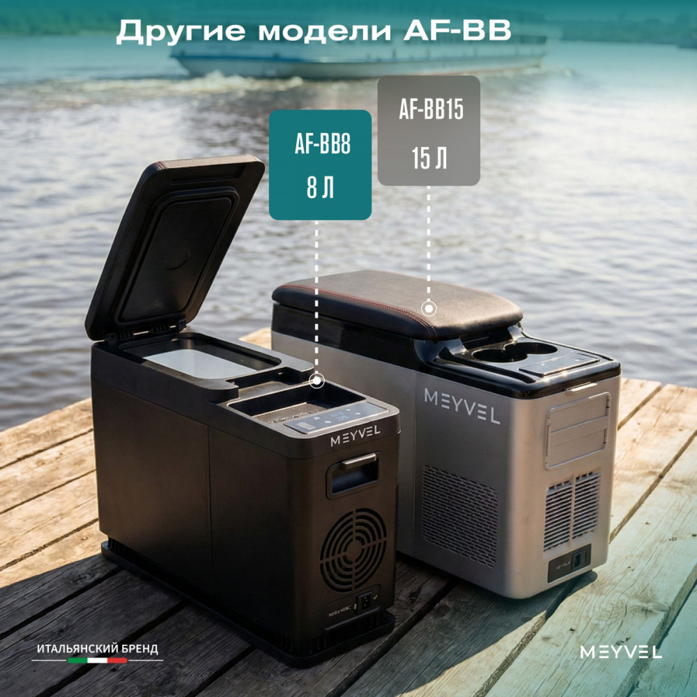 - ОписаниеАвтохолодильник Meyvel AF-BB8 Итальянская компания MEYVEL была основана в Сицилии. Мы представляем инновационную продукцию, которая отлично подойдет для транспортировки и хранения любимых продуктов и напитков. Так же, благодаря использованию качественных комплектующих и высокотехнологичного производства, наши товары отличаются высокой конкурентоспособностью и отличным качеством. Автохолодильник AF-BB8 это самая компактная модель из всей линейки бренда Meyvel. Он предназначен для установки в качестве подлокотника в легковых автомобилях. Так же, он может устанавливаться в микроавтобусах, грузовиках, сельскохозяйственной и строительной технике, возле капитанской рубки на яхтах и катерах и конечно же в автодомах и кемперах возле места водителя. Холодильник с одной камерой и объёмом 8 литров работает от сети 12/24 В, а благодаря тихому современному компрессору с системой защиты от разгерметизации и с регулируемой скоростью вращения, Вы можете эффективно поддерживать нужную температуру продуктов и напитков, в дороге и на природе. Ключевыми техническими особенностями AF-BB8 являются: Увеличенный испаритель на всех внутренних стенках камеры, который способствует более равномерному распределению холодного воздуха и быстрому охлаждению; Память настроек - при внезапном отключении питания или недостаточном напряжении, во время повторного подключения холодильник возобновит работу с ранее заданными параметрами; Трехуровневая система защиты от разряда аккумулятора автомобиля; Защита компрессора от перегрева; Точный электронный термостат с возможностью корректировки и настройки; Дисплей повышенной яркости и высокое разрешение; Индикация ошибок на дисплее; Наличие установочного комплекта; Кроме того, данная модель имеет три режима работы: Стандартный - позволяет установить внутри холодильника нужную температуру; Турбо – дает возможность максимально быстро заморозить содержимое; Экономичный - устройство расходует меньше энергии, сохраняя свежесть продуктов. Также, у данной модели присутствует функция для беспроводной зарядки телефонов и дополнительные разъёмы USB на задней стороне холодильника. Холодильник имеет небольшой вес и может быстро сниматься с неподвижного крепления для перемещения из автомобиля в автомобиль. Для переноски в корпусе есть ручки, а для быстрого подключения холодильник укомплектован кабелем со штекером для прикуривателя. Крышка фиксируется магнитами и оборудована автодоводчиком для плавного закрытия. Экологически чистый хладагент, защищённый испаритель и эффективная изоляция обеспечат безопасную, долгую и надёжную работу автомобильного морозильника. Благодаря использованию качественных комплектующих и высокотехнологичному производству, все холодильники Meyvel обладают высокой эффективностью и надежностью. Дизайнеры и инженеры Meyvel позаботились о Вашем комфорте и разработали полностью русифицированное мобильное приложение. Скачайте его бесплатно и подключитесь к своему автохолодильнику Meyvel. Вы можете управлять устройством всего лишь одним касанием. Включайте и отключайте устройство, меняйте и настраивайте температурный режим прямо в дороге. Мы также предлагаем приобрести к данной модели: Адаптер для подключения автохолодильника к сети 220В чтобы Вы могли максимально использовать в