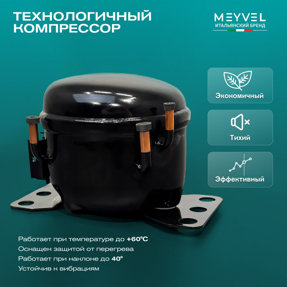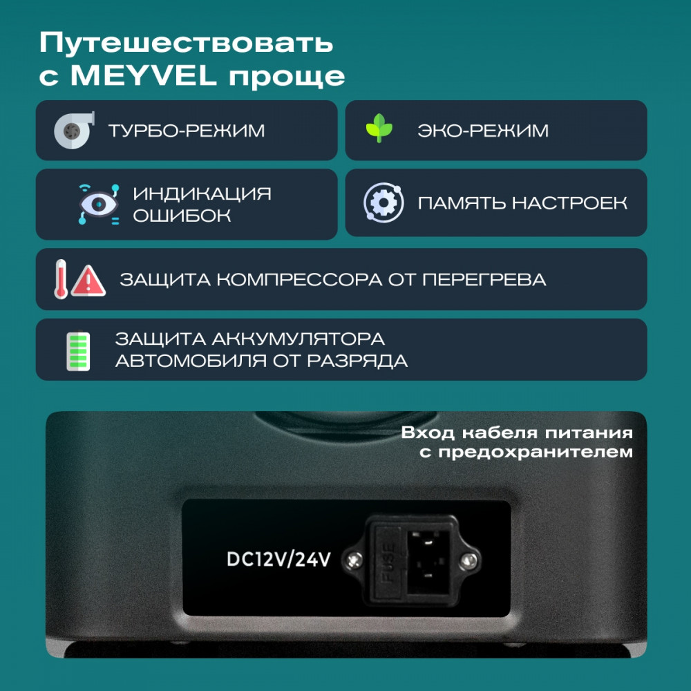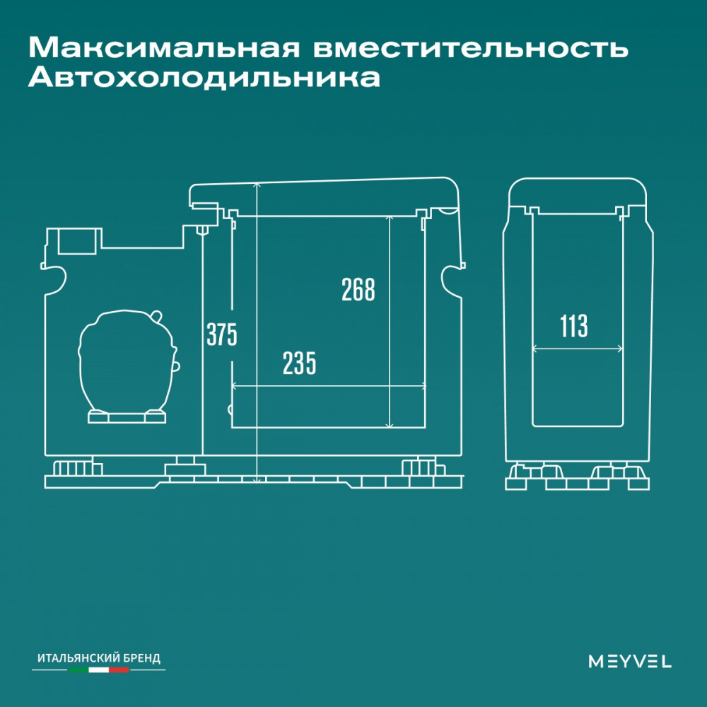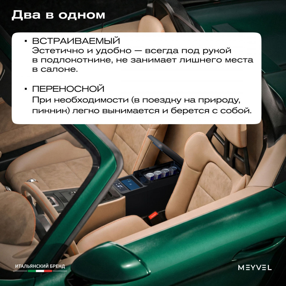 - ОписаниеАвтохолодильник Meyvel AF-BB8 Итальянская компания MEYVEL была основана в Сицилии. Мы представляем инновационную продукцию, которая отлично подойдет для транспортировки и хранения любимых продуктов и напитков. Так же, благодаря использованию качественных комплектующих и высокотехнологичного производства, наши товары отличаются высокой конкурентоспособностью и отличным качеством. Автохолодильник AF-BB8 это самая компактная модель из всей линейки бренда Meyvel. Он предназначен для установки в качестве подлокотника в легковых автомобилях. Так же, он может устанавливаться в микроавтобусах, грузовиках, сельскохозяйственной и строительной технике, возле капитанской рубки на яхтах и катерах и конечно же в автодомах и кемперах возле места водителя. Холодильник с одной камерой и объёмом 8 литров работает от сети 12/24 В, а благодаря тихому современному компрессору с системой защиты от разгерметизации и с регулируемой скоростью вращения, Вы можете эффективно поддерживать нужную температуру продуктов и напитков, в дороге и на природе. Ключевыми техническими особенностями AF-BB8 являются: Увеличенный испаритель на всех внутренних стенках камеры, который способствует более равномерному распределению холодного воздуха и быстрому охлаждению; Память настроек - при внезапном отключении питания или недостаточном напряжении, во время повторного подключения холодильник возобновит работу с ранее заданными параметрами; Трехуровневая система защиты от разряда аккумулятора автомобиля; Защита компрессора от перегрева; Точный электронный термостат с возможностью корректировки и настройки; Дисплей повышенной яркости и высокое разрешение; Индикация ошибок на дисплее; Наличие установочного комплекта; Кроме того, данная модель имеет три режима работы: Стандартный - позволяет установить внутри холодильника нужную температуру; Турбо – дает возможность максимально быстро заморозить содержимое; Экономичный - устройство расходует меньше энергии, сохраняя свежесть продуктов. Также, у данной модели присутствует функция для беспроводной зарядки телефонов и дополнительные разъёмы USB на задней стороне холодильника. Холодильник имеет небольшой вес и может быстро сниматься с неподвижного крепления для перемещения из автомобиля в автомобиль. Для переноски в корпусе есть ручки, а для быстрого подключения холодильник укомплектован кабелем со штекером для прикуривателя. Крышка фиксируется магнитами и оборудована автодоводчиком для плавного закрытия. Экологически чистый хладагент, защищённый испаритель и эффективная изоляция обеспечат безопасную, долгую и надёжную работу автомобильного морозильника. Благодаря использованию качественных комплектующих и высокотехнологичному производству, все холодильники Meyvel обладают высокой эффективностью и надежностью. Дизайнеры и инженеры Meyvel позаботились о Вашем комфорте и разработали полностью русифицированное мобильное приложение. Скачайте его бесплатно и подключитесь к своему автохолодильнику Meyvel. Вы можете управлять устройством всего лишь одним касанием. Включайте и отключайте устройство, меняйте и настраивайте температурный режим прямо в дороге. Мы также предлагаем приобрести к данной модели: Адаптер для подключения автохолодильника к сети 220В чтобы Вы могли максимально использовать в