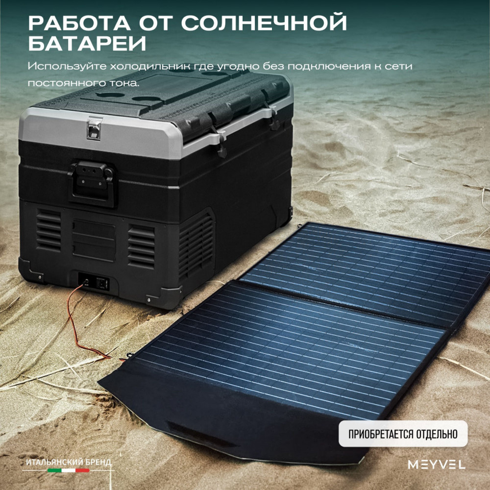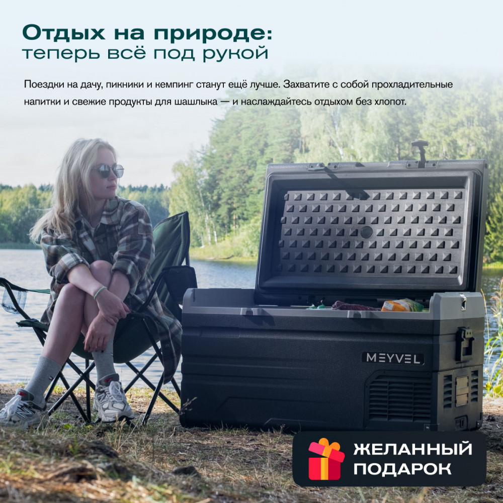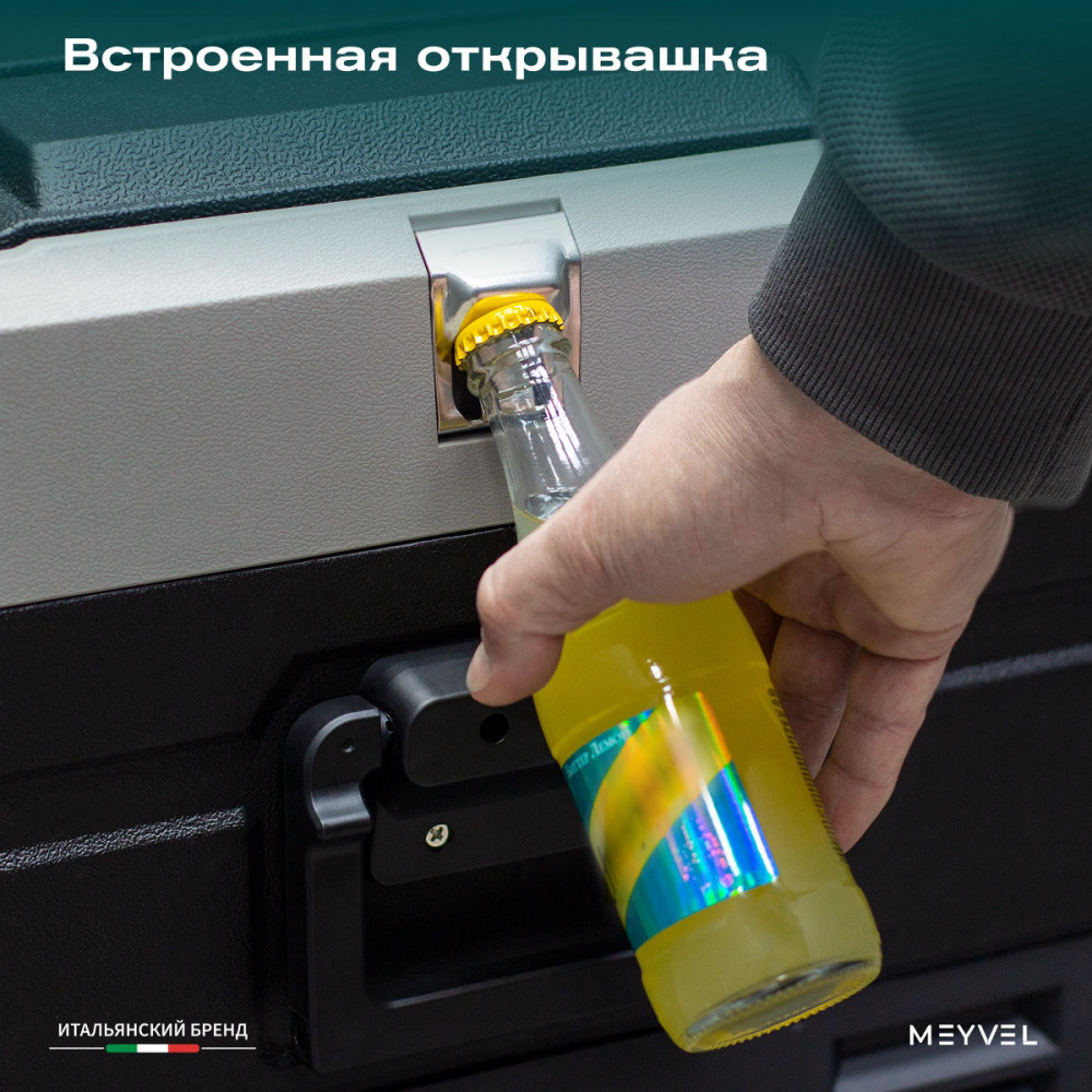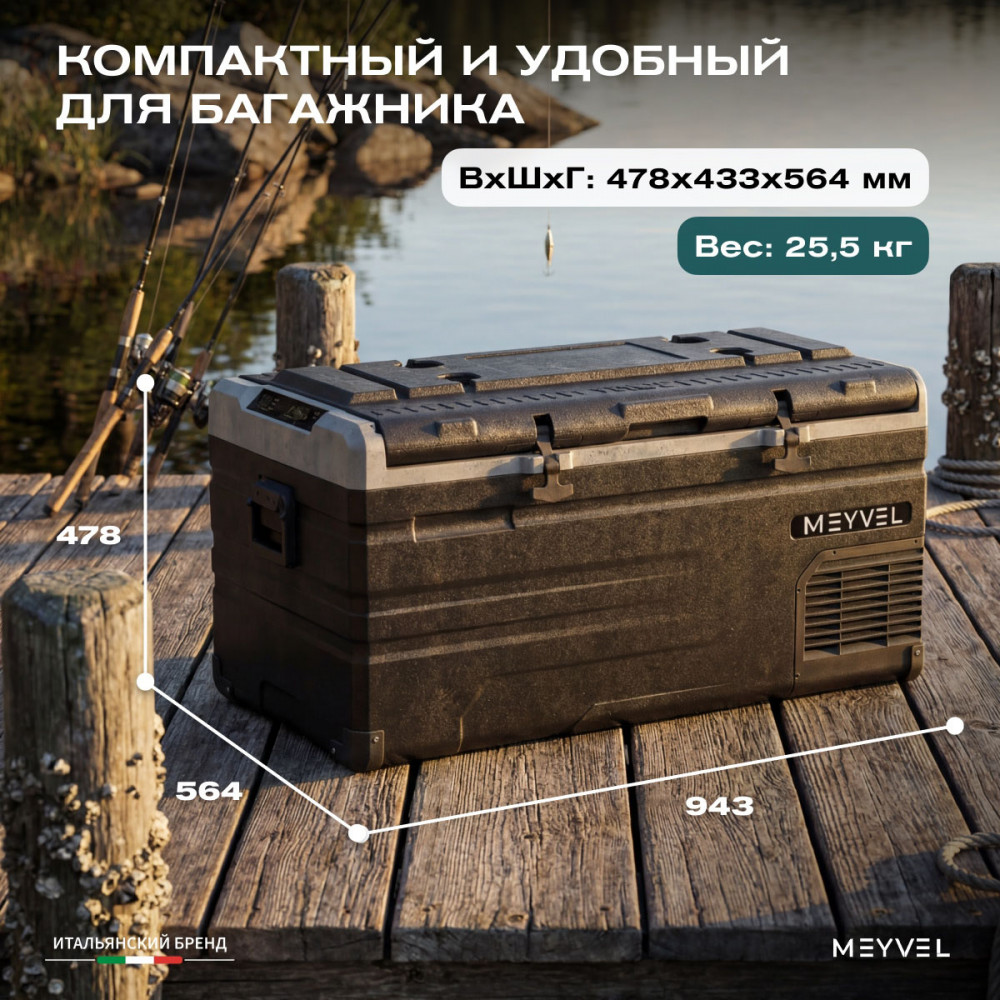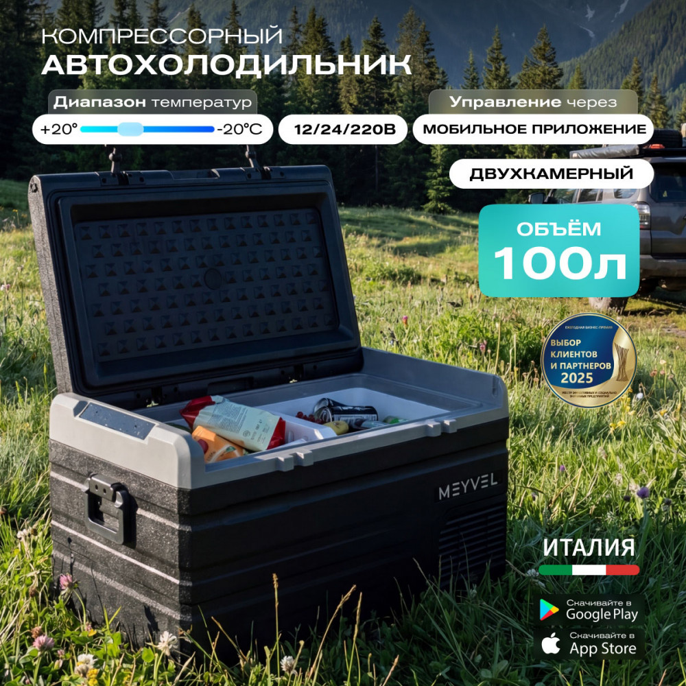 ОписаниеКомпрессорный автохолодильник Meyvel AF-H100DD Итальянская компания MEYVEL разработала инновационную модель автомобильного холодильника AF-H100DD, который отлично подойдет для транспортировки и хранения любимых продуктов и напитков. Автомобильный холодильник Meyvel AF-H100DD имеет большую вместимость и отлично подойдет как для совместных путешествий в кругу семьи, так и для профессиональных охотников и рыболовов. Оснащён тихим высокопроизводительным компрессором, работающим от напряжения 12/24 B, с системой защиты от разгерметизации. Благодаря оптимизированному программному обеспечению и регулируемой скорости вращения, Вы можете эффективно поддерживать нужную температуру в дороге и на природе. Автохолодильник-трансформер Модель Meyvel AF-H100DD оснащена внутренней съёмной перегородкой. При установленной перегородке холодильник делится на два отделения, с возможностью настройки разной температуры, в каждом из них. Настройка температуры осуществляется с помощью сенсорной панели управления или мобильного приложения, с отображением температуры в каждом отделении. При снятой перегородке, холодильник становится однокамерным и на дисплее, отображается общая внутренняя температура. Удобство и многофункциональность. Модель укомплектована многофункциональной дверью-крышкой, дизайн которой даёт возможность использовать её в качестве стола, ставить до четырёх стаканов с напитками в специальные подстаканники. Так же в крышке автохолодильника есть специальные углубления для установки телефонов и планшетов. Любителей рыбалки несомненно порадует наличие на крышке линейки для измерения улова или других трофеев. В качестве бонуса, на корпусе встроена открывалка для бутылок. Благодаря перечисленным особенностям, холодильник идеально подходит для отдыха на природе. Крышка имеет возможность открытия с любой стороны, без специальной перестановки, достаточно освободить резиновые фиксаторы с нужной стороны. Так же её можно полностью снять. Боковые ручки обеспечивают лёгкое и удобное перемещение холодильника. Управление всеми функциями через сенсорную панель управления или через смартфон Сенсорная панель управления имеет дисплей, с отображение всех изменяемых параметров. Дизайнеры и инженеры Meyvel позаботились о Вашем комфорте и разработали мобильное приложение, благодаря которому Вы можете управлять холодильником всего лишь одним касанием. Включайте и отключайте автомобильный холодильник, меняйте и настраивайте температурный режим прямо в дороге. Теперь, когда управление авто холодильником стало простым и понятным, Вам и Вашим близким остается лишь наслаждаться путешествием. Автохолодильник для путешествий Эта модель подходит для установки не только в легковые автомобили, но и в грузовые, а так же микроавтобусы, катера, автодома и кемперы. Питание осуществляется от прикуривателя (12 или 24 В). Благодаря оптимизированному программному обеспечению и регулируемой скорости вращения, Вы можете эффективно поддерживать нужную температуру продуктов и напитков в дороге и на природе. Испаритель располагается на всех четырёх сторонах корпуса и благодаря этому, охлаждение происходит максимально быстро и равномерно. Преимущества автохолодильника AF-H100DD: Трансформируемое внутреннее пространство (1 или 2 камеры); Управление через Android/iOS; 
