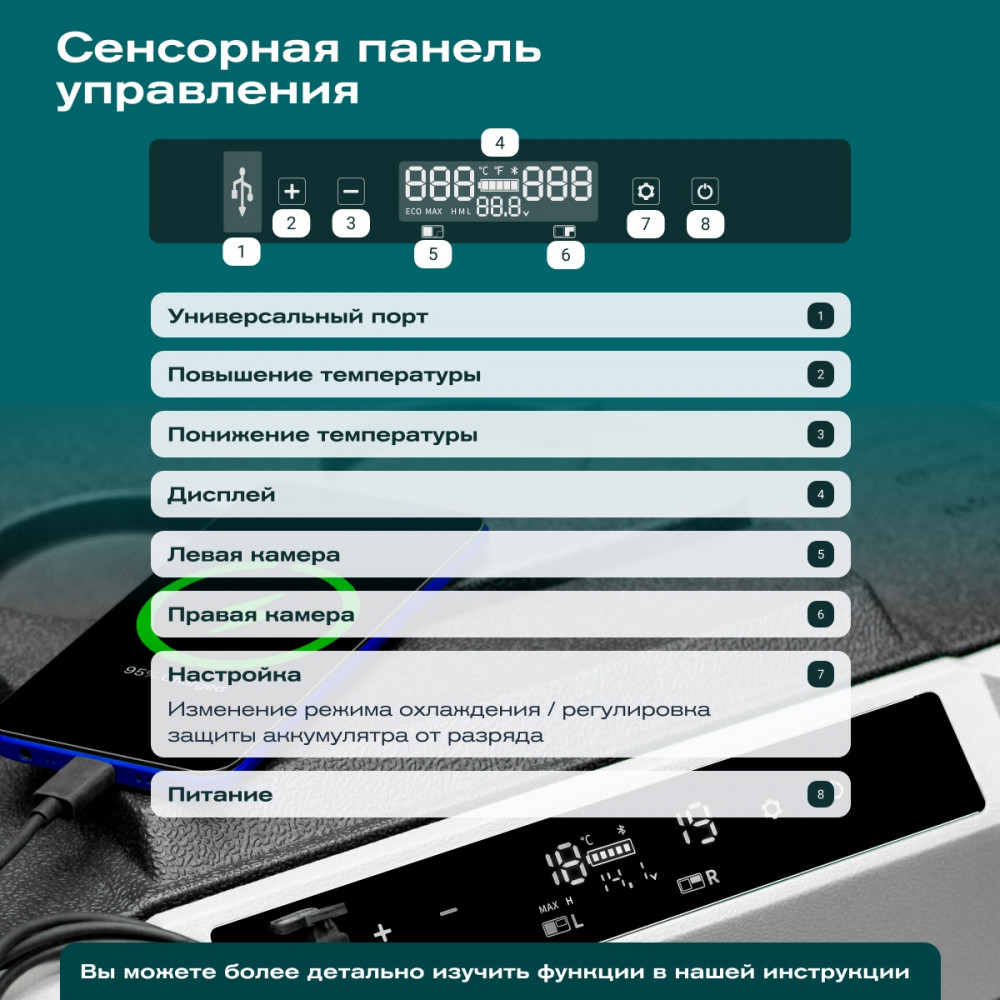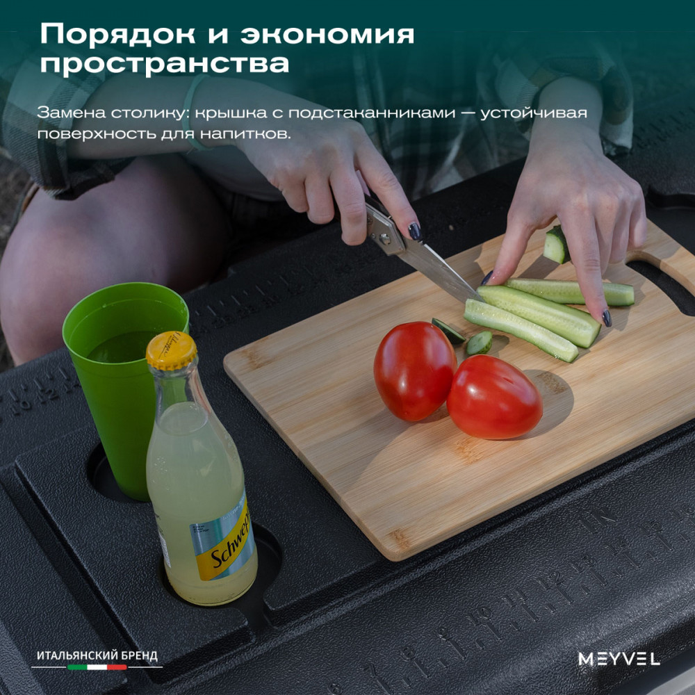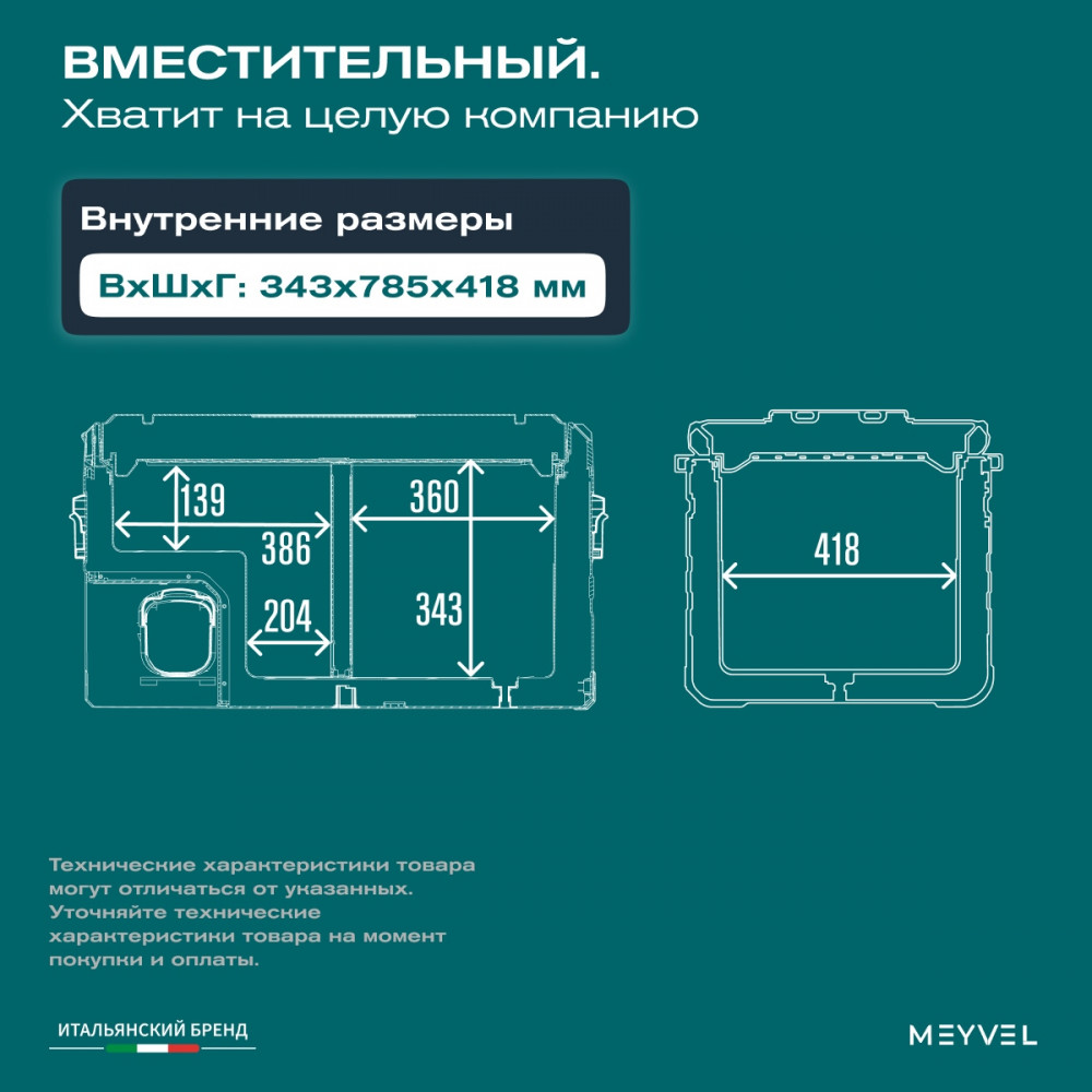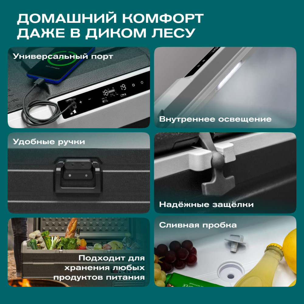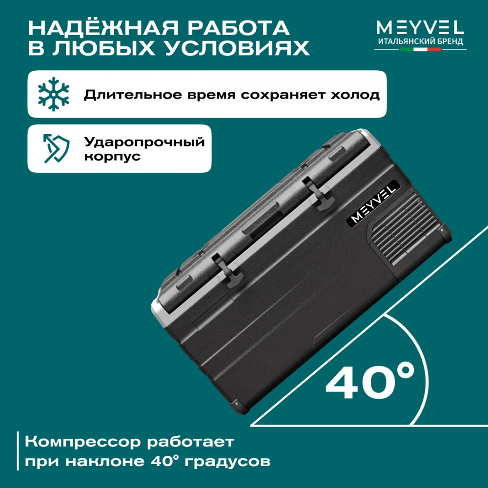 ОписаниеКомпрессорный автохолодильник Meyvel AF-H100DD Итальянская компания MEYVEL разработала инновационную модель автомобильного холодильника AF-H100DD, который отлично подойдет для транспортировки и хранения любимых продуктов и напитков. Автомобильный холодильник Meyvel AF-H100DD имеет большую вместимость и отлично подойдет как для совместных путешествий в кругу семьи, так и для профессиональных охотников и рыболовов. Оснащён тихим высокопроизводительным компрессором, работающим от напряжения 12/24 B, с системой защиты от разгерметизации. Благодаря оптимизированному программному обеспечению и регулируемой скорости вращения, Вы можете эффективно поддерживать нужную температуру в дороге и на природе. Автохолодильник-трансформер Модель Meyvel AF-H100DD оснащена внутренней съёмной перегородкой. При установленной перегородке холодильник делится на два отделения, с возможностью настройки разной температуры, в каждом из них. Настройка температуры осуществляется с помощью сенсорной панели управления или мобильного приложения, с отображением температуры в каждом отделении. При снятой перегородке, холодильник становится однокамерным и на дисплее, отображается общая внутренняя температура. Удобство и многофункциональность. Модель укомплектована многофункциональной дверью-крышкой, дизайн которой даёт возможность использовать её в качестве стола, ставить до четырёх стаканов с напитками в специальные подстаканники. Так же в крышке автохолодильника есть специальные углубления для установки телефонов и планшетов. Любителей рыбалки несомненно порадует наличие на крышке линейки для измерения улова или других трофеев. В качестве бонуса, на корпусе встроена открывалка для бутылок. Благодаря перечисленным особенностям, холодильник идеально подходит для отдыха на природе. Крышка имеет возможность открытия с любой стороны, без специальной перестановки, достаточно освободить резиновые фиксаторы с нужной стороны. Так же её можно полностью снять. Боковые ручки обеспечивают лёгкое и удобное перемещение холодильника. Управление всеми функциями через сенсорную панель управления или через смартфон Сенсорная панель управления имеет дисплей, с отображение всех изменяемых параметров. Дизайнеры и инженеры Meyvel позаботились о Вашем комфорте и разработали мобильное приложение, благодаря которому Вы можете управлять холодильником всего лишь одним касанием. Включайте и отключайте автомобильный холодильник, меняйте и настраивайте температурный режим прямо в дороге. Теперь, когда управление авто холодильником стало простым и понятным, Вам и Вашим близким остается лишь наслаждаться путешествием. Автохолодильник для путешествий Эта модель подходит для установки не только в легковые автомобили, но и в грузовые, а так же микроавтобусы, катера, автодома и кемперы. Питание осуществляется от прикуривателя (12 или 24 В). Благодаря оптимизированному программному обеспечению и регулируемой скорости вращения, Вы можете эффективно поддерживать нужную температуру продуктов и напитков в дороге и на природе. Испаритель располагается на всех четырёх сторонах корпуса и благодаря этому, охлаждение происходит максимально быстро и равномерно. Преимущества автохолодильника AF-H100DD: Трансформируемое внутреннее пространство (1 или 2 камеры); Управление через Android/iOS; 