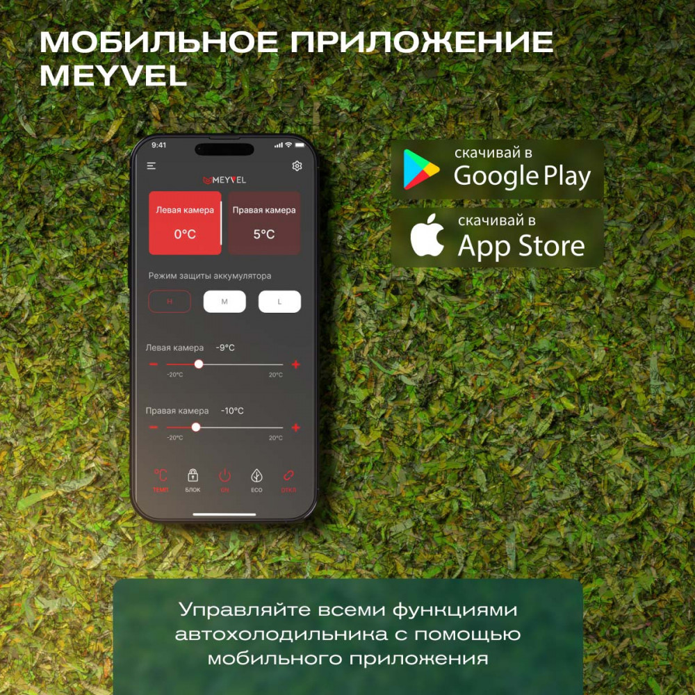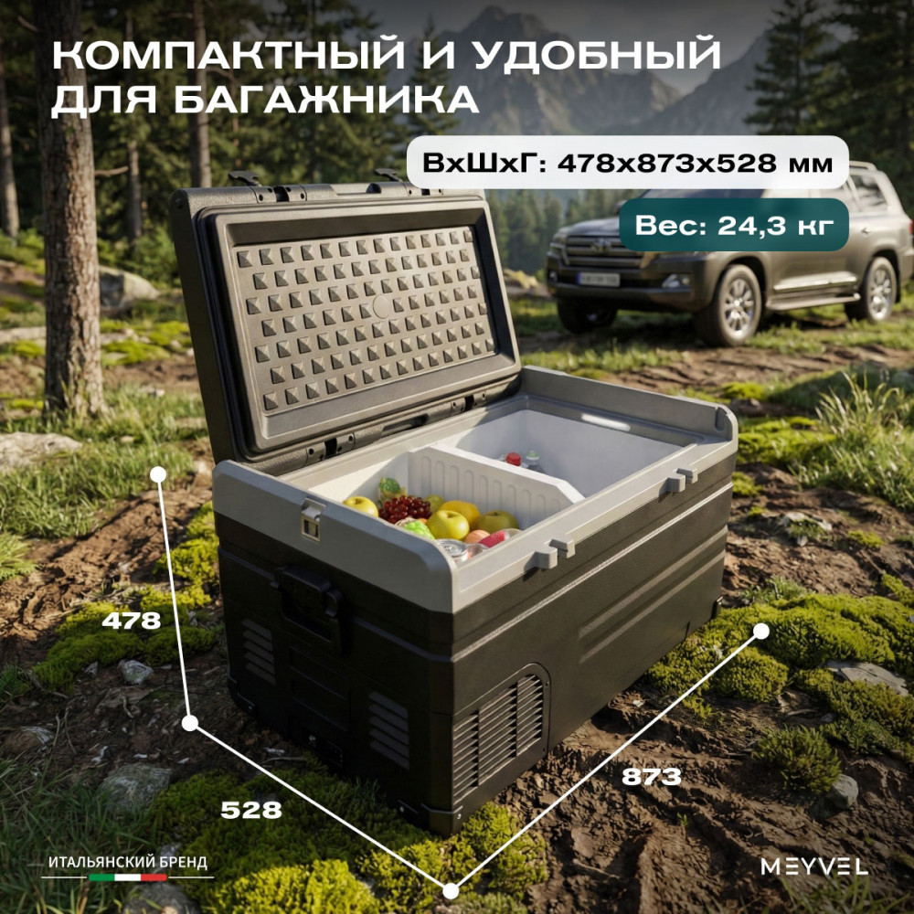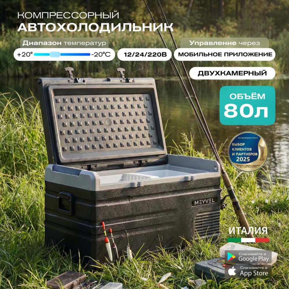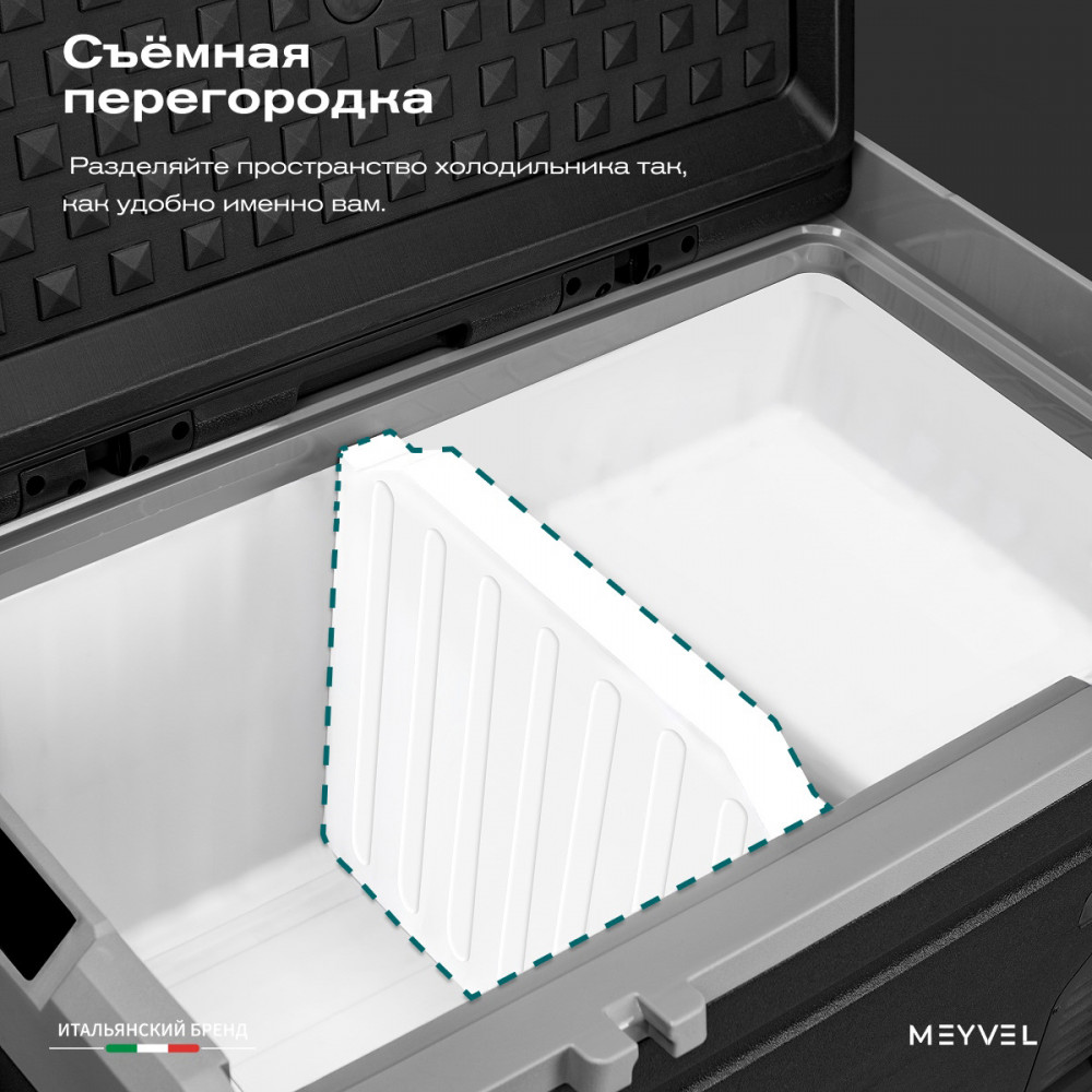 ОписаниеКомпрессорный автохолодильник Meyvel AF-H80DD Итальянская компания MEYVEL разработала инновационную модель автомобильного холодильника AF-H80DD, который отлично подойдет для транспортировки и хранения любимых продуктов и напитков. Автомобильный холодильник Meyvel AF-H80DD имеет большую вместимость и отлично подойдет как для совместных путешествий в кругу семьи, так и для профессиональных охотников и рыболовов. Оснащён тихим высокопроизводительным компрессором, работающим от напряжения 12/24 B, с системой защиты от разгерметизации. Благодаря оптимизированному программному обеспечению и регулируемой скорости вращения, Вы можете эффективно поддерживать нужную температуру в дороге и на природе. Автохолодильник-трансформер Модель Meyvel AF-H80DD оснащена внутренней съёмной перегородкой. При установленной перегородке холодильник делится на два отделения, с возможностью настройки разной температуры, в каждом из них. Настройка температуры осуществляется с помощью сенсорной панели управления или мобильного приложения, с отображением температуры в каждом отделении. При снятой перегородке, холодильник становится однокамерным и на дисплее, отображается общая внутренняя температура. Удобство и многофункциональность. Модель укомплектована многофункциональной дверью-крышкой, дизайн которой даёт возможность использовать её в качестве стола, ставить до четырёх стаканов с напитками в специальные подстаканники. Так же в крышке автохолодильника есть специальные углубления для установки телефонов и планшетов. Любителей рыбалки несомненно порадует наличие на крышке линейки для измерения улова или других трофеев. В качестве бонуса, на корпусе встроена открывалка для бутылок. Благодаря перечисленным особенностям, холодильник идеально подходит для отдыха на природе. Крышка имеет возможность открытия с любой стороны, без специальной перестановки, достаточно освободить резиновые фиксаторы с нужной стороны. Так же её можно полностью снять. Боковые ручки обеспечивают лёгкое и удобное перемещение холодильника. Управление всеми функциями через сенсорную панель управления или через смартфон Сенсорная панель управления имеет дисплей, с отображение всех изменяемых параметров. Дизайнеры и инженеры Meyvel позаботились о Вашем комфорте и разработали мобильное приложени, благодаря которому Вы можете управлять холодильником всего лишь одним касанием. Включайте и отключайте автомобильный холодильник, меняйте и настраивайте температурный режим прямо в дороге. Теперь, когда управление авто холодильником стало простым и понятным, Вам и Вашим близким остается лишь наслаждаться путешествием. Автохолодильник для путешествий Эта модель подходит для установки не только в легковые автомобили, но и в грузовые, а так же микроавтобусы, катера, автодома и кемперы. Питание осуществляется от прикуривателя (12 или 24 В). Благодаря оптимизированному программному обеспечению и регулируемой скорости вращения, Вы можете эффективно поддерживать нужную температуру продуктов и напитков в дороге и на природе. Испаритель располагается на всех четырёх сторонах корпуса и благодаря этому, охлаждение происходит максимально быстро и равномерно. Преимущества автохолодильника AF-H80DD: Трансформируемое внутреннее пространство (1 или 2 камеры); Управление через Android/iOS; Усил