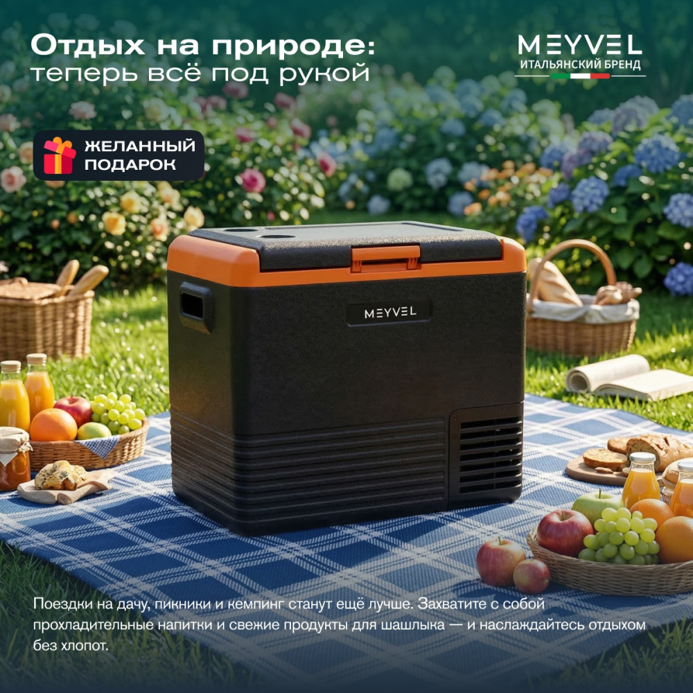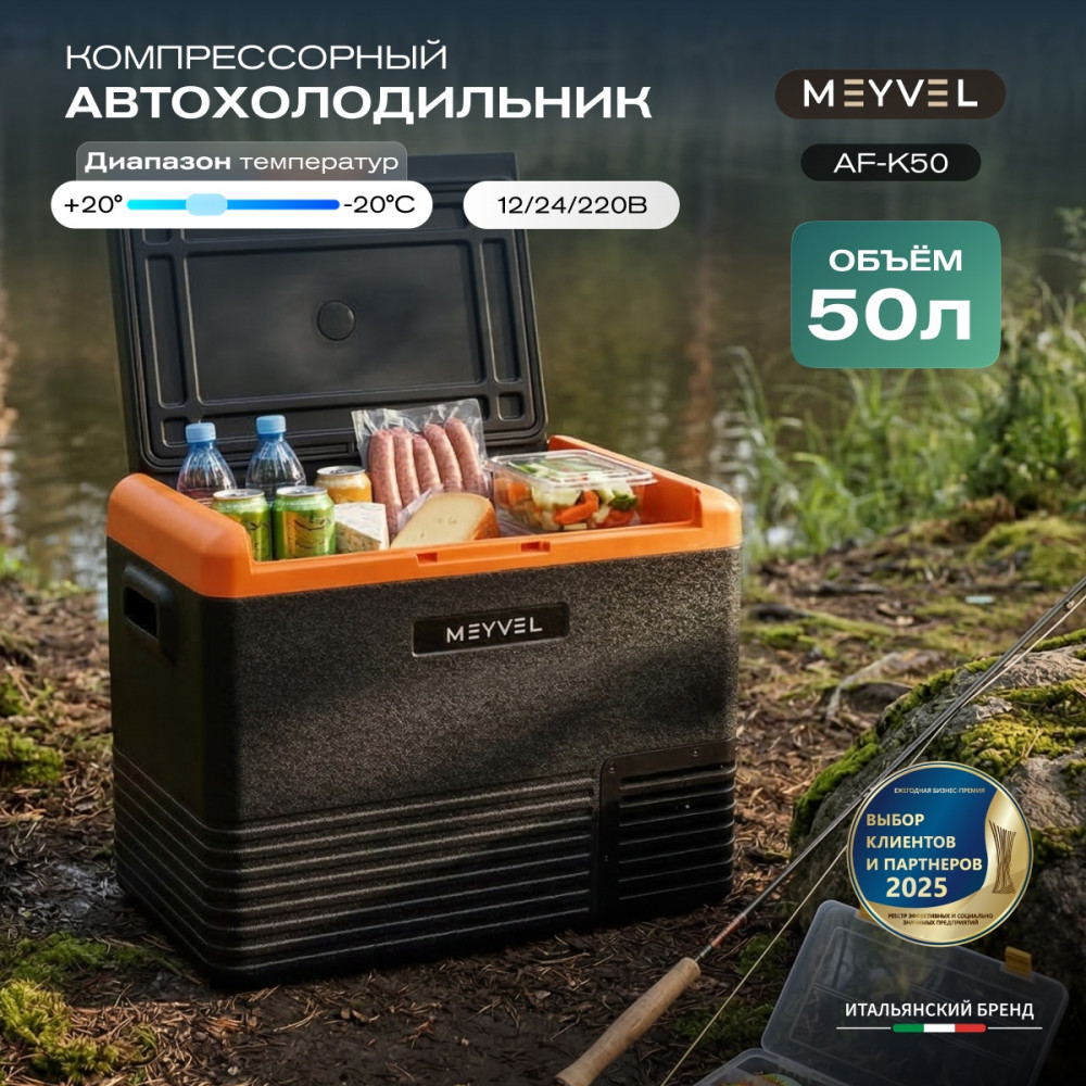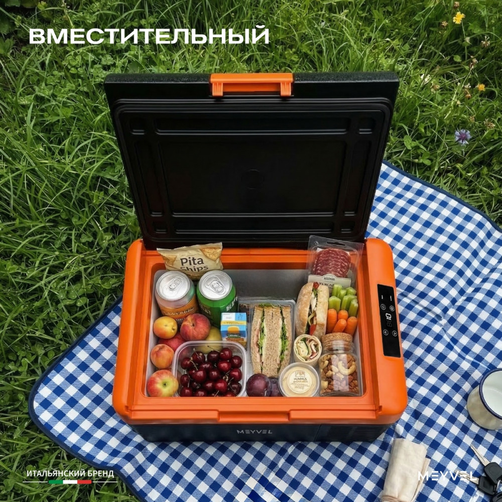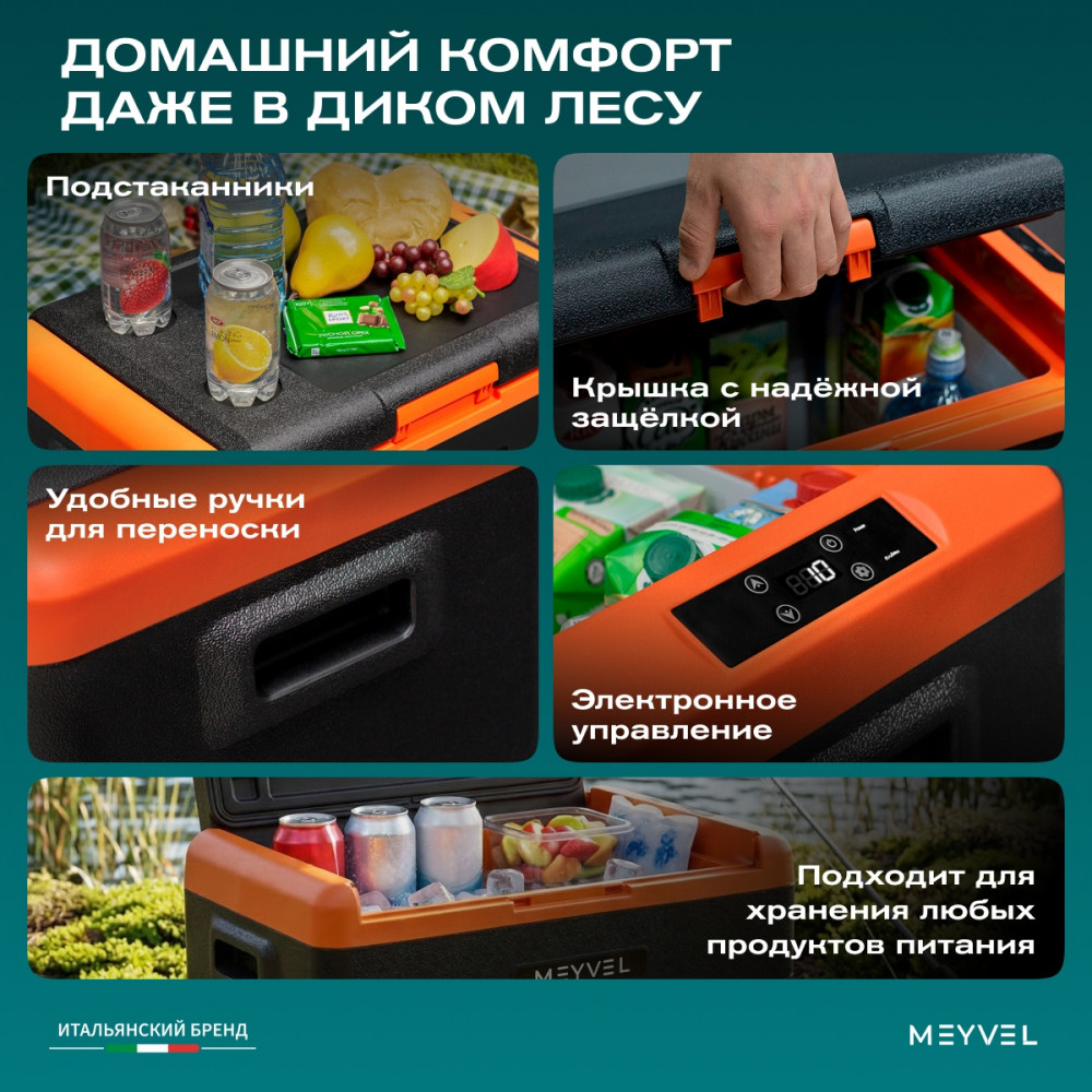 ОписаниеКомпрессорный автохолодильник Meyvel AF-K50 Итальянская компания MEYVEL представляет инновационную продукцию, которая отлично подойдет для транспортировки и хранения любимых продуктов и напитков. Так же, благодаря использованию качественных комплектующих и высокотехнологичного производства, наши товары отличаются высокой конкурентоспособностью и отличным качеством. Автомобильный холодильник Meyvel AF-K50 имеет большую вместимость и отлично подойдет как для совместных путешествий в кругу семьи, так и для профессиональных охотников и рыболовов. Ключевой особенностью данной модели является тихий высокопроизводительный компрессор, имеющий напряжение 12/24 B с системой защиты от разгерметизации. Благодаря оптимизированному программному обеспечению и регулируемой скорости вращения, Вы можете эффективно поддерживать нужную температуру в дороге и на природе. Преимущества автохолодильника Meyvel AF-K50 Вместимость 50 л; Угол наклона компрессора до 40°С; Компактные ручки по бокам для удобного перемещения холодильника; Широкий температурный режим от +20° до -20°С; Безопасный и экологически чистый хладагент R-134a; Трёхуровневая система защиты от разряда аккумулятора; Защита компрессора от перегрева; Автоматический контроль температуры; Работает от солнечных батарей; Индикатор ошибок на дисплее; Память настроек (во время отключения электричества или при недостаточном уровне напряжения холодильник возобновит работу после подачи питания, сохраняя ранее заданные настройки). Кроме того, данная модель имеет 2 режима работы: Турбо. Позволяет срочно заморозить содержимое; Экономичный. При этом режиме устройство расходует меньше энергии, сохраняя свежесть продуктов. Продуманное внутреннее пространство и эффективное поддержание температуры Объёмное пространство внутри холодильника позволяет с легкостью разместить в нём большое количество разнообразных продуктов питания абсолютно на любой вкус. Также благодаря широкому температурному режиму (от +20° до -20°С) сохраняется качество любимой еды и напитков, даже во время длительного путешествия. Соблюдение стандартов качества и соответствие современным тенденциям Благодаря использованию качественных комплектующих и высокотехнологичного производства, холодильники обладают высокой эффективностью и надежностью. Приобретая автохолодильник Meyvel AF-K50 Вы получите персональную консультацию по эксплуатации, а кроме того, мы гарантируем сервисную поддержку по всей стране. Вам больше не придется прерывать свое путешествие для того, чтобы перекусить в сомнительных закусочных и магазинах. С Meyvel любимая еда и напитки сохранят свой вкус и качество даже во время самого длительного путешествия!
