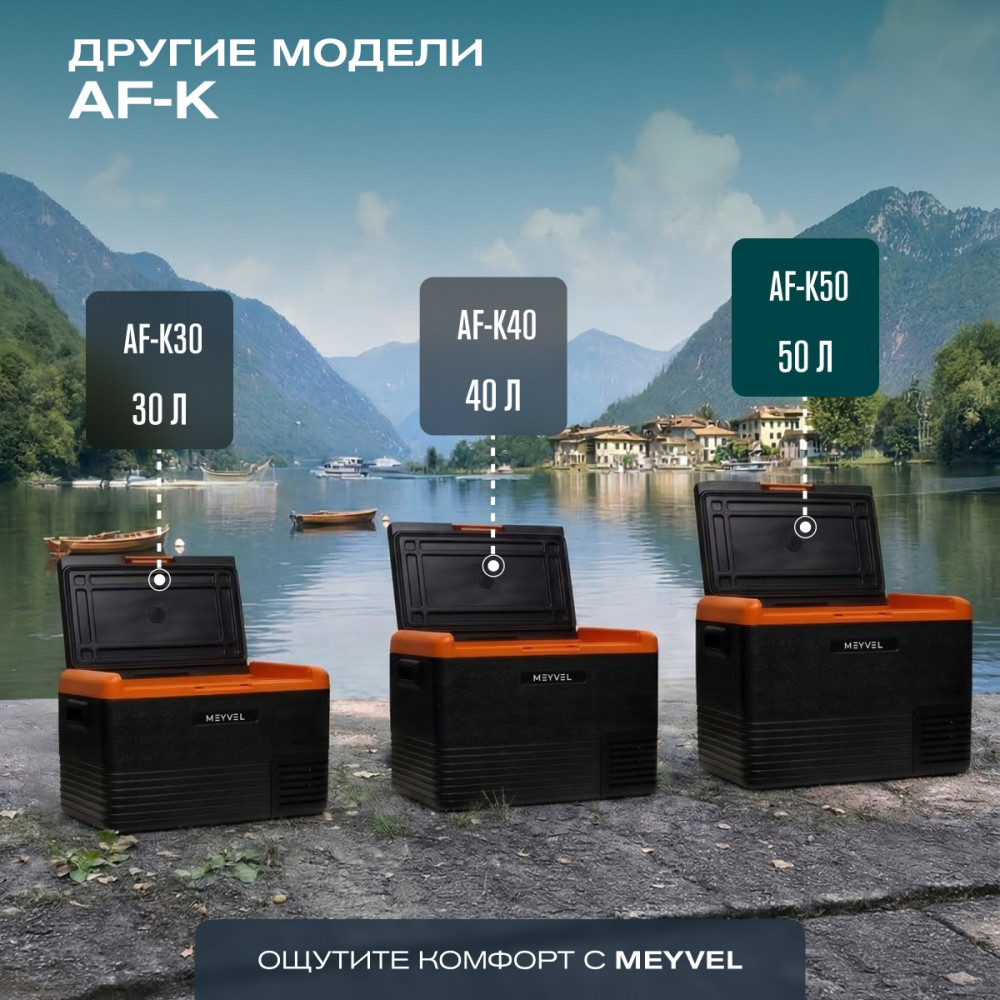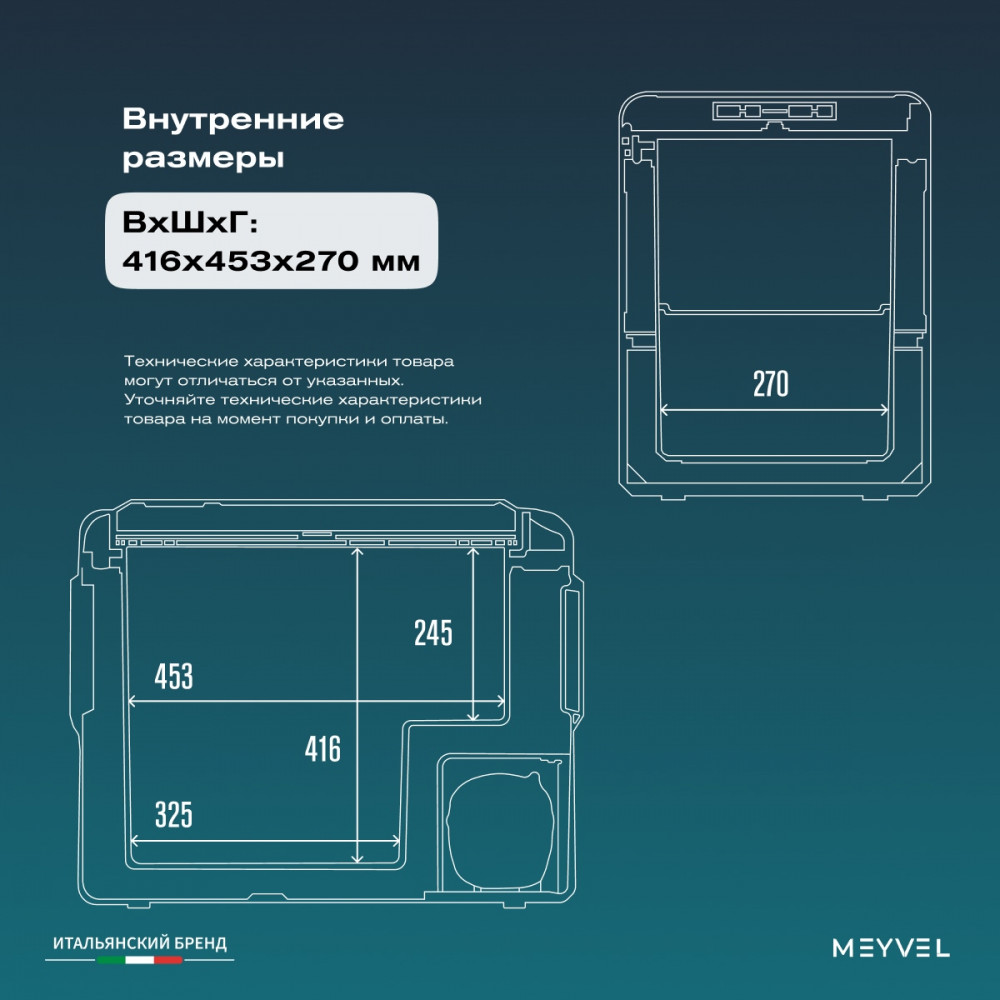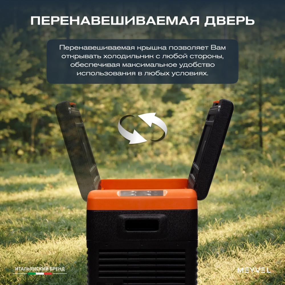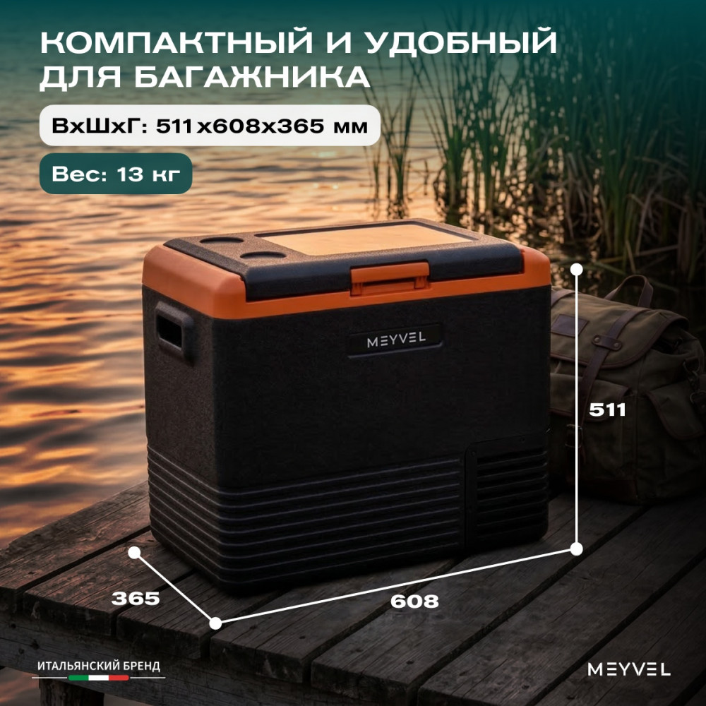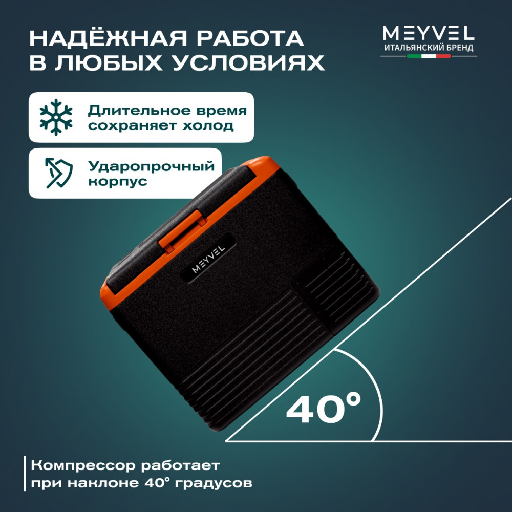 ОписаниеКомпрессорный автохолодильник Meyvel AF-K50 Итальянская компания MEYVEL представляет инновационную продукцию, которая отлично подойдет для транспортировки и хранения любимых продуктов и напитков. Так же, благодаря использованию качественных комплектующих и высокотехнологичного производства, наши товары отличаются высокой конкурентоспособностью и отличным качеством. Автомобильный холодильник Meyvel AF-K50 имеет большую вместимость и отлично подойдет как для совместных путешествий в кругу семьи, так и для профессиональных охотников и рыболовов. Ключевой особенностью данной модели является тихий высокопроизводительный компрессор, имеющий напряжение 12/24 B с системой защиты от разгерметизации. Благодаря оптимизированному программному обеспечению и регулируемой скорости вращения, Вы можете эффективно поддерживать нужную температуру в дороге и на природе. Преимущества автохолодильника Meyvel AF-K50 Вместимость 50 л; Угол наклона компрессора до 40°С; Компактные ручки по бокам для удобного перемещения холодильника; Широкий температурный режим от +20° до -20°С; Безопасный и экологически чистый хладагент R-134a; Трёхуровневая система защиты от разряда аккумулятора; Защита компрессора от перегрева; Автоматический контроль температуры; Работает от солнечных батарей; Индикатор ошибок на дисплее; Память настроек (во время отключения электричества или при недостаточном уровне напряжения холодильник возобновит работу после подачи питания, сохраняя ранее заданные настройки). Кроме того, данная модель имеет 2 режима работы: Турбо. Позволяет срочно заморозить содержимое; Экономичный. При этом режиме устройство расходует меньше энергии, сохраняя свежесть продуктов. Продуманное внутреннее пространство и эффективное поддержание температуры Объёмное пространство внутри холодильника позволяет с легкостью разместить в нём большое количество разнообразных продуктов питания абсолютно на любой вкус. Также благодаря широкому температурному режиму (от +20° до -20°С) сохраняется качество любимой еды и напитков, даже во время длительного путешествия. Соблюдение стандартов качества и соответствие современным тенденциям Благодаря использованию качественных комплектующих и высокотехнологичного производства, холодильники обладают высокой эффективностью и надежностью. Приобретая автохолодильник Meyvel AF-K50 Вы получите персональную консультацию по эксплуатации, а кроме того, мы гарантируем сервисную поддержку по всей стране. Вам больше не придется прерывать свое путешествие для того, чтобы перекусить в сомнительных закусочных и магазинах. С Meyvel любимая еда и напитки сохранят свой вкус и качество даже во время самого длительного путешествия!