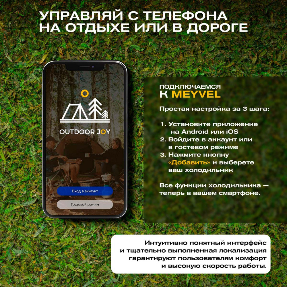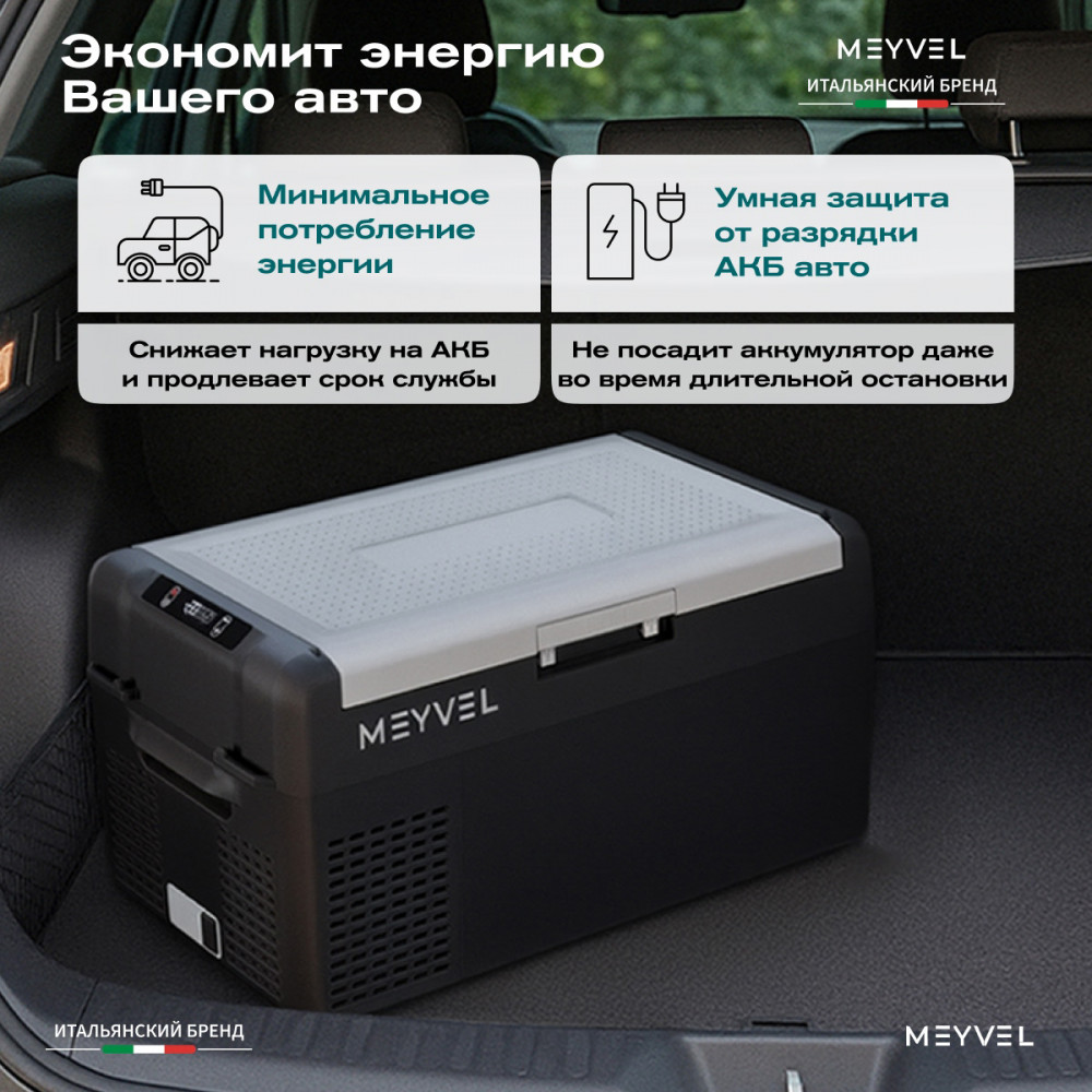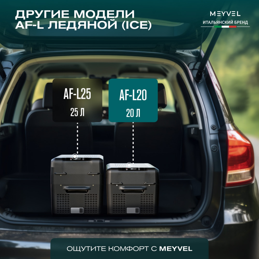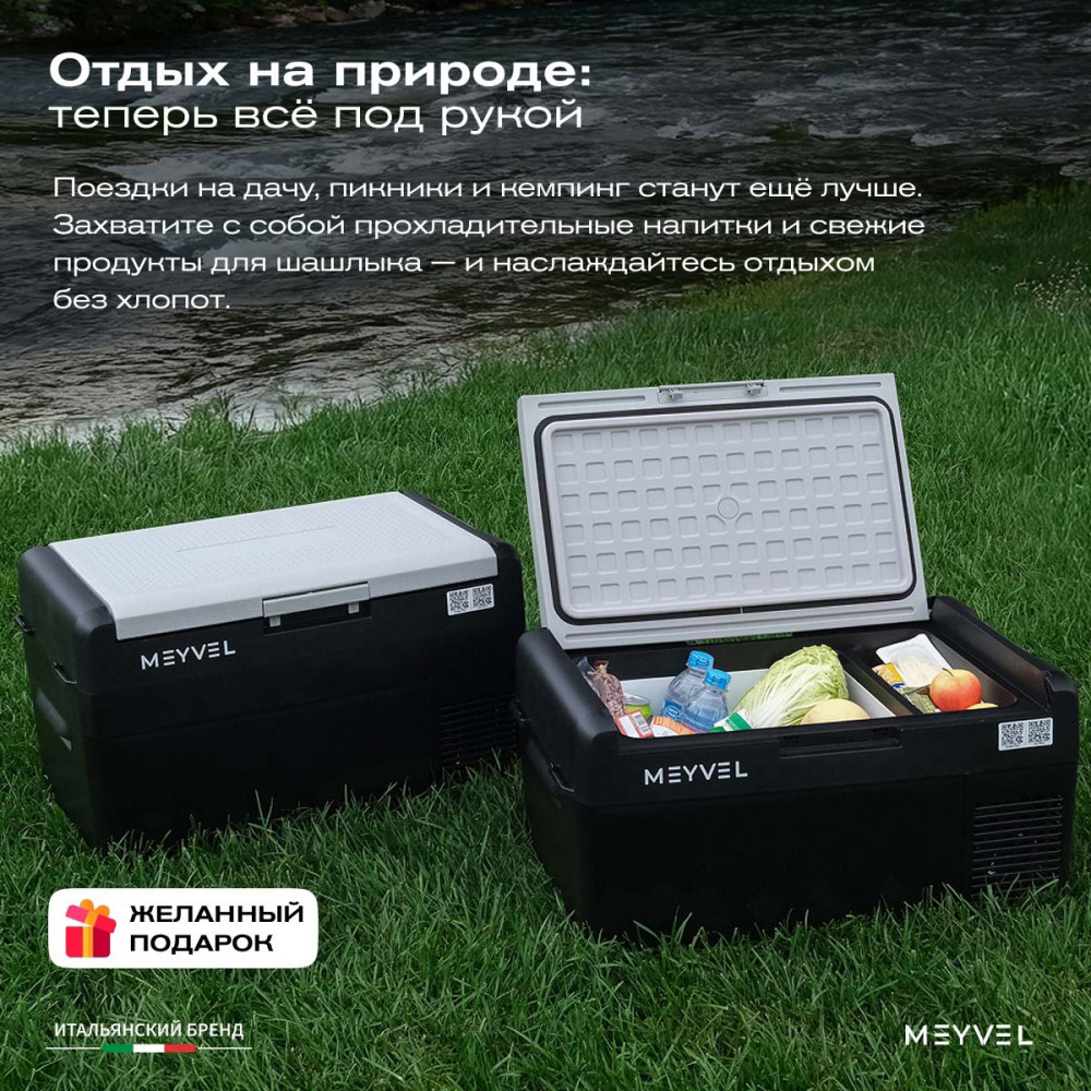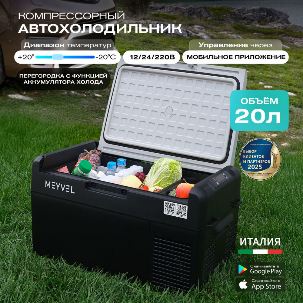 ОписаниеПереносной автохолодильник Meyvel AF-L20 ЛЕДЯНОЙ (ICE) Компактный компрессорный автохолодильник Meyvel AF-L20 ЛЕДЯНОЙ (ICE) на 20 л — это практичное решение для тех, кто проводит много времени в дороге. Он поддерживает температуру от -20 до +20°C и одинаково эффективно справляется с охлаждением и полноценной заморозкой. Будь то охлаждённые напитки в летнюю жару или замороженные продукты в длительной поездке — этот автохолодильник не подведёт. Он подойдёт и для отдыха на природе, и для дальних рейсов дальнобойщиков, и даже для хранения еды на даче. Надёжность в деталях Одна из ключевых особенностей модели AF-L20 ЛЕДЯНОЙ (ICE) — аккумулятор холода. Это не батарея в привычном понимании, а специальный термоаккумулирующий блок, который накапливает холод и поддерживает низкую температуру в камере даже при отключении питания. Особенно полезно, если вы временно оставили холодильник без сети: продукты не испортятся, пока вы в пути. ВАЖНО: ЗАЛИВАЙТЕ В АККУМУЛЯТОР ХОЛОДА ТОЛЬКО СПЕЦИАЛЬНУЮ ЖИДКОСТЬ ДЛЯ АККУМУЛЯТОРА ХОЛОДА (2 Л). ЗАЛИВАТЬ ВОДУ И ДРУГИЕ ЖИДКОСТИ КАТЕГОРИЧЕСКИ ЗАПРЕЩЕНО. Также стоит отметить трёхуровневую систему защиты от разряда аккумулятора автомобиля. Устройство автоматически следит за уровнем заряда бортовой сети и, при достижении критического значения, отключается, чтобы не посадить аккумулятор. Это особенно важно для путешественников, использующих холодильник в режиме длительного ожидания. Точное поддержание температуры Благодаря системе автоматического контроля, Meyvel AF-L20 ЛЕДЯНОЙ (ICE) самостоятельно регулирует работу компрессора, поддерживая заданную температуру без скачков. Это значит, что вы можете положиться на стабильные условия хранения даже в сильную жару. Дополнительный плюс — выбор между режимами Максимальный и Экономичный. В первом случае компрессор работает на полную мощность, быстро достигая нужной температуры. Экономичный, в свою очередь, экономит энергию, чтобы дольше использовать питание от аккумулятора и снижая нагрузку на электросеть автомобиля. Гибкость подключения Meyvel AF-L20 ЛЕДЯНОЙ (ICE) легко адаптируется под разные источники питания. В дороге он подключается к прикуривателю автомобиля — подходит как для 12 В, так и для 24 В. А если вы хотите использовать его дома или на даче достаточно приобрести адаптер и подключить к обычной розетке 220 В. Это расширяет возможности: один холодильник — и для машины, и для загородного дома. Умное управление Устройство можно настраивать и контролировать через мобильное приложение. Это особенно удобно, если автохолодильник установлен в багажнике или труднодоступном месте: не нужно каждый раз наклоняться к панели управления. Вы можете задать температуру, переключить режим или проверить текущее состояние устройства прямо со смартфона. Бесшумный помощник Холодильник не мешает отдыху и не раздражает посторонними звуками, потому что не издает звуки громче 35 дБ. Его практически не слышно даже ночью в салоне автомобиля или в палатке. Поэтому он — идеальное решение для тех, кто ценит комфорт в любых условиях. Дизайн и эргономика Meyvel AF-L20 ЛЕДЯНОЙ (ICE) спроектирован так, чтобы быть максимально удобным в повседневной эксплуатации. Устройство оснащено надёжными ручками для переноски и крышкой с защёлкой, которая не откроется при движении или случайном толчке. Благодаря компакт