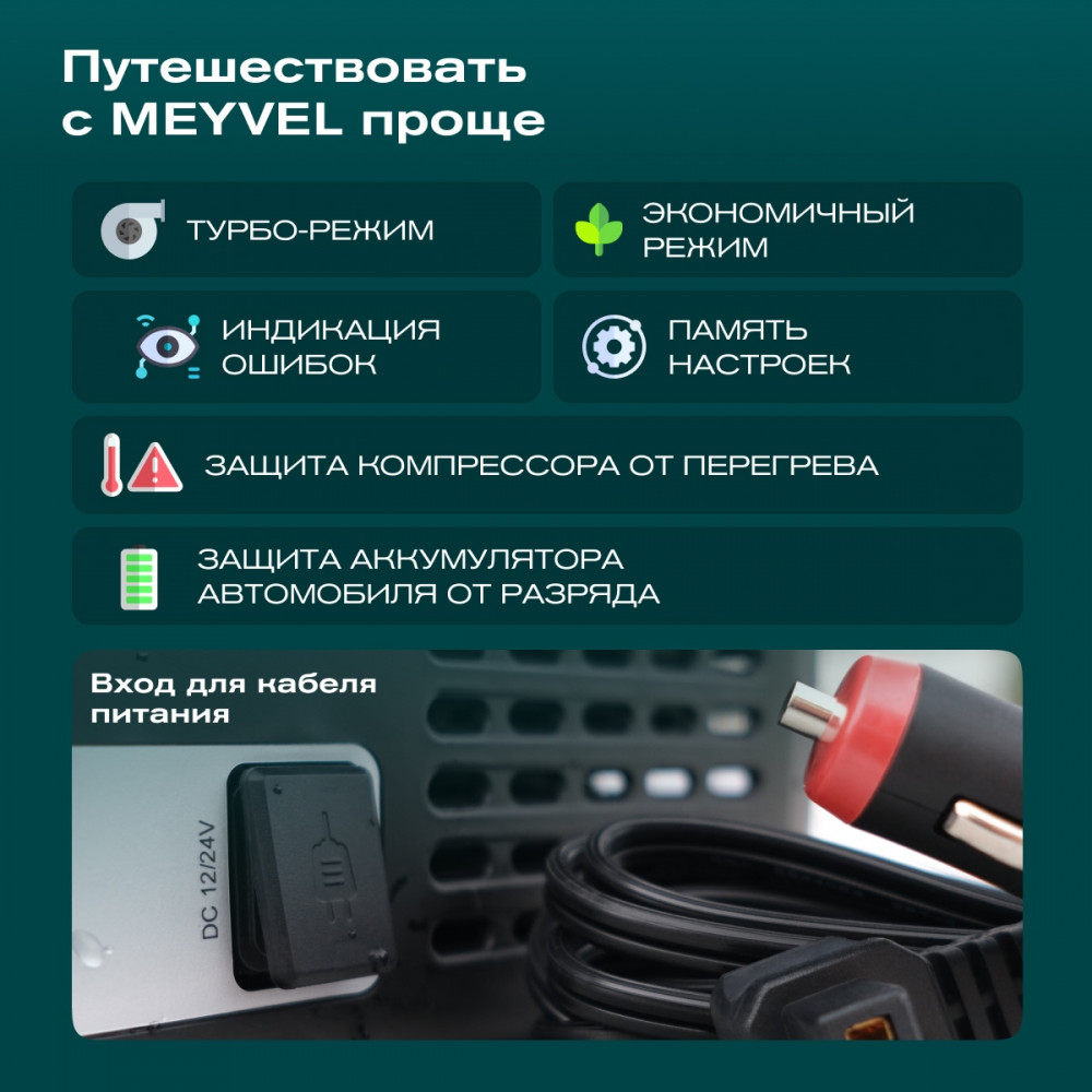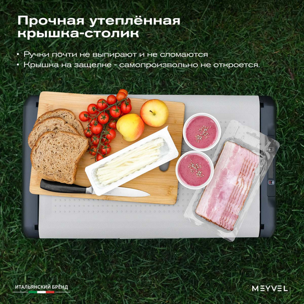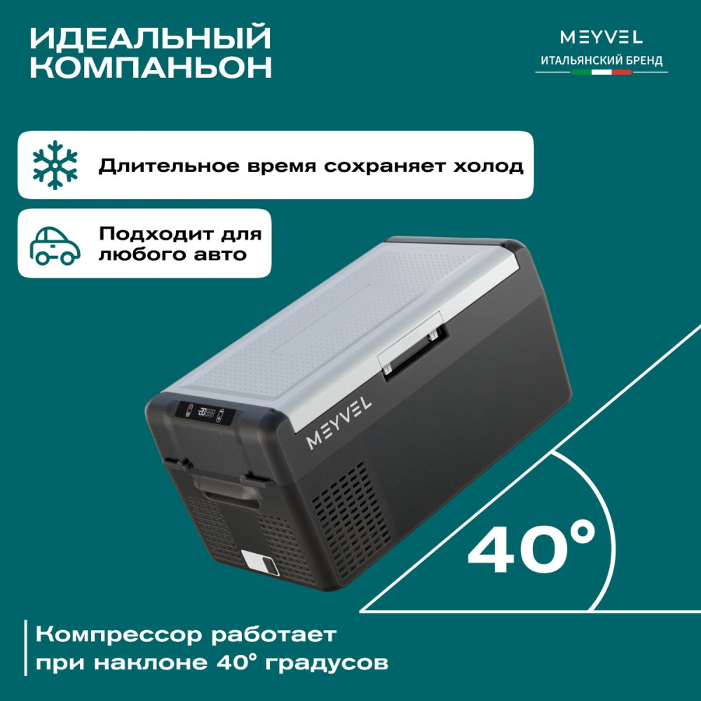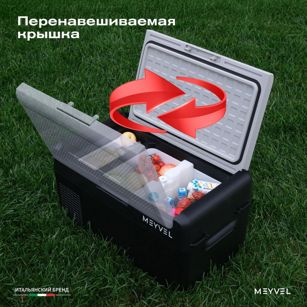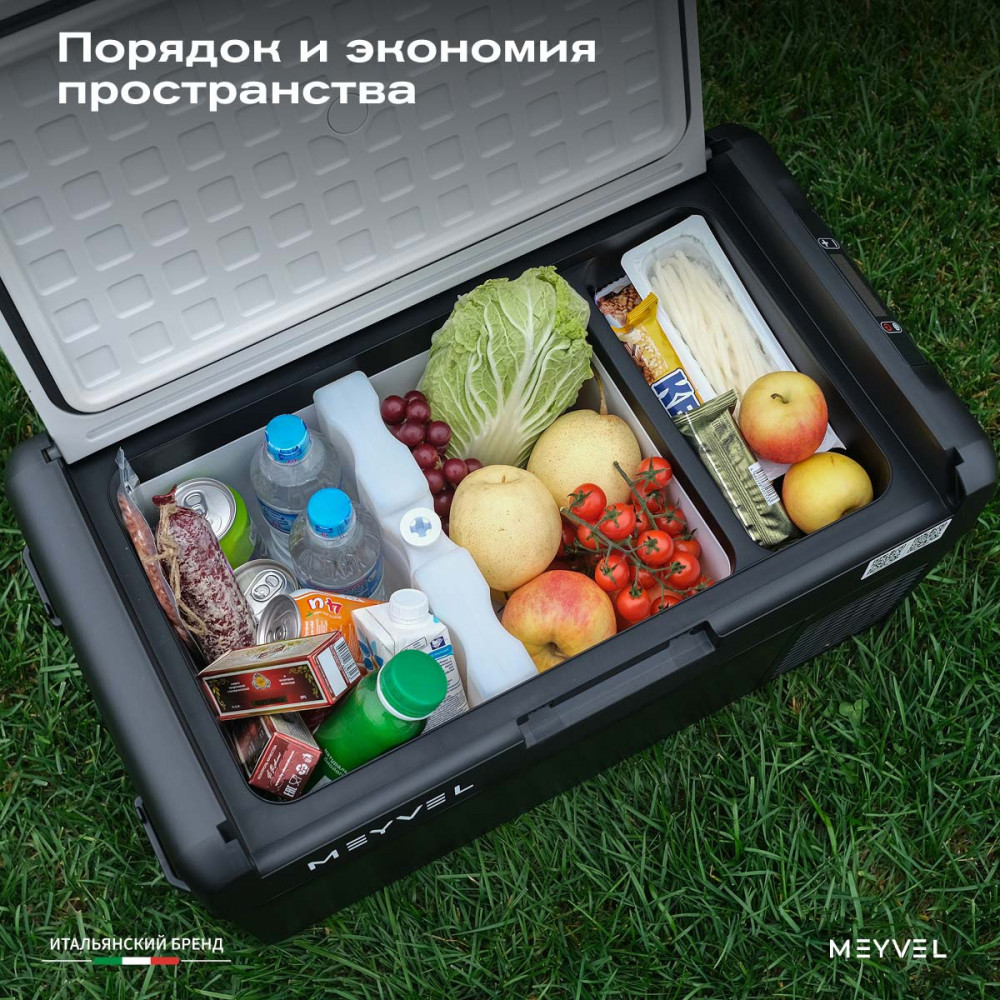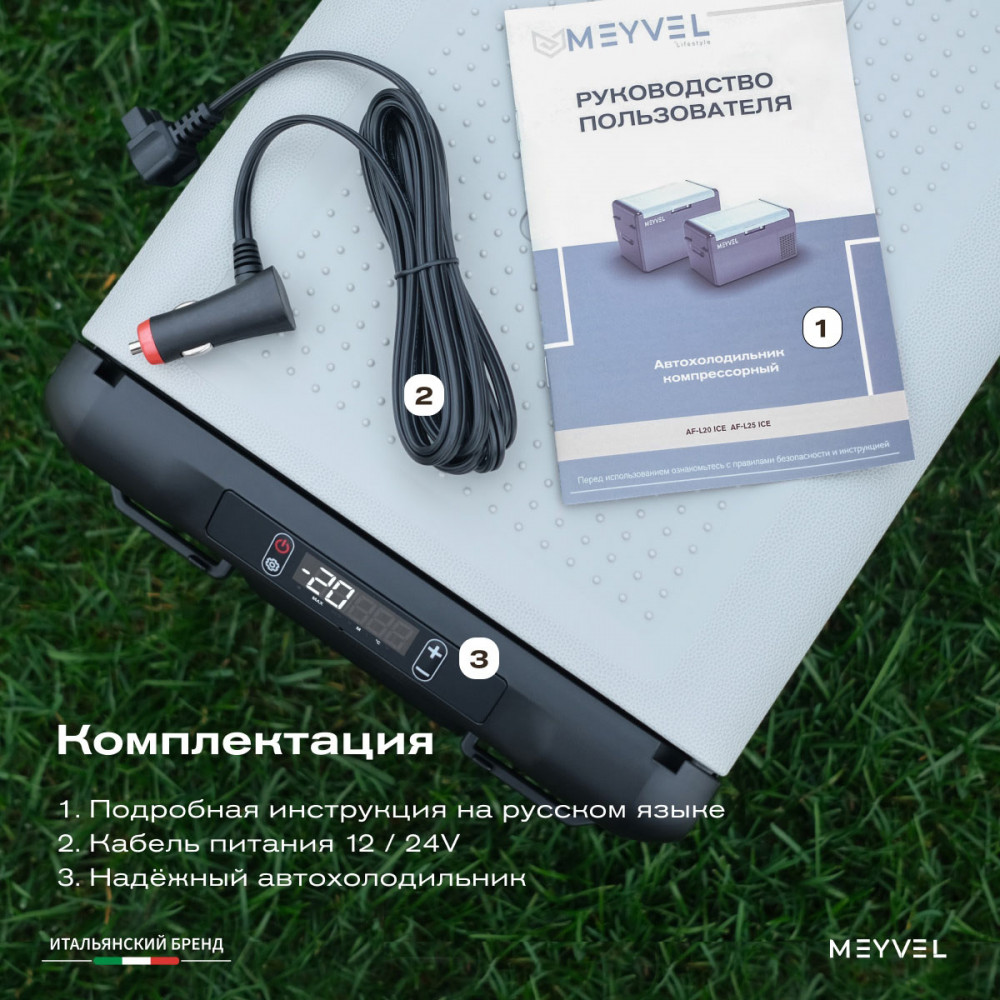 ОписаниеПереносной автохолодильник Meyvel AF-L20 ЛЕДЯНОЙ (ICE) Компактный компрессорный автохолодильник Meyvel AF-L20 ЛЕДЯНОЙ (ICE) на 20 л — это практичное решение для тех, кто проводит много времени в дороге. Он поддерживает температуру от -20 до +20°C и одинаково эффективно справляется с охлаждением и полноценной заморозкой. Будь то охлаждённые напитки в летнюю жару или замороженные продукты в длительной поездке — этот автохолодильник не подведёт. Он подойдёт и для отдыха на природе, и для дальних рейсов дальнобойщиков, и даже для хранения еды на даче. Надёжность в деталях Одна из ключевых особенностей модели AF-L20 ЛЕДЯНОЙ (ICE) — аккумулятор холода. Это не батарея в привычном понимании, а специальный термоаккумулирующий блок, который накапливает холод и поддерживает низкую температуру в камере даже при отключении питания. Особенно полезно, если вы временно оставили холодильник без сети: продукты не испортятся, пока вы в пути. ВАЖНО: ЗАЛИВАЙТЕ В АККУМУЛЯТОР ХОЛОДА ТОЛЬКО СПЕЦИАЛЬНУЮ ЖИДКОСТЬ ДЛЯ АККУМУЛЯТОРА ХОЛОДА (2 Л). ЗАЛИВАТЬ ВОДУ И ДРУГИЕ ЖИДКОСТИ КАТЕГОРИЧЕСКИ ЗАПРЕЩЕНО. Также стоит отметить трёхуровневую систему защиты от разряда аккумулятора автомобиля. Устройство автоматически следит за уровнем заряда бортовой сети и, при достижении критического значения, отключается, чтобы не посадить аккумулятор. Это особенно важно для путешественников, использующих холодильник в режиме длительного ожидания. Точное поддержание температуры Благодаря системе автоматического контроля, Meyvel AF-L20 ЛЕДЯНОЙ (ICE) самостоятельно регулирует работу компрессора, поддерживая заданную температуру без скачков. Это значит, что вы можете положиться на стабильные условия хранения даже в сильную жару. Дополнительный плюс — выбор между режимами Максимальный и Экономичный. В первом случае компрессор работает на полную мощность, быстро достигая нужной температуры. Экономичный, в свою очередь, экономит энергию, чтобы дольше использовать питание от аккумулятора и снижая нагрузку на электросеть автомобиля. Гибкость подключения Meyvel AF-L20 ЛЕДЯНОЙ (ICE) легко адаптируется под разные источники питания. В дороге он подключается к прикуривателю автомобиля — подходит как для 12 В, так и для 24 В. А если вы хотите использовать его дома или на даче достаточно приобрести адаптер и подключить к обычной розетке 220 В. Это расширяет возможности: один холодильник — и для машины, и для загородного дома. Умное управление Устройство можно настраивать и контролировать через мобильное приложение. Это особенно удобно, если автохолодильник установлен в багажнике или труднодоступном месте: не нужно каждый раз наклоняться к панели управления. Вы можете задать температуру, переключить режим или проверить текущее состояние устройства прямо со смартфона. Бесшумный помощник Холодильник не мешает отдыху и не раздражает посторонними звуками, потому что не издает звуки громче 35 дБ. Его практически не слышно даже ночью в салоне автомобиля или в палатке. Поэтому он — идеальное решение для тех, кто ценит комфорт в любых условиях. Дизайн и эргономика Meyvel AF-L20 ЛЕДЯНОЙ (ICE) спроектирован так, чтобы быть максимально удобным в повседневной эксплуатации. Устройство оснащено надёжными ручками для переноски и крышкой с защёлкой, которая не откроется при движении или случайном толчке. Благодаря компакт