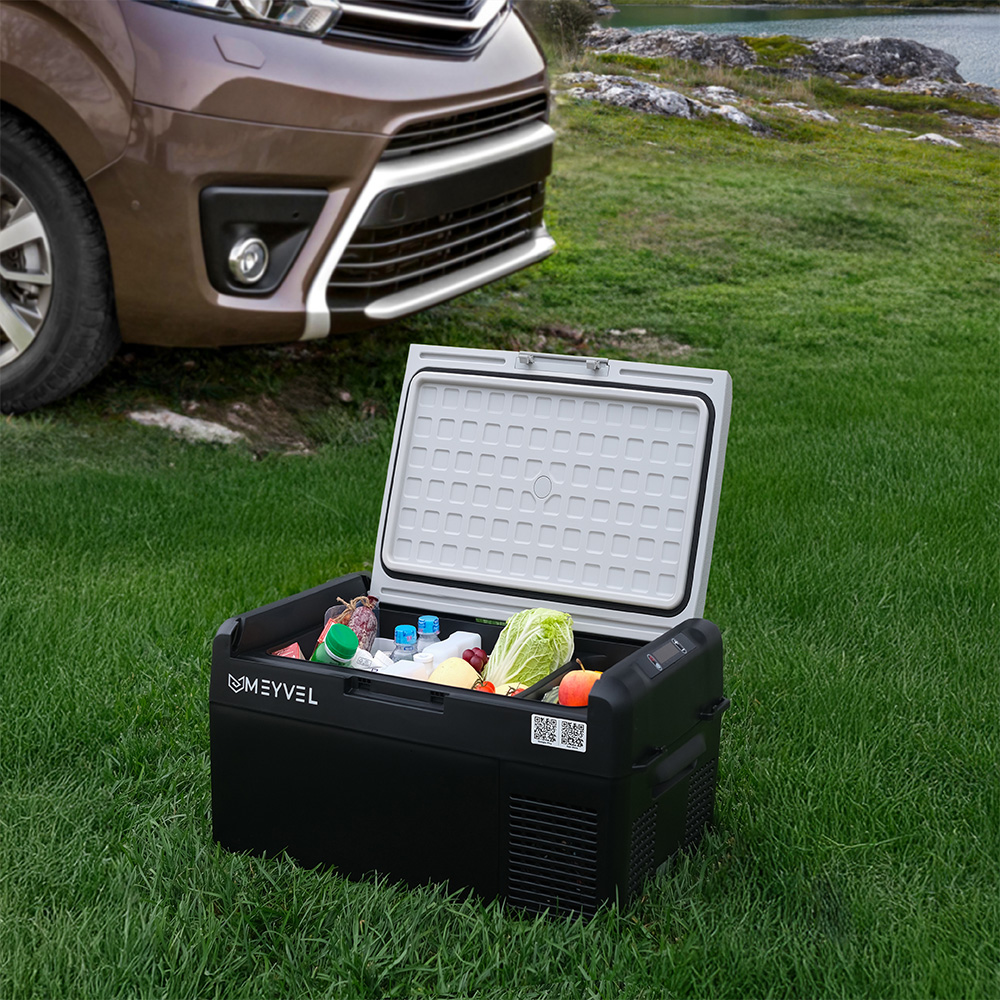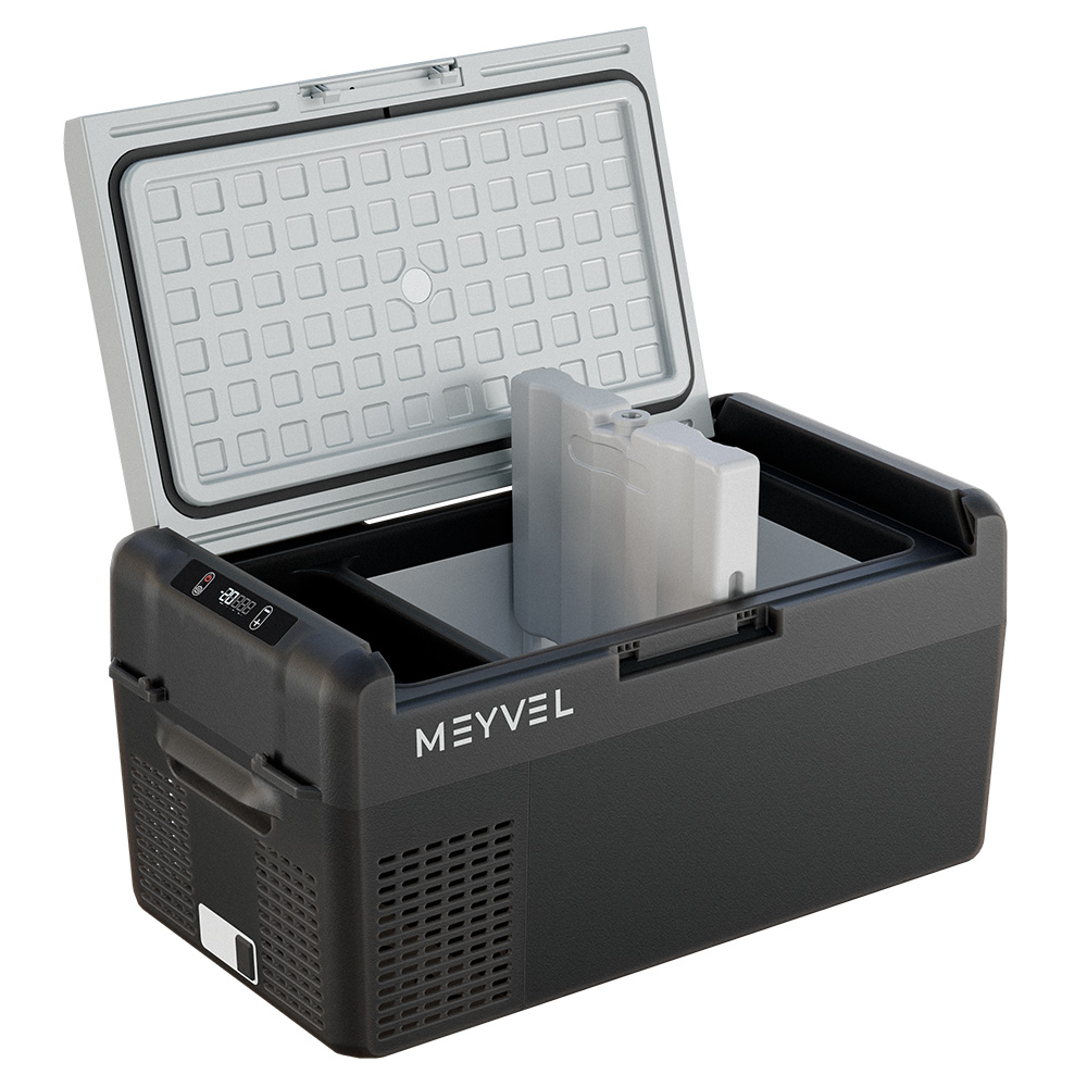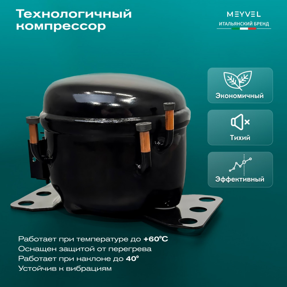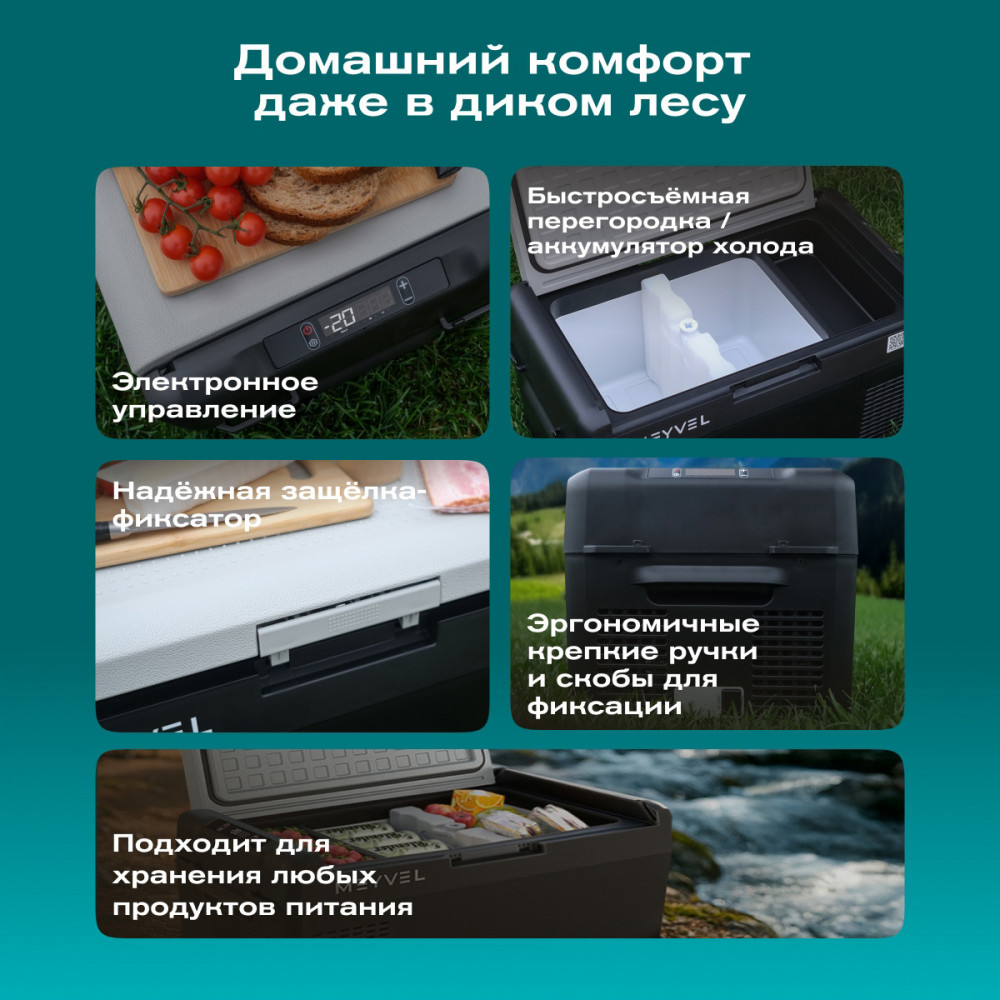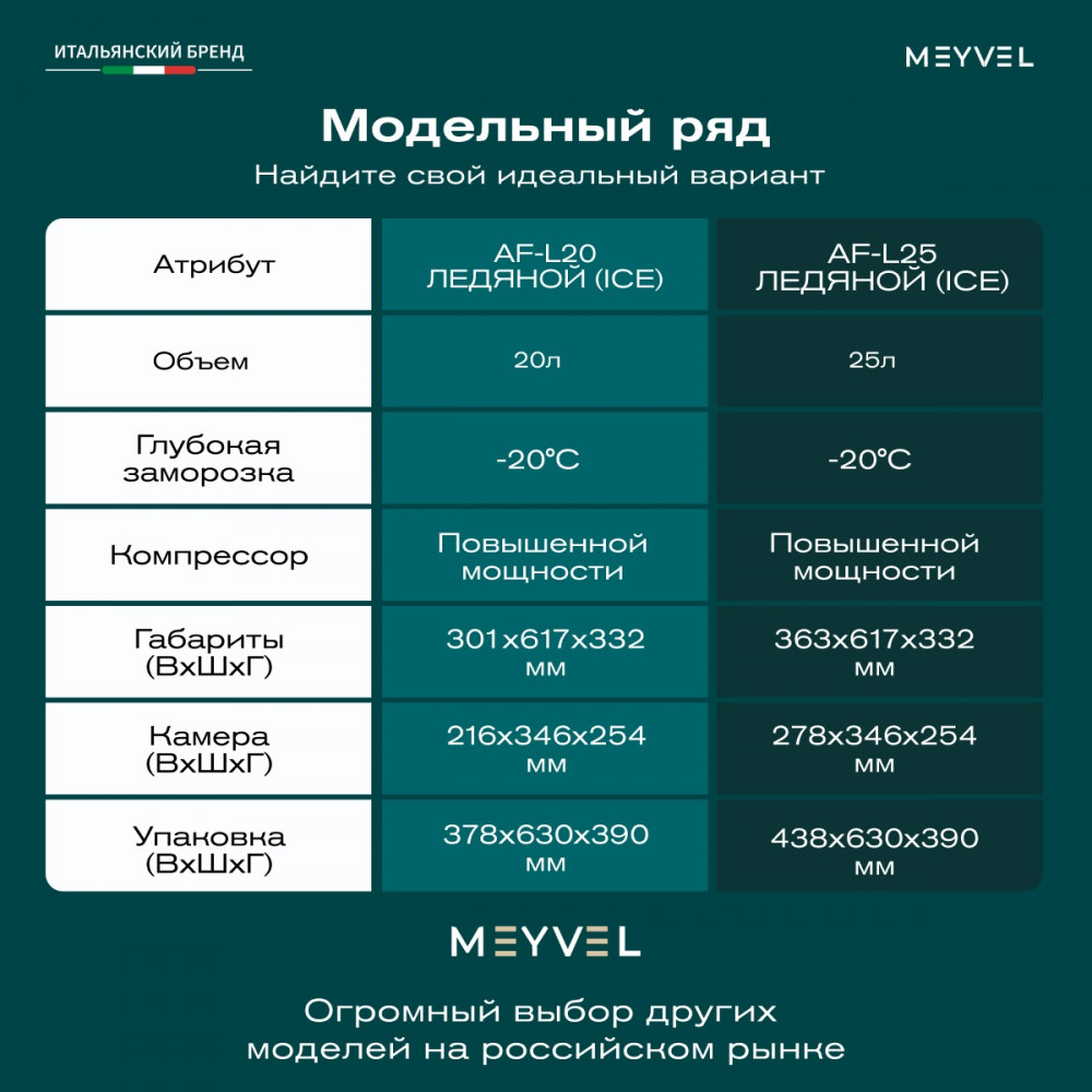 ОписаниеПереносной автохолодильник Meyvel AF-L20 ЛЕДЯНОЙ (ICE) Компактный компрессорный автохолодильник Meyvel AF-L20 ЛЕДЯНОЙ (ICE) на 20 л — это практичное решение для тех, кто проводит много времени в дороге. Он поддерживает температуру от -20 до +20°C и одинаково эффективно справляется с охлаждением и полноценной заморозкой. Будь то охлаждённые напитки в летнюю жару или замороженные продукты в длительной поездке — этот автохолодильник не подведёт. Он подойдёт и для отдыха на природе, и для дальних рейсов дальнобойщиков, и даже для хранения еды на даче. Надёжность в деталях Одна из ключевых особенностей модели AF-L20 ЛЕДЯНОЙ (ICE) — аккумулятор холода. Это не батарея в привычном понимании, а специальный термоаккумулирующий блок, который накапливает холод и поддерживает низкую температуру в камере даже при отключении питания. Особенно полезно, если вы временно оставили холодильник без сети: продукты не испортятся, пока вы в пути. ВАЖНО: ЗАЛИВАЙТЕ В АККУМУЛЯТОР ХОЛОДА ТОЛЬКО СПЕЦИАЛЬНУЮ ЖИДКОСТЬ ДЛЯ АККУМУЛЯТОРА ХОЛОДА (2 Л). ЗАЛИВАТЬ ВОДУ И ДРУГИЕ ЖИДКОСТИ КАТЕГОРИЧЕСКИ ЗАПРЕЩЕНО. Также стоит отметить трёхуровневую систему защиты от разряда аккумулятора автомобиля. Устройство автоматически следит за уровнем заряда бортовой сети и, при достижении критического значения, отключается, чтобы не посадить аккумулятор. Это особенно важно для путешественников, использующих холодильник в режиме длительного ожидания. Точное поддержание температуры Благодаря системе автоматического контроля, Meyvel AF-L20 ЛЕДЯНОЙ (ICE) самостоятельно регулирует работу компрессора, поддерживая заданную температуру без скачков. Это значит, что вы можете положиться на стабильные условия хранения даже в сильную жару. Дополнительный плюс — выбор между режимами Максимальный и Экономичный. В первом случае компрессор работает на полную мощность, быстро достигая нужной температуры. Экономичный, в свою очередь, экономит энергию, чтобы дольше использовать питание от аккумулятора и снижая нагрузку на электросеть автомобиля. Гибкость подключения Meyvel AF-L20 ЛЕДЯНОЙ (ICE) легко адаптируется под разные источники питания. В дороге он подключается к прикуривателю автомобиля — подходит как для 12 В, так и для 24 В. А если вы хотите использовать его дома или на даче достаточно приобрести адаптер и подключить к обычной розетке 220 В. Это расширяет возможности: один холодильник — и для машины, и для загородного дома. Умное управление Устройство можно настраивать и контролировать через мобильное приложение. Это особенно удобно, если автохолодильник установлен в багажнике или труднодоступном месте: не нужно каждый раз наклоняться к панели управления. Вы можете задать температуру, переключить режим или проверить текущее состояние устройства прямо со смартфона. Бесшумный помощник Холодильник не мешает отдыху и не раздражает посторонними звуками, потому что не издает звуки громче 35 дБ. Его практически не слышно даже ночью в салоне автомобиля или в палатке. Поэтому он — идеальное решение для тех, кто ценит комфорт в любых условиях. Дизайн и эргономика Meyvel AF-L20 ЛЕДЯНОЙ (ICE) спроектирован так, чтобы быть максимально удобным в повседневной эксплуатации. Устройство оснащено надёжными ручками для переноски и крышкой с защёлкой, которая не откроется при движении или случайном толчке. Благодаря компакт