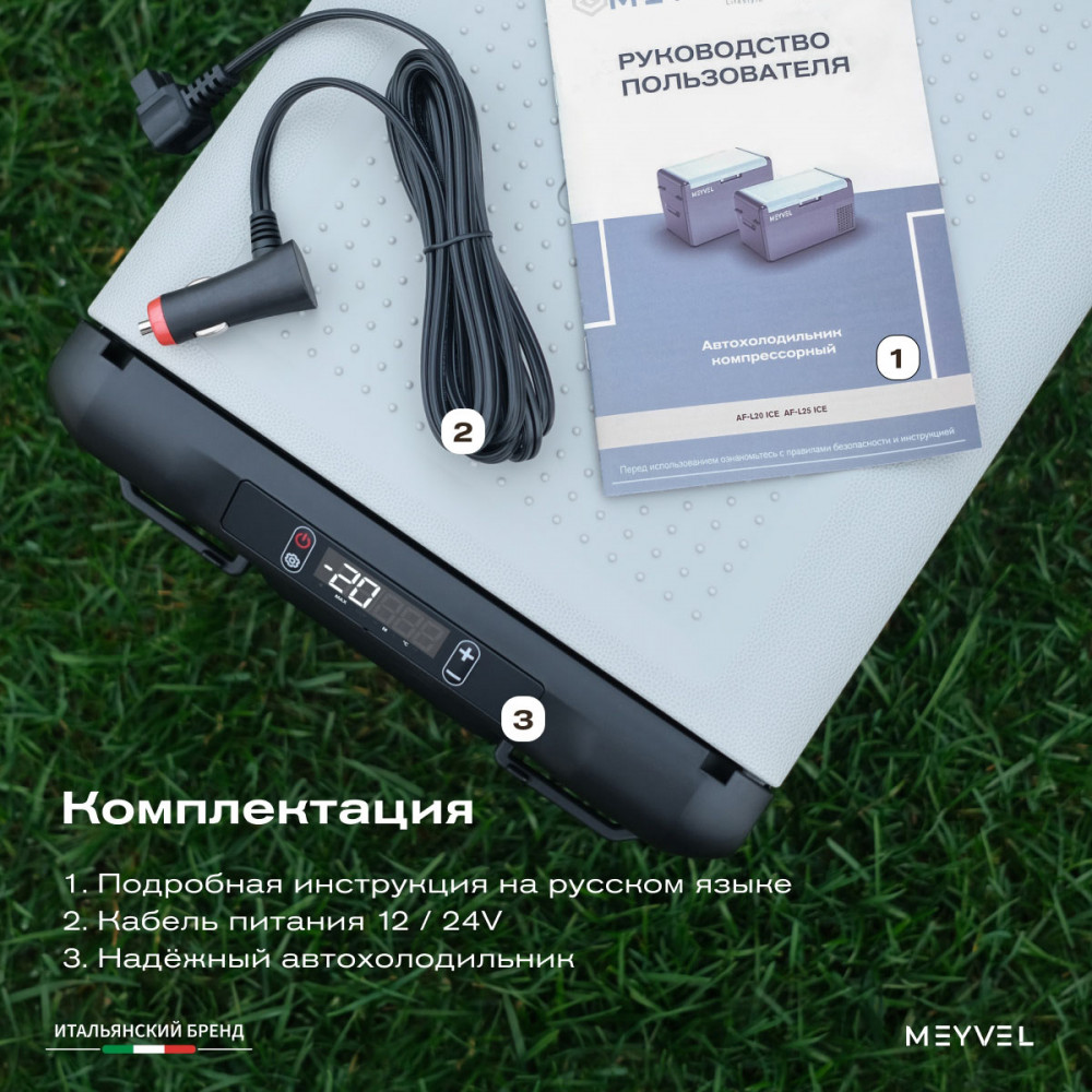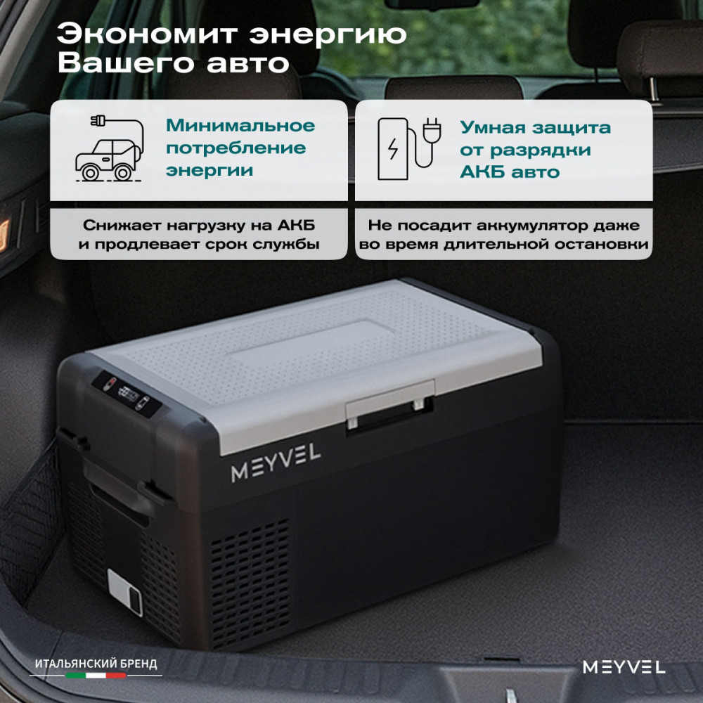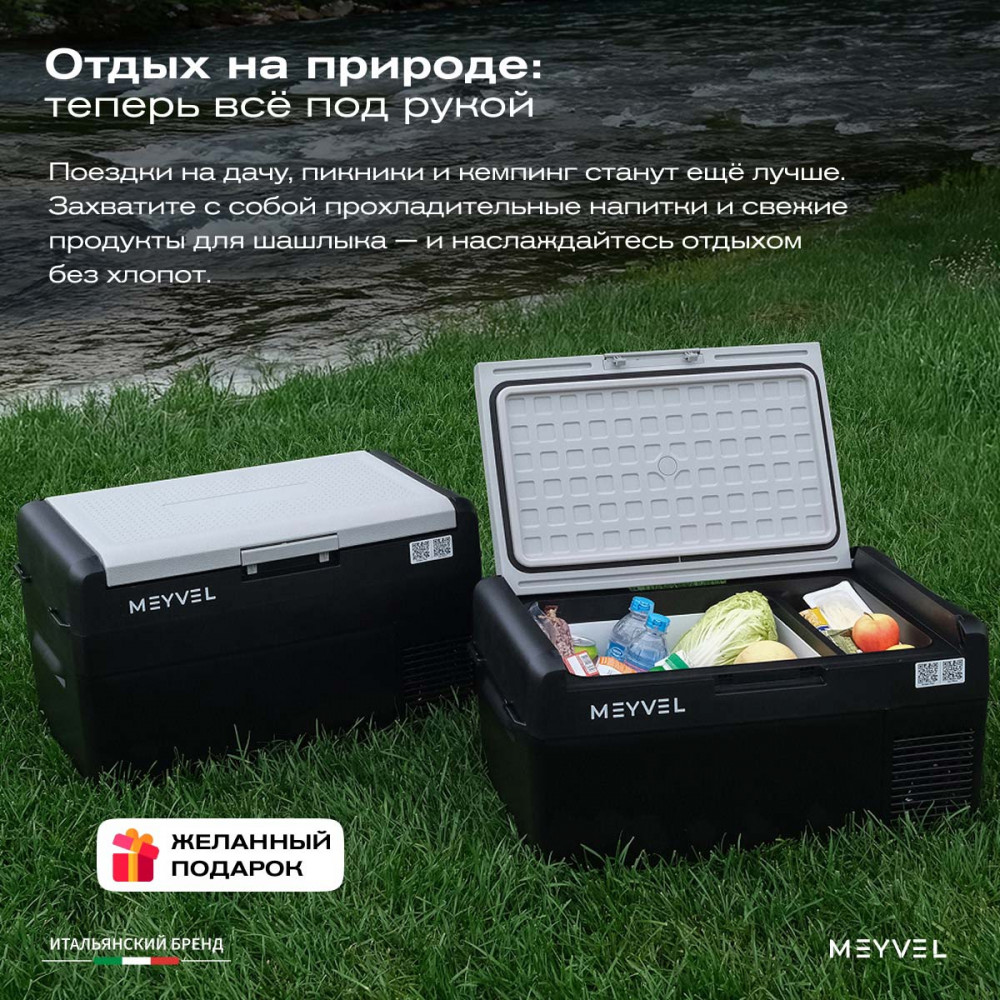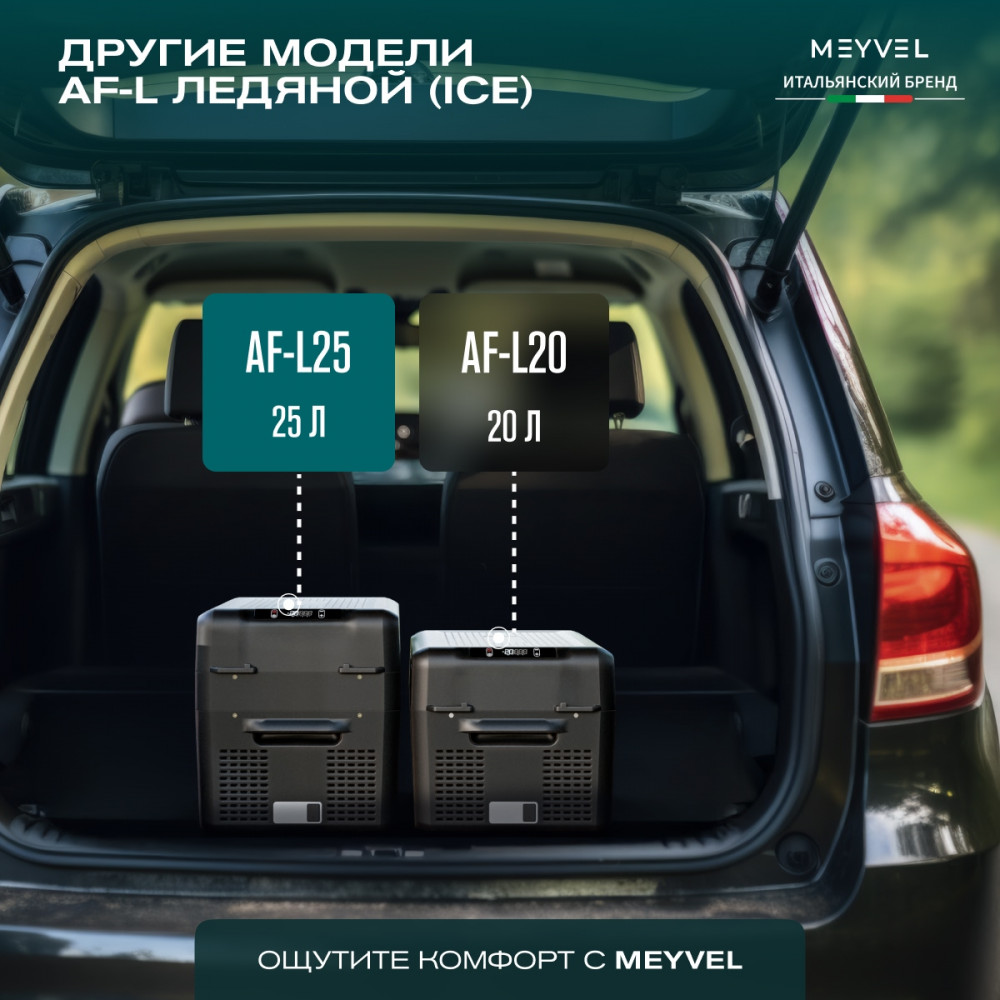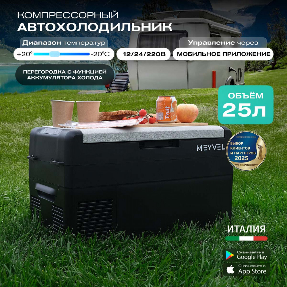 ОписаниеПереносной автохолодильник Meyvel AF-L25 ЛЕДЯНОЙ (ICE) Компактный компрессорный автохолодильник Meyvel AF-L25 ЛЕДЯНОЙ (ICE) на 25 л — это практичное решение для тех, кто проводит много времени в дороге. Он поддерживает температуру от -20 до +20°C и одинаково эффективно справляется с охлаждением и полноценной заморозкой. Будь то охлаждённые напитки в летнюю жару или замороженные продукты в длительной поездке — этот автохолодильник не подведёт. Он подойдёт и для отдыха на природе, и для дальних рейсов дальнобойщиков, и даже для хранения еды на даче. Надёжность в деталях Одна из ключевых особенностей модели AF-L25 ЛЕДЯНОЙ (ICE) — аккумулятор холода. Это не батарея в привычном понимании, а специальный термоаккумулирующий блок, который накапливает холод и поддерживает низкую температуру в камере даже при отключении питания. Особенно полезно, если вы временно оставили холодильник без сети: продукты не испортятся, пока вы в пути. ВАЖНО: ЗАЛИВАЙТЕ В АККУМУЛЯТОР ХОЛОДА ТОЛЬКО СПЕЦИАЛЬНУЮ ЖИДКОСТЬ ДЛЯ АККУМУЛЯТОРА ХОЛОДА (2 Л). ЗАЛИВАТЬ ВОДУ И ДРУГИЕ ЖИДКОСТИ КАТЕГОРИЧЕСКИ ЗАПРЕЩЕНО. Также стоит отметить трёхуровневую систему защиты от разряда аккумулятора автомобиля. Устройство автоматически следит за уровнем заряда бортовой сети и, при достижении критического значения, отключается, чтобы не посадить аккумулятор. Это особенно важно для путешественников, использующих холодильник в режиме длительного ожидания. Точное поддержание температуры Благодаря системе автоматического контроля, Meyvel AF-L25 ЛЕДЯНОЙ (ICE) самостоятельно регулирует работу компрессора, поддерживая заданную температуру без скачков. Это значит, что вы можете положиться на стабильные условия хранения даже в сильную жару. Дополнительный плюс — выбор между режимами Mакимальный и Экономичный. В первом случае компрессор работает на полную мощность, быстро достигая нужной температуры. Экономичный, в свою очередь, экономит энергию, чтобы дольше использовать питание от аккумулятора и снижая нагрузку на электросеть автомобиля. Гибкость подключения Meyvel AF-L25 ЛЕДЯНОЙ (ICE) легко адаптируется под разные источники питания. В дороге он подключается к прикуривателю автомобиля — подходит как для 12 В, так и для 24 В. А если вы хотите использовать его дома или на даче достаточно приобрести адаптер и подключить к обычной розетке 220 В. Это расширяет возможности: один холодильник — и для машины, и для загородного дома. Умное управление AF-L25 ЛЕДЯНОЙ (ICE) можно настраивать и контролировать через мобильное приложение. Это особенно удобно, если автохолодильник установлен в багажнике или труднодоступном месте: не нужно каждый раз наклоняться к панели управления. Вы можете задать температуру, переключить режим или проверить текущее состояние устройства прямо со смартфона. Бесшумный помощник Холодильник не мешает отдыху и не раздражает посторонними звуками, потому что не издает звуки громче 35 дБ. Его практически не слышно даже ночью в салоне автомобиля или в палатке. Поэтому он — идеальное решение для тех, кто ценит комфорт в любых условиях. Дизайн и эргономика Meyvel AF-L25 ЛЕДЯНОЙ (ICE) спроектирован так, чтобы быть максимально удобным в повседневной эксплуатации. Устройство оснащено надёжными ручками для переноски и крышкой с защёлкой, которая не откроется при движении или случайном толчке. Благодаря компа
