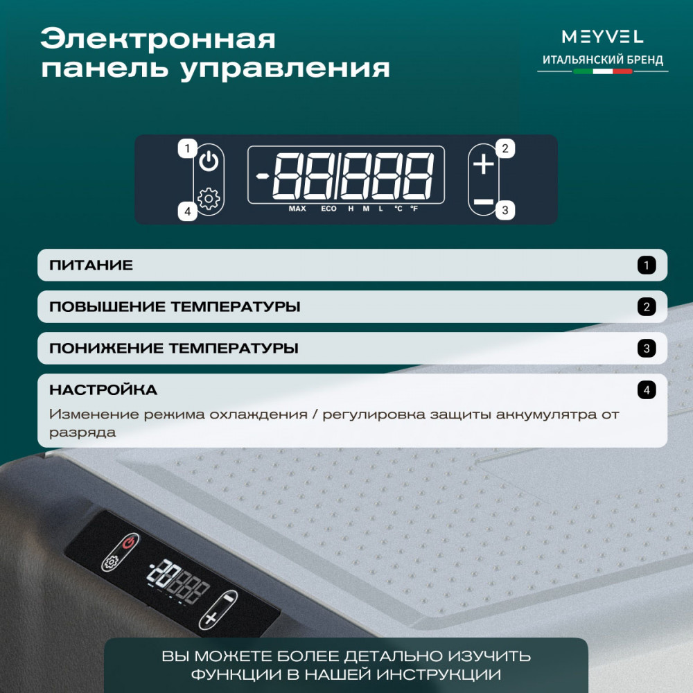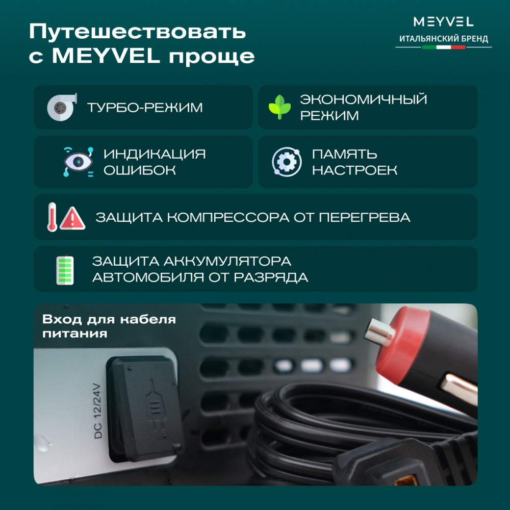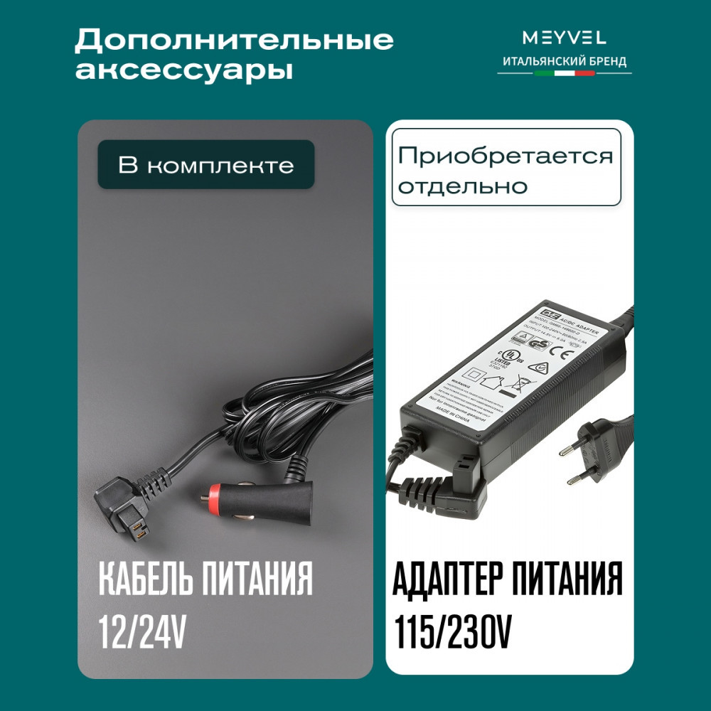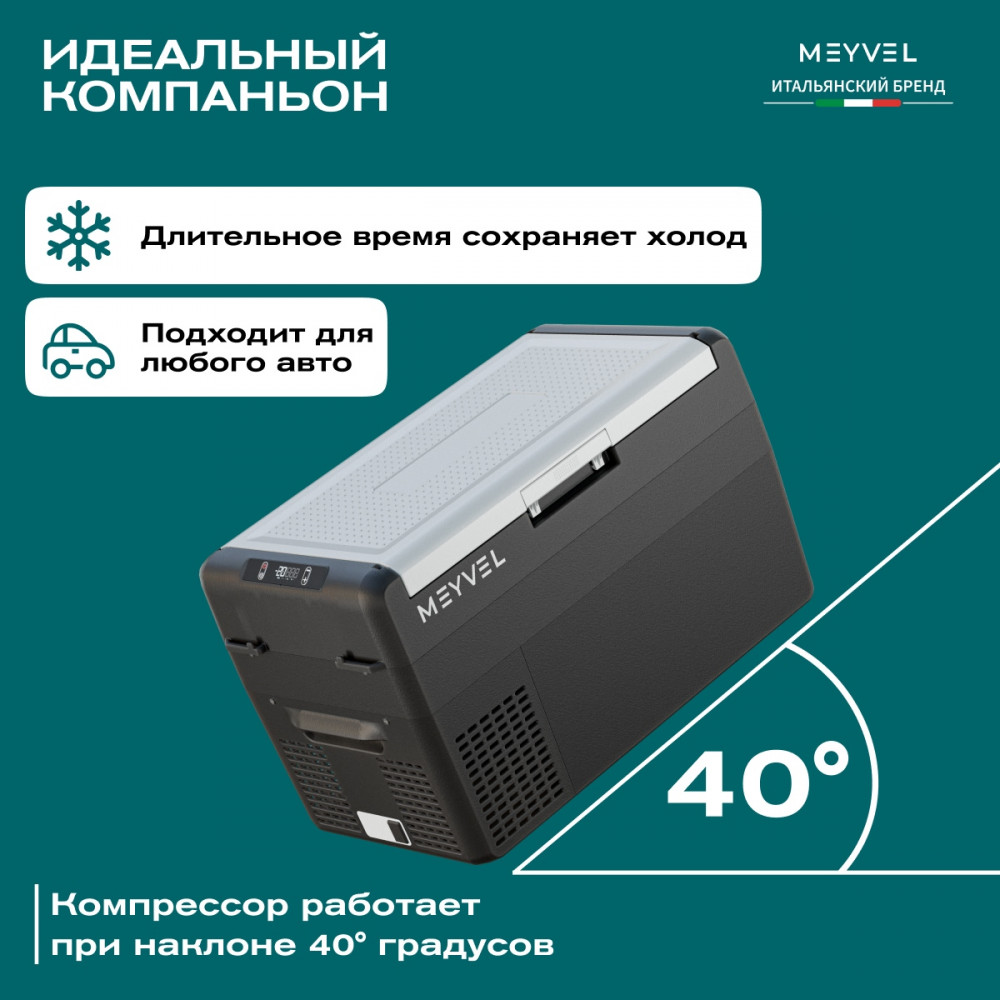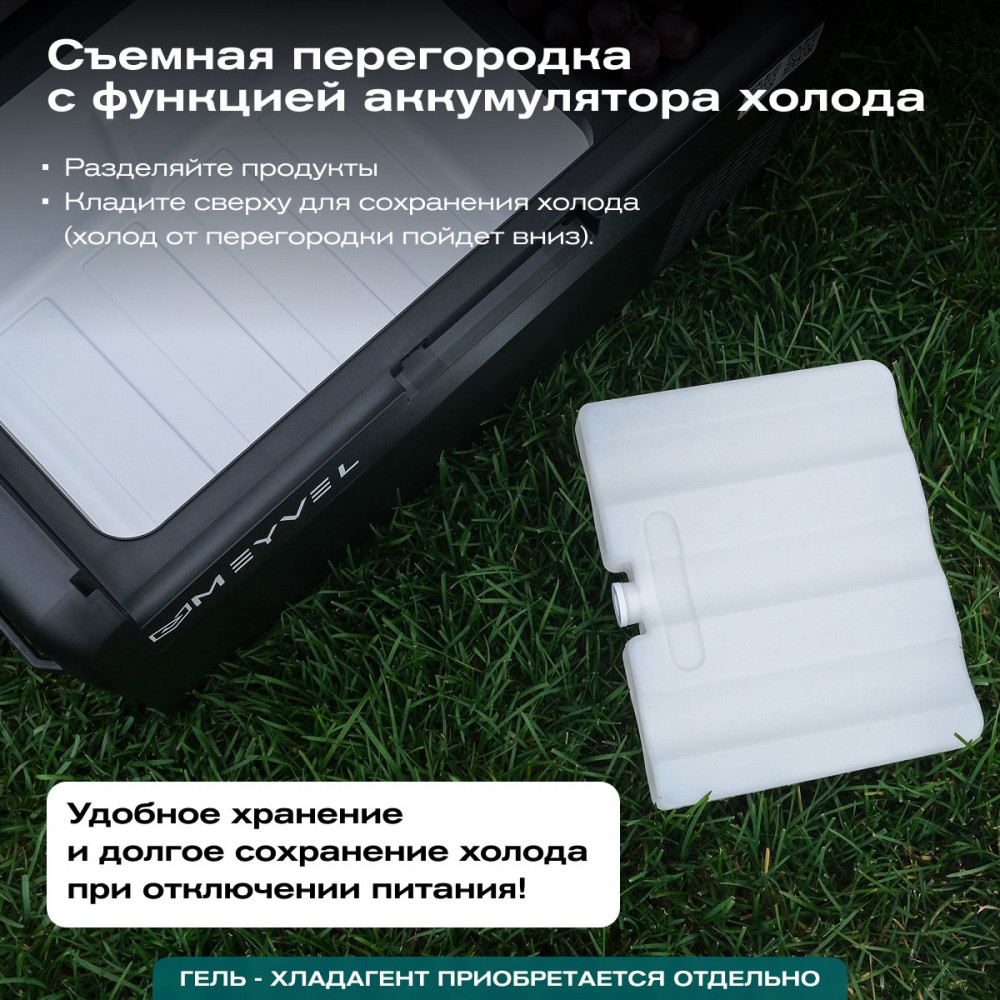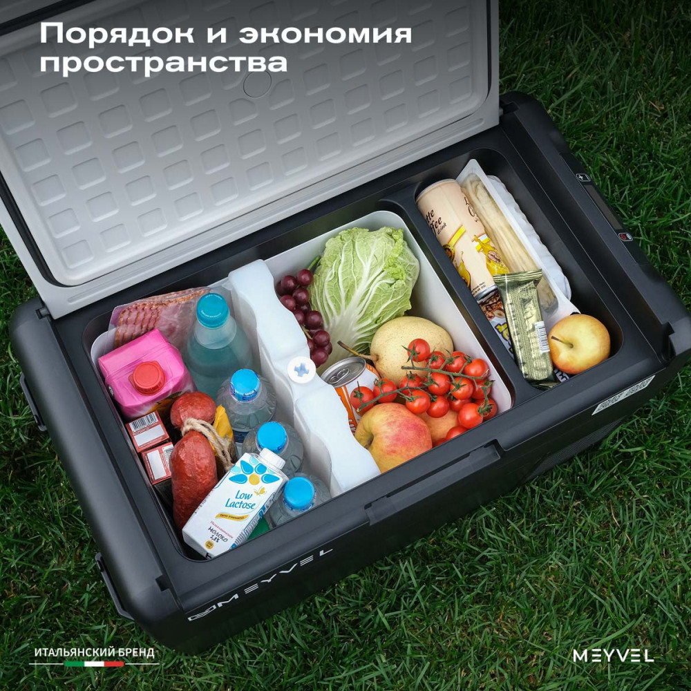 ОписаниеПереносной автохолодильник Meyvel AF-L25 ЛЕДЯНОЙ (ICE) Компактный компрессорный автохолодильник Meyvel AF-L25 ЛЕДЯНОЙ (ICE) на 25 л — это практичное решение для тех, кто проводит много времени в дороге. Он поддерживает температуру от -20 до +20°C и одинаково эффективно справляется с охлаждением и полноценной заморозкой. Будь то охлаждённые напитки в летнюю жару или замороженные продукты в длительной поездке — этот автохолодильник не подведёт. Он подойдёт и для отдыха на природе, и для дальних рейсов дальнобойщиков, и даже для хранения еды на даче. Надёжность в деталях Одна из ключевых особенностей модели AF-L25 ЛЕДЯНОЙ (ICE) — аккумулятор холода. Это не батарея в привычном понимании, а специальный термоаккумулирующий блок, который накапливает холод и поддерживает низкую температуру в камере даже при отключении питания. Особенно полезно, если вы временно оставили холодильник без сети: продукты не испортятся, пока вы в пути. ВАЖНО: ЗАЛИВАЙТЕ В АККУМУЛЯТОР ХОЛОДА ТОЛЬКО СПЕЦИАЛЬНУЮ ЖИДКОСТЬ ДЛЯ АККУМУЛЯТОРА ХОЛОДА (2 Л). ЗАЛИВАТЬ ВОДУ И ДРУГИЕ ЖИДКОСТИ КАТЕГОРИЧЕСКИ ЗАПРЕЩЕНО. Также стоит отметить трёхуровневую систему защиты от разряда аккумулятора автомобиля. Устройство автоматически следит за уровнем заряда бортовой сети и, при достижении критического значения, отключается, чтобы не посадить аккумулятор. Это особенно важно для путешественников, использующих холодильник в режиме длительного ожидания. Точное поддержание температуры Благодаря системе автоматического контроля, Meyvel AF-L25 ЛЕДЯНОЙ (ICE) самостоятельно регулирует работу компрессора, поддерживая заданную температуру без скачков. Это значит, что вы можете положиться на стабильные условия хранения даже в сильную жару. Дополнительный плюс — выбор между режимами Mакимальный и Экономичный. В первом случае компрессор работает на полную мощность, быстро достигая нужной температуры. Экономичный, в свою очередь, экономит энергию, чтобы дольше использовать питание от аккумулятора и снижая нагрузку на электросеть автомобиля. Гибкость подключения Meyvel AF-L25 ЛЕДЯНОЙ (ICE) легко адаптируется под разные источники питания. В дороге он подключается к прикуривателю автомобиля — подходит как для 12 В, так и для 24 В. А если вы хотите использовать его дома или на даче достаточно приобрести адаптер и подключить к обычной розетке 220 В. Это расширяет возможности: один холодильник — и для машины, и для загородного дома. Умное управление AF-L25 ЛЕДЯНОЙ (ICE) можно настраивать и контролировать через мобильное приложение. Это особенно удобно, если автохолодильник установлен в багажнике или труднодоступном месте: не нужно каждый раз наклоняться к панели управления. Вы можете задать температуру, переключить режим или проверить текущее состояние устройства прямо со смартфона. Бесшумный помощник Холодильник не мешает отдыху и не раздражает посторонними звуками, потому что не издает звуки громче 35 дБ. Его практически не слышно даже ночью в салоне автомобиля или в палатке. Поэтому он — идеальное решение для тех, кто ценит комфорт в любых условиях. Дизайн и эргономика Meyvel AF-L25 ЛЕДЯНОЙ (ICE) спроектирован так, чтобы быть максимально удобным в повседневной эксплуатации. Устройство оснащено надёжными ручками для переноски и крышкой с защёлкой, которая не откроется при движении или случайном толчке. Благодаря компа