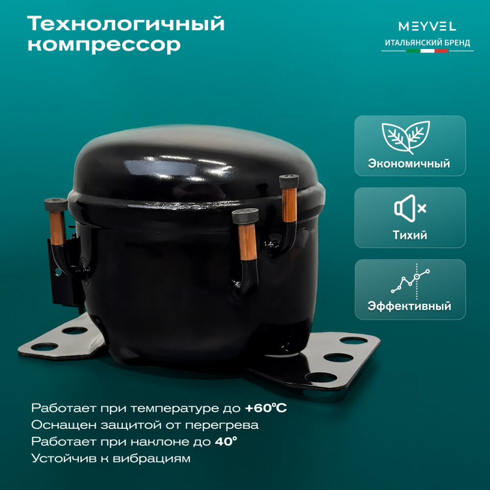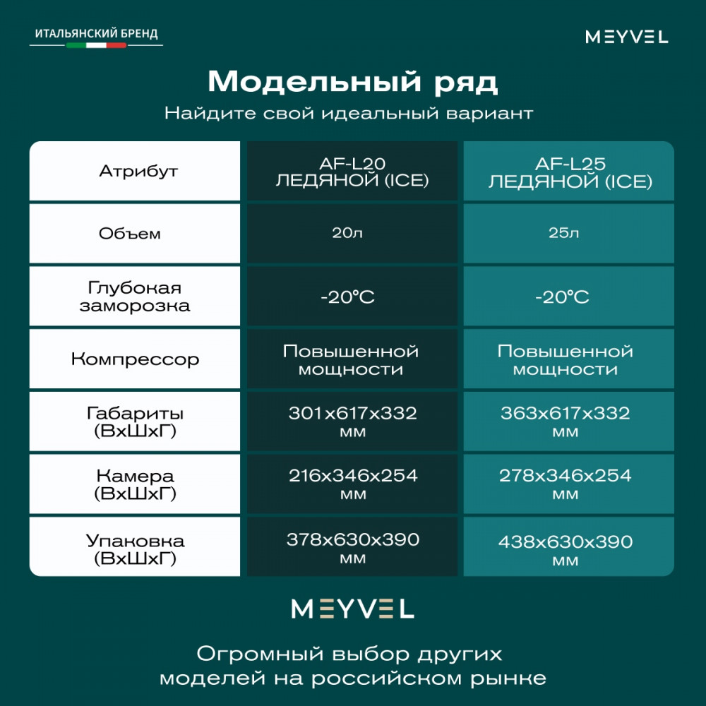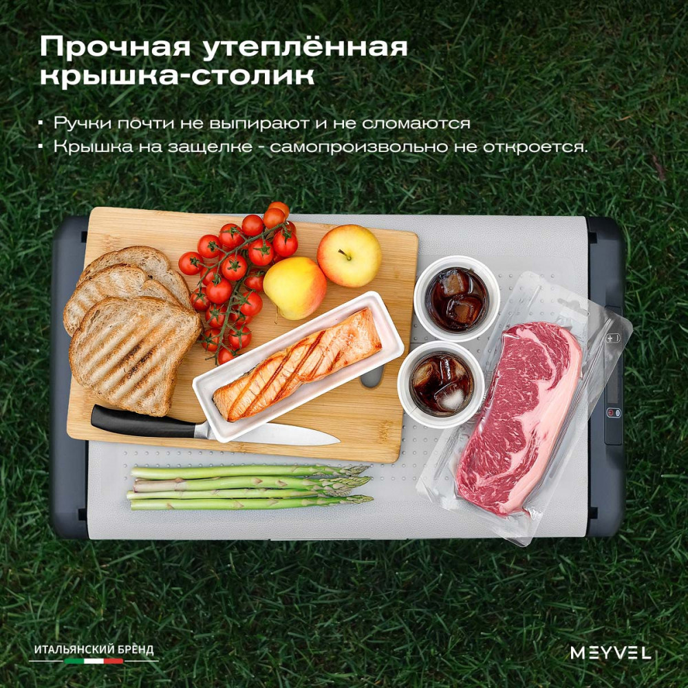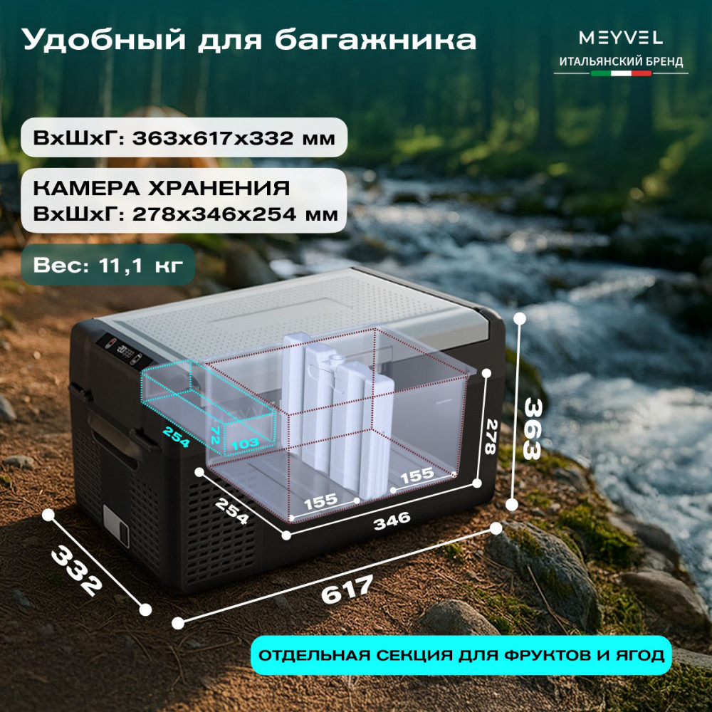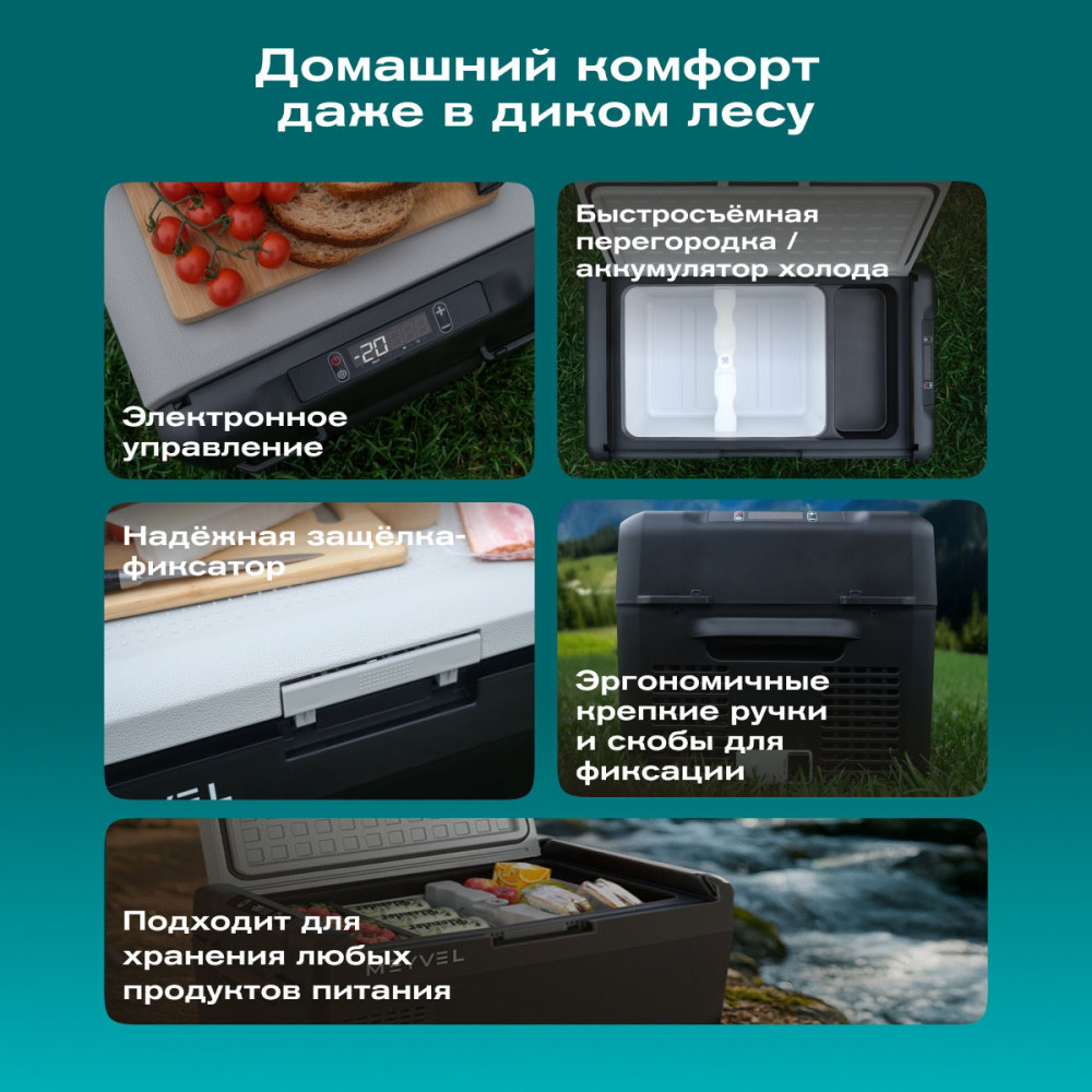 ОписаниеПереносной автохолодильник Meyvel AF-L25 ЛЕДЯНОЙ (ICE) Компактный компрессорный автохолодильник Meyvel AF-L25 ЛЕДЯНОЙ (ICE) на 25 л — это практичное решение для тех, кто проводит много времени в дороге. Он поддерживает температуру от -20 до +20°C и одинаково эффективно справляется с охлаждением и полноценной заморозкой. Будь то охлаждённые напитки в летнюю жару или замороженные продукты в длительной поездке — этот автохолодильник не подведёт. Он подойдёт и для отдыха на природе, и для дальних рейсов дальнобойщиков, и даже для хранения еды на даче. Надёжность в деталях Одна из ключевых особенностей модели AF-L25 ЛЕДЯНОЙ (ICE) — аккумулятор холода. Это не батарея в привычном понимании, а специальный термоаккумулирующий блок, который накапливает холод и поддерживает низкую температуру в камере даже при отключении питания. Особенно полезно, если вы временно оставили холодильник без сети: продукты не испортятся, пока вы в пути. ВАЖНО: ЗАЛИВАЙТЕ В АККУМУЛЯТОР ХОЛОДА ТОЛЬКО СПЕЦИАЛЬНУЮ ЖИДКОСТЬ ДЛЯ АККУМУЛЯТОРА ХОЛОДА (2 Л). ЗАЛИВАТЬ ВОДУ И ДРУГИЕ ЖИДКОСТИ КАТЕГОРИЧЕСКИ ЗАПРЕЩЕНО. Также стоит отметить трёхуровневую систему защиты от разряда аккумулятора автомобиля. Устройство автоматически следит за уровнем заряда бортовой сети и, при достижении критического значения, отключается, чтобы не посадить аккумулятор. Это особенно важно для путешественников, использующих холодильник в режиме длительного ожидания. Точное поддержание температуры Благодаря системе автоматического контроля, Meyvel AF-L25 ЛЕДЯНОЙ (ICE) самостоятельно регулирует работу компрессора, поддерживая заданную температуру без скачков. Это значит, что вы можете положиться на стабильные условия хранения даже в сильную жару. Дополнительный плюс — выбор между режимами Mакимальный и Экономичный. В первом случае компрессор работает на полную мощность, быстро достигая нужной температуры. Экономичный, в свою очередь, экономит энергию, чтобы дольше использовать питание от аккумулятора и снижая нагрузку на электросеть автомобиля. Гибкость подключения Meyvel AF-L25 ЛЕДЯНОЙ (ICE) легко адаптируется под разные источники питания. В дороге он подключается к прикуривателю автомобиля — подходит как для 12 В, так и для 24 В. А если вы хотите использовать его дома или на даче достаточно приобрести адаптер и подключить к обычной розетке 220 В. Это расширяет возможности: один холодильник — и для машины, и для загородного дома. Умное управление AF-L25 ЛЕДЯНОЙ (ICE) можно настраивать и контролировать через мобильное приложение. Это особенно удобно, если автохолодильник установлен в багажнике или труднодоступном месте: не нужно каждый раз наклоняться к панели управления. Вы можете задать температуру, переключить режим или проверить текущее состояние устройства прямо со смартфона. Бесшумный помощник Холодильник не мешает отдыху и не раздражает посторонними звуками, потому что не издает звуки громче 35 дБ. Его практически не слышно даже ночью в салоне автомобиля или в палатке. Поэтому он — идеальное решение для тех, кто ценит комфорт в любых условиях. Дизайн и эргономика Meyvel AF-L25 ЛЕДЯНОЙ (ICE) спроектирован так, чтобы быть максимально удобным в повседневной эксплуатации. Устройство оснащено надёжными ручками для переноски и крышкой с защёлкой, которая не откроется при движении или случайном толчке. Благодаря компа