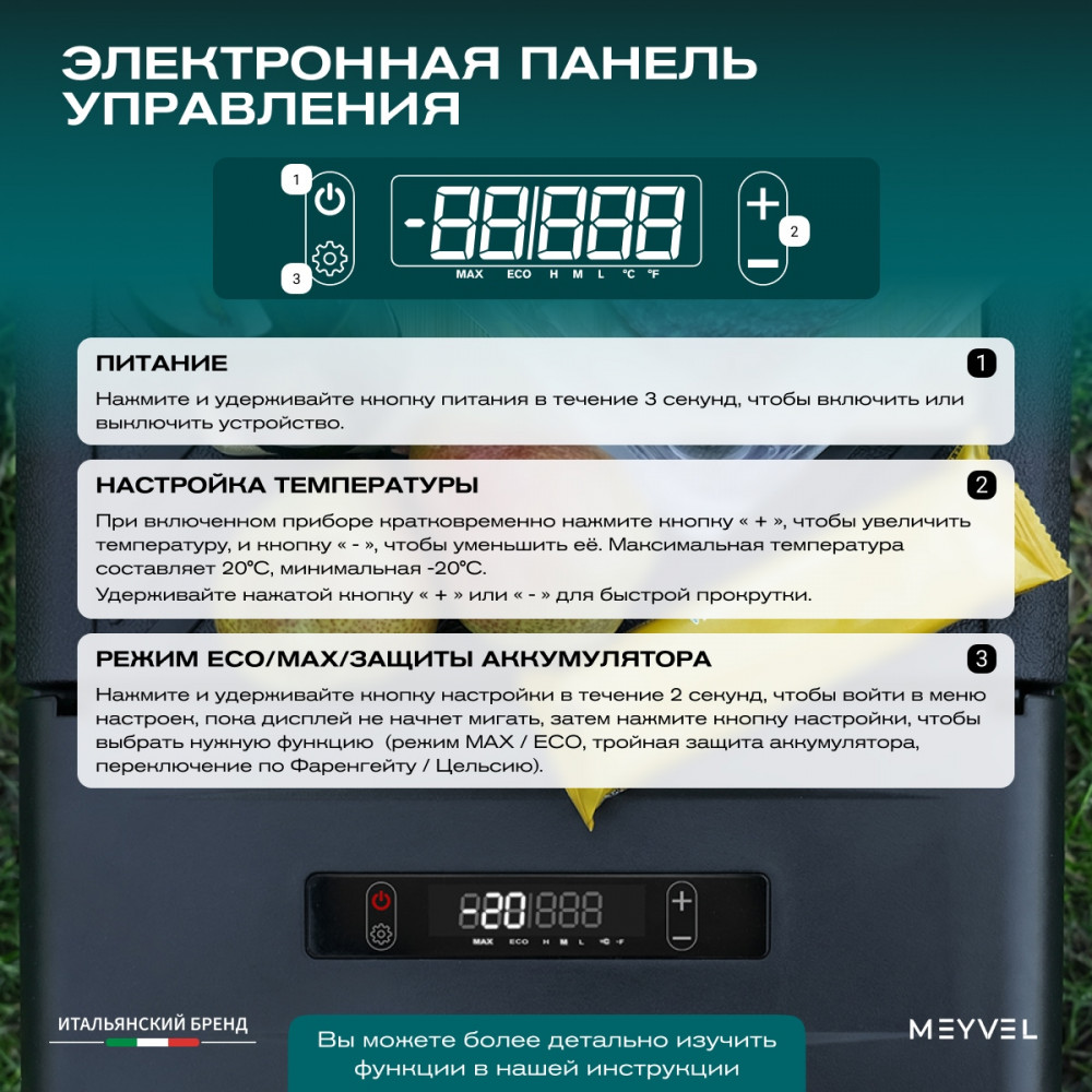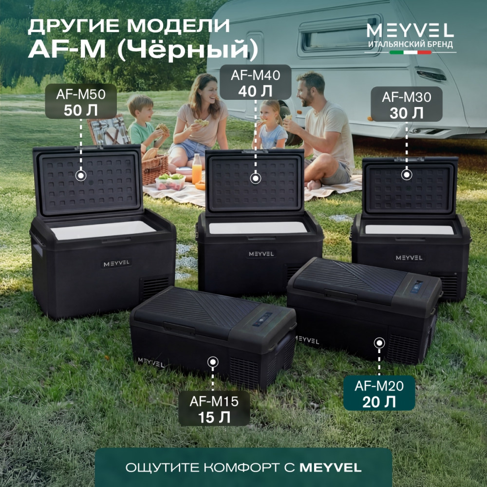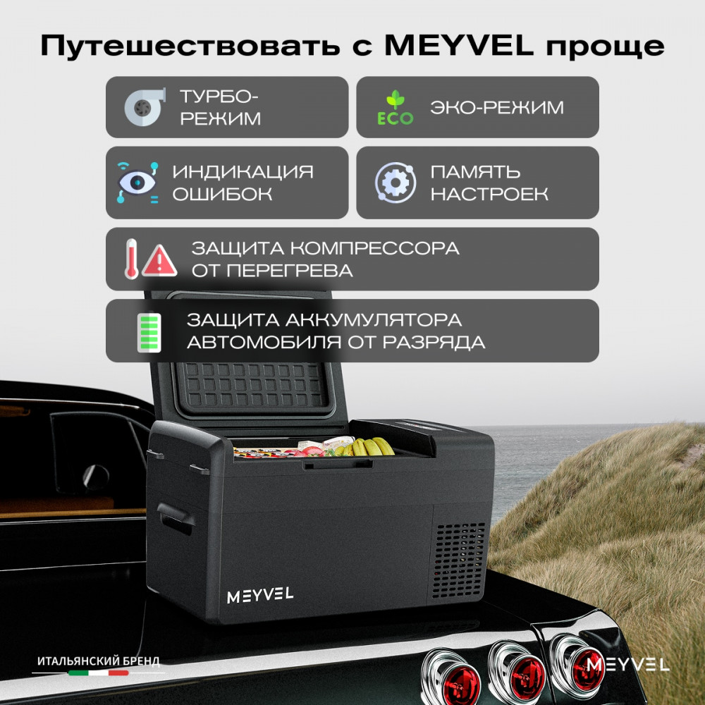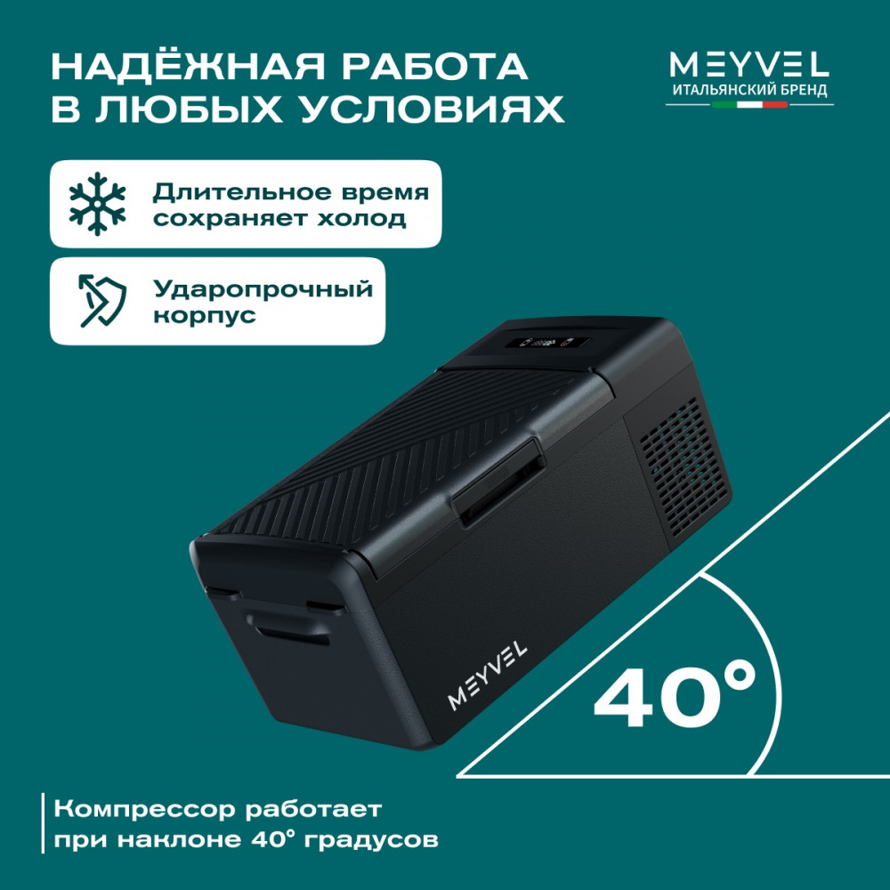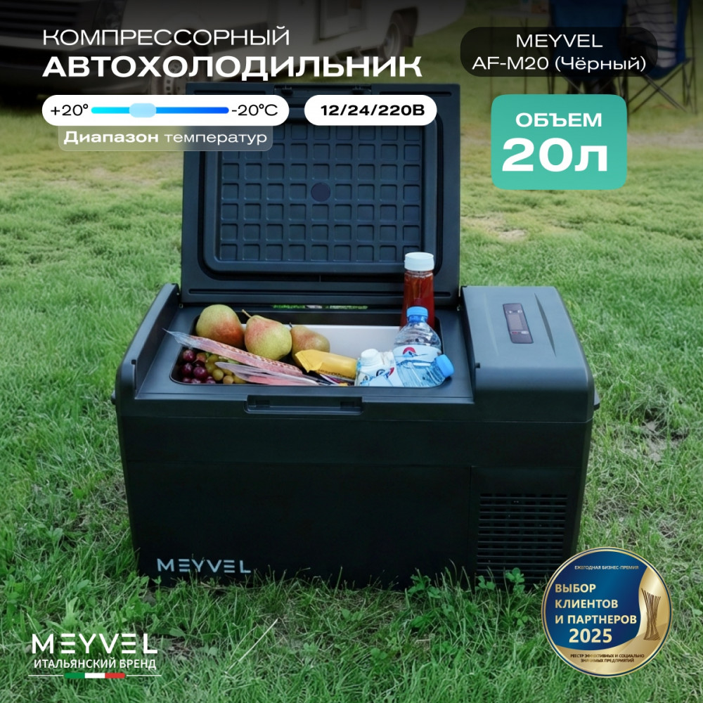 ОписаниеКомпрессорный автохолодильник Meyvel AF-M20 (Чёрный) (Black) Автохолодильник Meyvel AF-M20 (Чёрный) (Black) — это надежное и функциональное устройство, созданное для тех, кто часто путешествует или проводит время на природе. Этот бюджетный и удобный холодильник обеспечит сохранность продуктов и напитков, независимо от условий. Удобство подключения Meyvel AF-M20 (Чёрный) (Black) поддерживает несколько источников питания. Вы можете использовать его в автомобилях, подключив к сети 12/24 В через прикуриватель, или приобрести дополнительный кабель питания на 220 В, чтобы включать устройство в домашних условиях. Емкость и функциональность Емкость однокамерной модели AF-M20 (Чёрный) (Black) — 20 л. Работает как холодильник или морозильник, потому что температурный диапазон варьируется от +20 до -20°С. Поэтому наслаждаться свежими продуктами получится, независимо от того, находитесь ли вы в пути или на отдыхе. Есть два режима работы: максимальный и экономичный. Первый работает на максимальной мощности и быстро достигает заданной температуры, а второй — экономит энергию, постепенно достигая заданной температуры. Понятная панель управления Модуль управления прост и интуитивно понятен. Его удобная панель снабжена дисплеем, на котором отображается текущая температура внутри холодильника. Это помогает легко контролировать ее и при необходимости вносить изменения, обеспечивая оптимальные условия хранения. Тихая работа Meyvel AF-M20 (Чёрный) (Black) работает очень тихо, учитывая современные требования к комфортному использованию, — уровень шума не превышает 35 дБ. Это делает его идеальным выбором для ночных поездок, кемпинга или в случаях, когда важно сохранить тишину. Компактность Корпус изготовлен из прочного пластика и прекрасно изолирован благодаря полиуретановой пене высокой плотности. Это гарантирует долгосрочную эксплуатацию и эффективное сохранение температуры. Благодаря компактным размерам холодильник легко разместить в автомобиле или взять его с собой в поход. Простая транспортировка Холодильник продуман не только функционально, но и с точки зрения удобства использования. У него есть ручки для переноски и предусмотрена защелка крышки, предотвращающая случайное открытие во время движения, что особенно важно при активном использовании. Переносной компрессорный автохолодильник Meyvel AF-M20 (Чёрный) (Black) — это отличное решение для дальнобойщиков, любителей путешествий, пикников и выездов на природу. С его помощью вы сможете легко сохранять свежесть продуктов и охлаждать напитки в любых условиях. Он станет вашим надежным спутником в любом приключении. Преимущества автохолодильника Meyvel AF-M20 (Чёрный) (Black) Поддержание температуры от +20 до -20°С. Низкий уровень шума менее 35 дБ. Внутренний объем 20 л. Компактный и ударопрочный корпус. Защита от разряда аккумулятора. Безопасный и экологически чистый хладагент R134a. Индикация ошибок на дисплее. Подключение через прикуриватель. Защелка крышки и ручка для переноски. Meyvel AF-M20 (Чёрный) (Black) комплектация Автохолодильник. Кабель питания 12/24В. Инструкция. Упаковка.