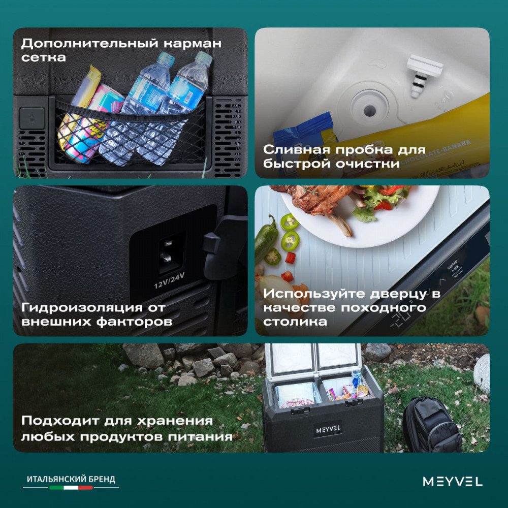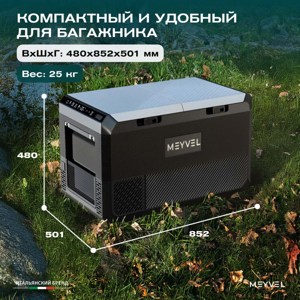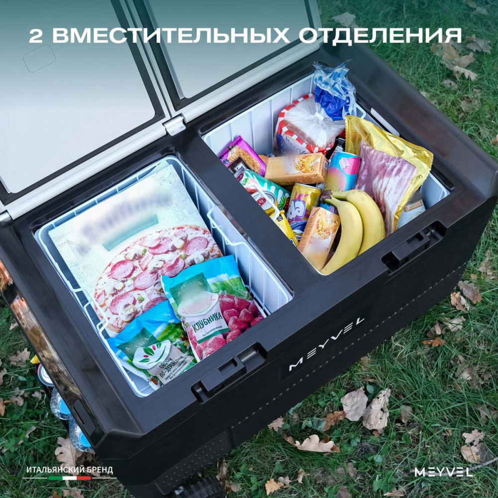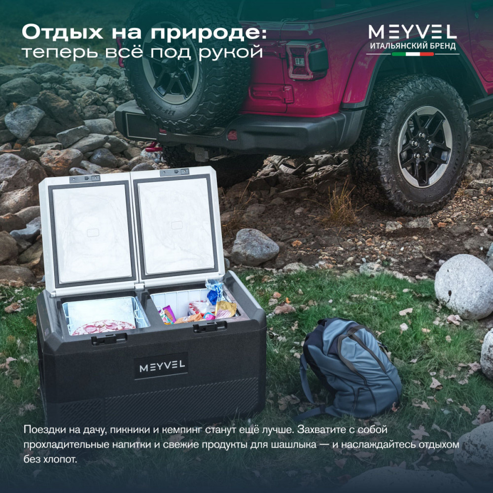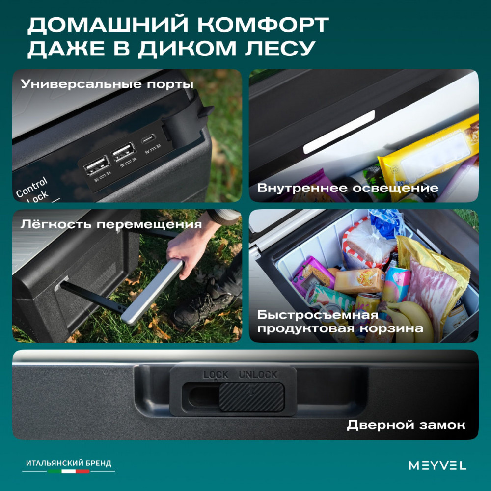 ОписаниеКомпрессорный автохолодильник Meyvel AF-PRO75 Компрессорный переносной автохолодильник Meyvel AF-PRO75 представляет собой идеальное решение для тех, кто ищет надежное и функциональное устройство для хранения еды и напитков в дороге, на пикниках или в условиях кемпинга. Вместимость двухкамерного холодильника, оборудованного корзиной для удобного размещения продуктов, составляет 75 л. Универсальность питания и широкий диапазон температуры Одна из ключевых особенностей Meyvel AF-PRO75 заключается в его универсальности — он работает от различных источников питания. Устройство подключается к прикуривателю автомобиля (12 и 24 В), становясь идеальным компаньоном в путешествиях на дальние расстояния. При желании, используя приобретаемый отдельно адаптер, холодильник также можно подключить к стандартной сети 220 В, что расширяет его возможность использования в любых условиях — будь то на даче, в гостях или в походе. Функциональность модели AF-PRO75 впечатляет, особенно скорость и стабильность поддерживаемой температуры, которая варьируется от +20 до -20°С. Благодаря этому получится не только охлаждать напитки до освежающей температуры, но и использовать одну камеру аппарата в качестве морозилки для глубокой заморозки продуктов, а вторую — как обычный холодильник, что станет отличным вариантом в длительных поездках. Система автоматически поддерживает заданные настройки, гарантируя, что съестное будет храниться в правильных условиях. Устойчивость к вибрациям и тихая работа Компрессор работает под углом наклона до 30°, что делает устройство устойчивым к неровным дорожным условиям и перемещению по пересеченной местности. Уровень шума составляет менее 35 дБ, гарантируя тихую работу и не отвлекая внимание от наслаждения окружающей природой, что особенно важно во время отдыха. Разъемы USB и расширенные настройки Meyvel AF-PRO75 также порадует пользователей своими современными технологическими решениями. Холодильник оснащен двумя USB-разъемами и разъемом Type-C, чтобы одновременно заряжать несколько мобильных устройств или других гаджетов. Управление устройством осуществляется с помощью сенсорной панели, яркость которой можно регулировать в зависимости от окружающего освещения. Более того, панель управления блокируется, чтобы предотвратить случайные изменения настроек. Внутреннее освещение создает удобные условия для поиска нужного продукта, так как его яркость также поддается регулировке, что особенно актуально в темное время суток. Meyvel AF-PRO75 имеет два режима работы: экономичный и турбо. Первый снижает потребление энергии в тех случаях, когда не требуется высокая мощность охлаждения, тогда как второй порадует скоростью достижения заданной температуры. Стильный и практичный дизайн Компактный размер холодильника и наличие ручки для переноски делают его удобным в транспортировке, что является важным аспектом для активных путешественников. В дополнение, пользователи могут приобрести транспортировочный комплект, который значительно упростит переноску. Дверца устройства имеет защелку, обеспечивающую надежное закрытие, а сбоку предусмотрен сетчатый карман. Он идеально подходит для хранения бутылок, снеков или других мелочей, которые могут понадобиться в пути. Преимущества автохолодильника Meyvel AF-PRO75 вместимость 75 л; подключается к прикурива