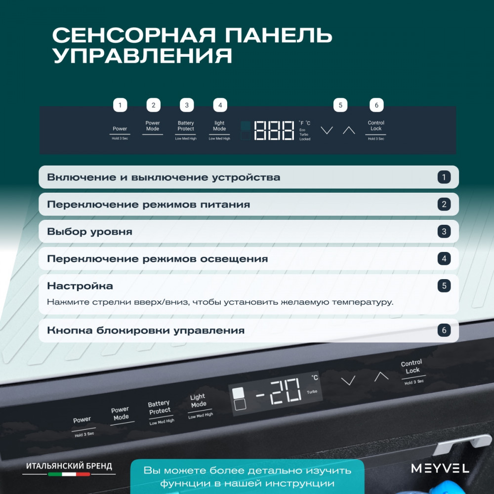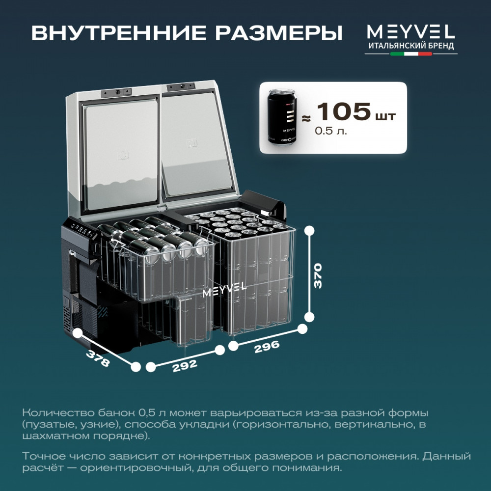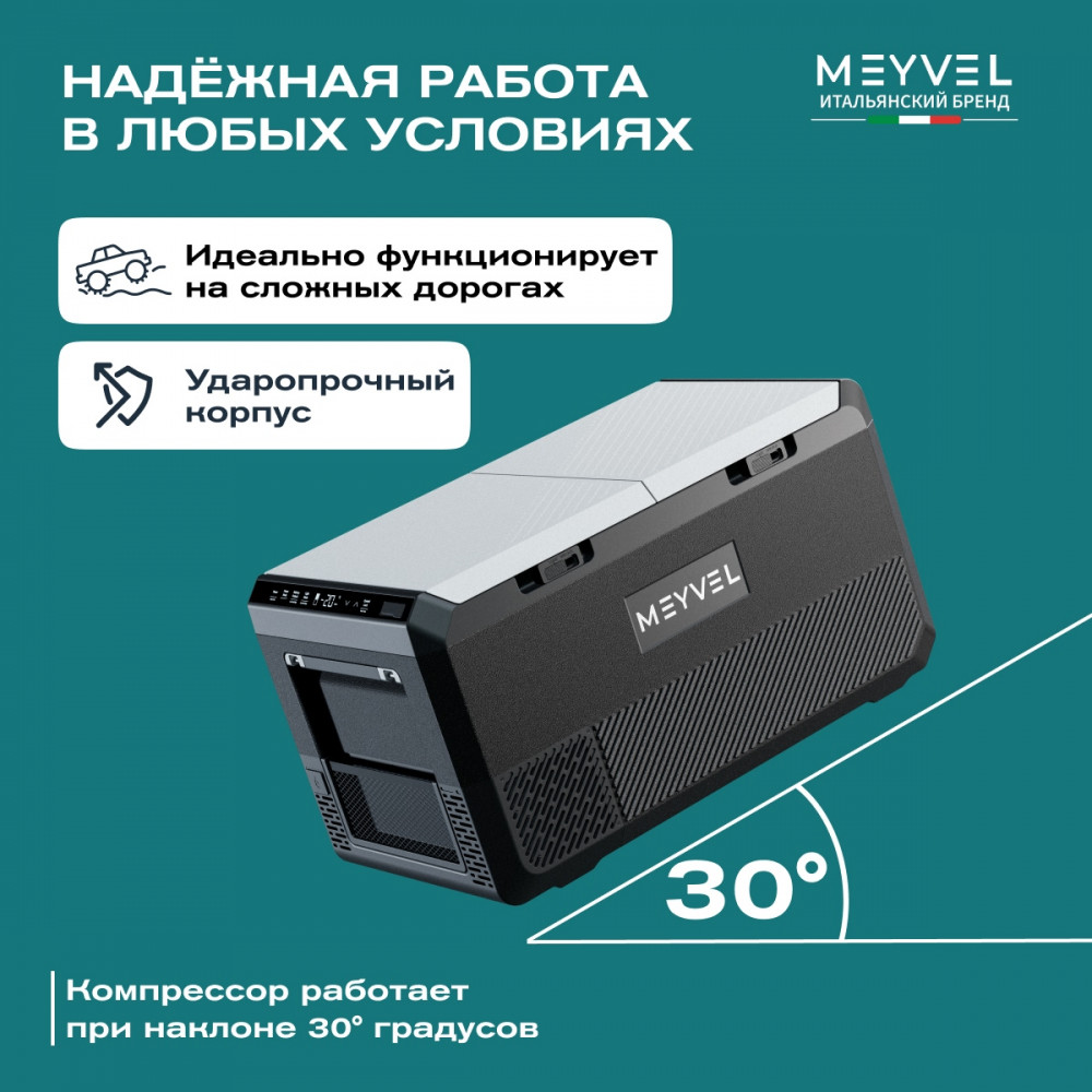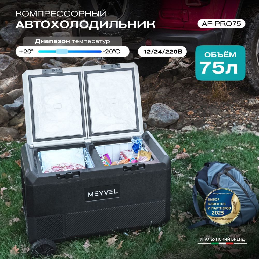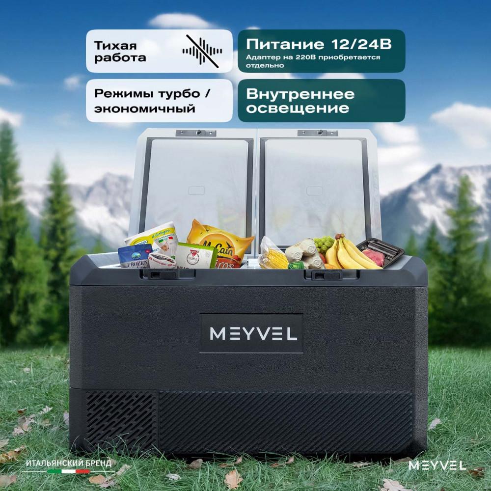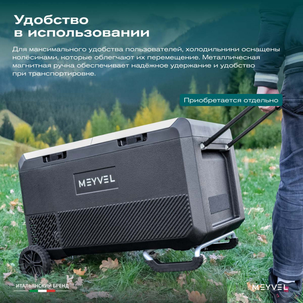ОписаниеКомпрессорный автохолодильник Meyvel AF-PRO75 Компрессорный переносной автохолодильник Meyvel AF-PRO75 представляет собой идеальное решение для тех, кто ищет надежное и функциональное устройство для хранения еды и напитков в дороге, на пикниках или в условиях кемпинга. Вместимость двухкамерного холодильника, оборудованного корзиной для удобного размещения продуктов, составляет 75 л. Универсальность питания и широкий диапазон температуры Одна из ключевых особенностей Meyvel AF-PRO75 заключается в его универсальности — он работает от различных источников питания. Устройство подключается к прикуривателю автомобиля (12 и 24 В), становясь идеальным компаньоном в путешествиях на дальние расстояния. При желании, используя приобретаемый отдельно адаптер, холодильник также можно подключить к стандартной сети 220 В, что расширяет его возможность использования в любых условиях — будь то на даче, в гостях или в походе. Функциональность модели AF-PRO75 впечатляет, особенно скорость и стабильность поддерживаемой температуры, которая варьируется от +20 до -20°С. Благодаря этому получится не только охлаждать напитки до освежающей температуры, но и использовать одну камеру аппарата в качестве морозилки для глубокой заморозки продуктов, а вторую — как обычный холодильник, что станет отличным вариантом в длительных поездках. Система автоматически поддерживает заданные настройки, гарантируя, что съестное будет храниться в правильных условиях. Устойчивость к вибрациям и тихая работа Компрессор работает под углом наклона до 30°, что делает устройство устойчивым к неровным дорожным условиям и перемещению по пересеченной местности. Уровень шума составляет менее 35 дБ, гарантируя тихую работу и не отвлекая внимание от наслаждения окружающей природой, что особенно важно во время отдыха. Разъемы USB и расширенные настройки Meyvel AF-PRO75 также порадует пользователей своими современными технологическими решениями. Холодильник оснащен двумя USB-разъемами и разъемом Type-C, чтобы одновременно заряжать несколько мобильных устройств или других гаджетов. Управление устройством осуществляется с помощью сенсорной панели, яркость которой можно регулировать в зависимости от окружающего освещения. Более того, панель управления блокируется, чтобы предотвратить случайные изменения настроек. Внутреннее освещение создает удобные условия для поиска нужного продукта, так как его яркость также поддается регулировке, что особенно актуально в темное время суток. Meyvel AF-PRO75 имеет два режима работы: экономичный и турбо. Первый снижает потребление энергии в тех случаях, когда не требуется высокая мощность охлаждения, тогда как второй порадует скоростью достижения заданной температуры. Стильный и практичный дизайн Компактный размер холодильника и наличие ручки для переноски делают его удобным в транспортировке, что является важным аспектом для активных путешественников. В дополнение, пользователи могут приобрести транспортировочный комплект, который значительно упростит переноску. Дверца устройства имеет защелку, обеспечивающую надежное закрытие, а сбоку предусмотрен сетчатый карман. Он идеально подходит для хранения бутылок, снеков или других мелочей, которые могут понадобиться в пути. Преимущества автохолодильника Meyvel AF-PRO75 вместимость 75 л; подключается к прикурива