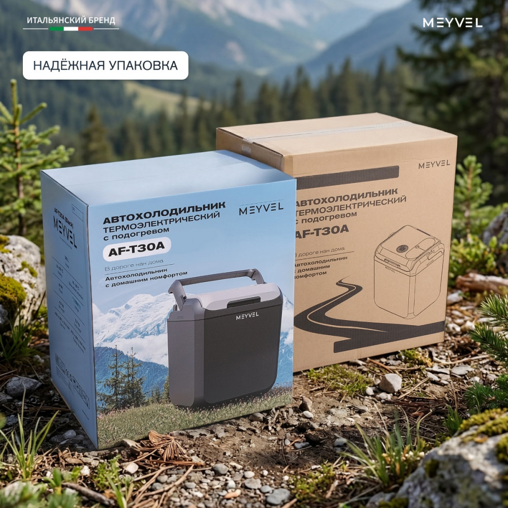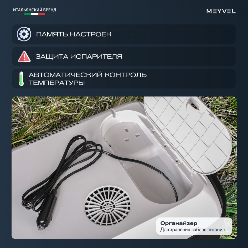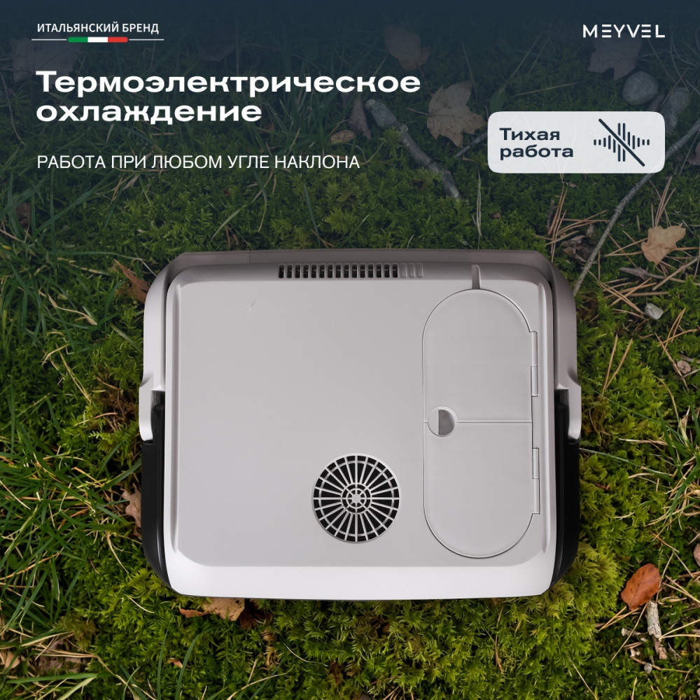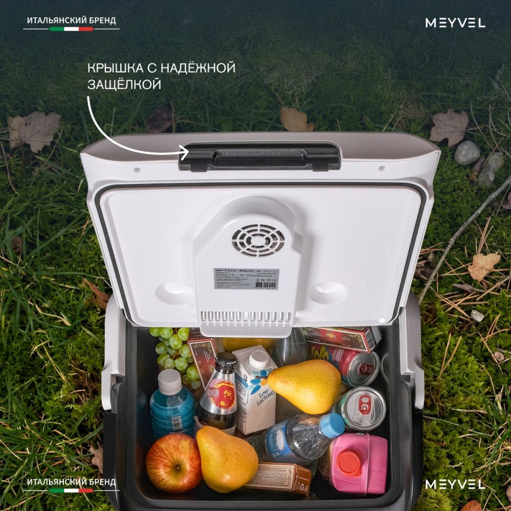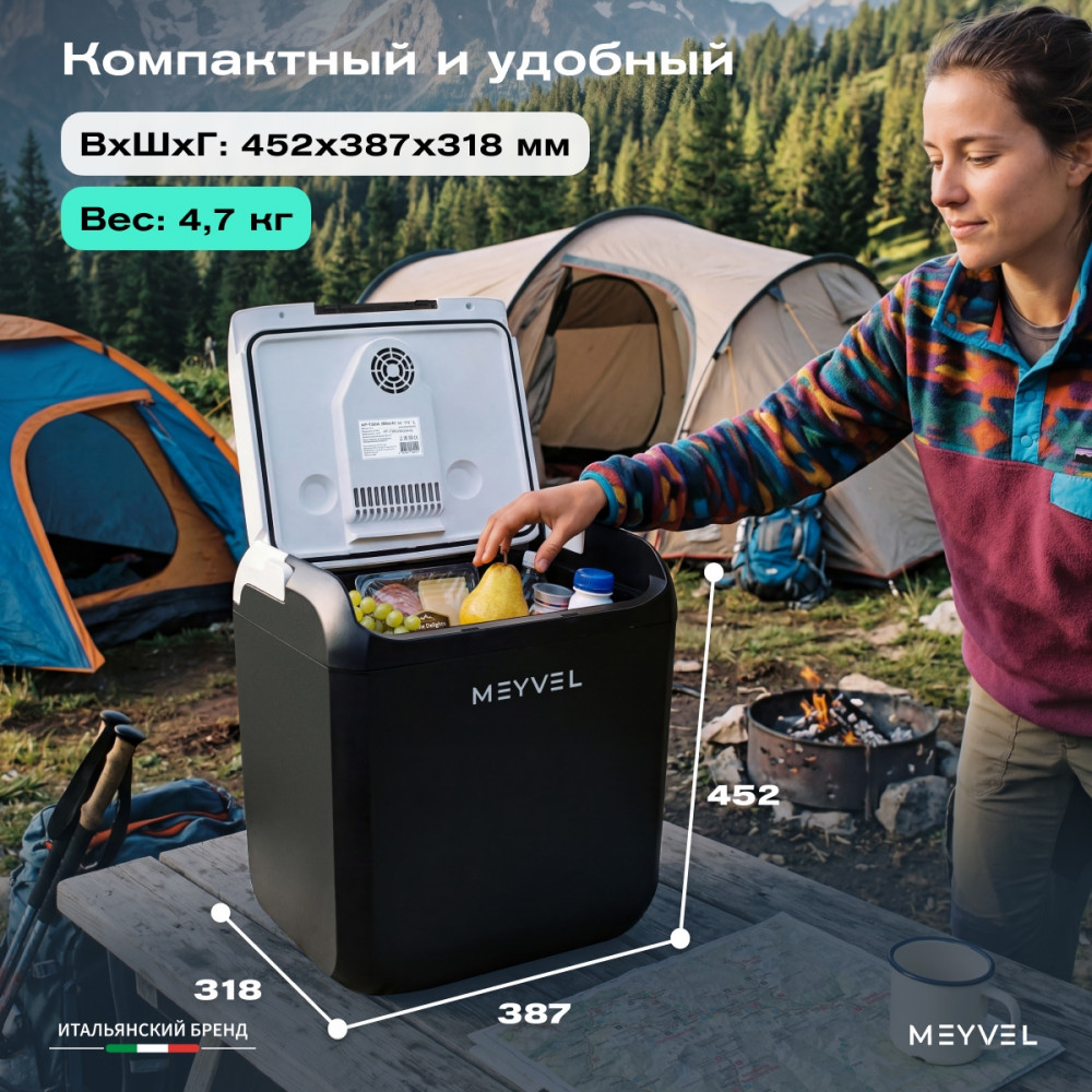 ОписаниеКомпактный термоэлектрический автохолодильник Meyvel AF-T30A (Чёрный) (Black) Автохолодильник Meyvel AF-T30A (Чёрный) (Black) — это небольшой, но удивительно функциональный дорожный мини-холодильник объёмом 30 л. Его берут в поездки, на рыбалку, в путешествия и даже просто на пикники. Он охлаждает напитки, подогревает еду и работает от прикуривателя, что идеально, когда хочется комфорта в любом месте. Формат, который удивляет удобством AF-T30A (Чёрный) (Black) компактен и умещается практически в любом салоне. Но при столь скромных габаритах он остаётся полноценным устройством: внутри достаточно пространства для нескольких бутылок, ланч-бокса или набора перекусов в дорогу. Термоэлектрическая система охлаждения без компрессора, а значит, работает тихо, не вибрирует и не требует обслуживания. Качественная теплоизоляция удерживает температуру, а плотная крышка не пропускает тепло. Вы можете поставить в него охлаждённые продукты, и они спокойно переживут несколько часов в дороге. Два режима: охлаждение и нагрев Meyvel AF-T30A (Чёрный) (Black) универсален: он охлаждает и умеет подогревать. Режим ОХЛАЖДЕНИЕ (COLD) снижает температуру на 18-20°C относительно окружающей среды. Если на улице +30°C, внутри будет около +10-12°C — идеальный режим для напитков, фруктов и лёгких закусок. Режим НАГРЕВ (HOT) прогревает камеру до +55°C. Это удобно, когда хотите довезти горячий обед. Переключатели «охлаждение», «нагрев» и «выкл» расположены на специальной панели. Важный момент, перед сменой режима стоит выключить устройство на 30 минут, чтобы защитить систему от резких перепадов. Питание и безопасность Автохолодильник работает от 12 В, комплектный кабель подключается к прикуривателю. Чтобы не посадить аккумулятор автомобиля, рекомендуется отключать автохолодильник до выключения зажигания. Это простое правило помогает избежать неприятных сюрпризов в дальней дороге, ведь в устройстве не предусмотрена функция защиты аккумулятора от разряда. Вентиляция: важный нюанс эксплуатации Как и все термоэлектрические модели, AF-T30A (Чёрный) (Black) нуждается в циркуляции воздуха. На корпусе предусмотрены решётки, и им нужно пространство: минимум 100 мм от каждой стороны; не закрывать автохолодильник вещами; периодически очищать вентиляционные отверстия от пыли. Это гарантирует стабильную работу и защищает устройство от перегрева. Преимущества Meyvel AF-T30A (Чёрный) (Black) Компактный формат — легко помещается в любом салоне и не занимает лишнего пространства.Ручка для переноски — удобная транспортировка. Два режима работы — охлаждает на 18-20°C от окружающей среды и подогревает до +55°C. Тихая термоэлектрическая система — отсутствие вибраций и минимальный шум при работе. Простое управление — понятная панель с тремя положениями: холод, тепло, выключение.Работа при любом угле наклона. Экономичное питание — работает от 12 В. Универсальность использования — подходит для напитков, перекусов, горячих блюд и хранения продуктов в дороге. Минимальный уход — термоэлектрическая система не требует обслуживания и проста в чистке. Meyvel AF-T30A (Чёрный) (Black) — это простой, компактный, но удивительно практичный автохолодильник. Он сочетает тихую работу, надёжность и возможность как охлаждать, так и подогревать продукты. Для тех, кто много времени проводит в пути или любит комфорт на природе — отличный выбор.