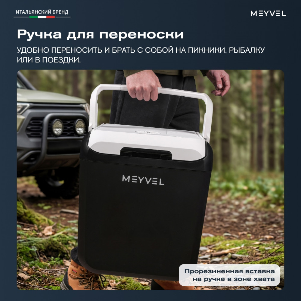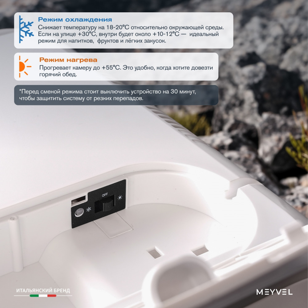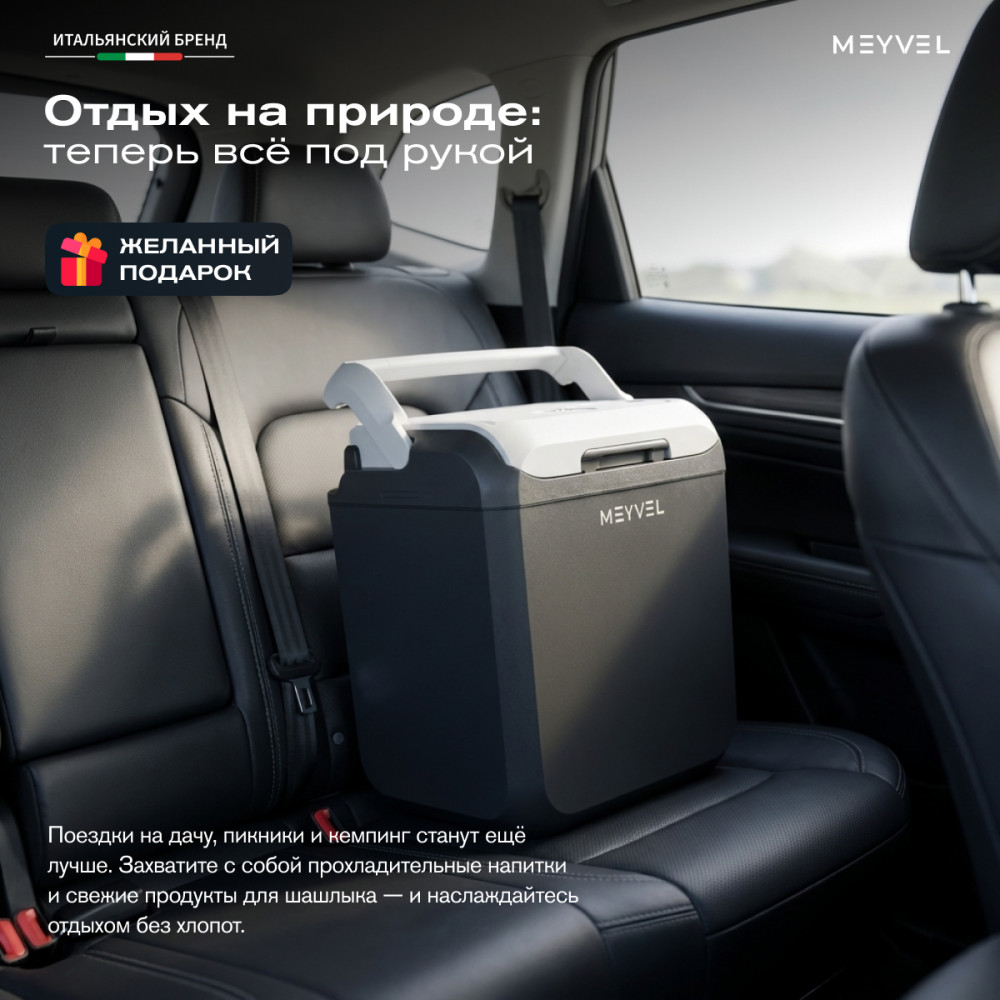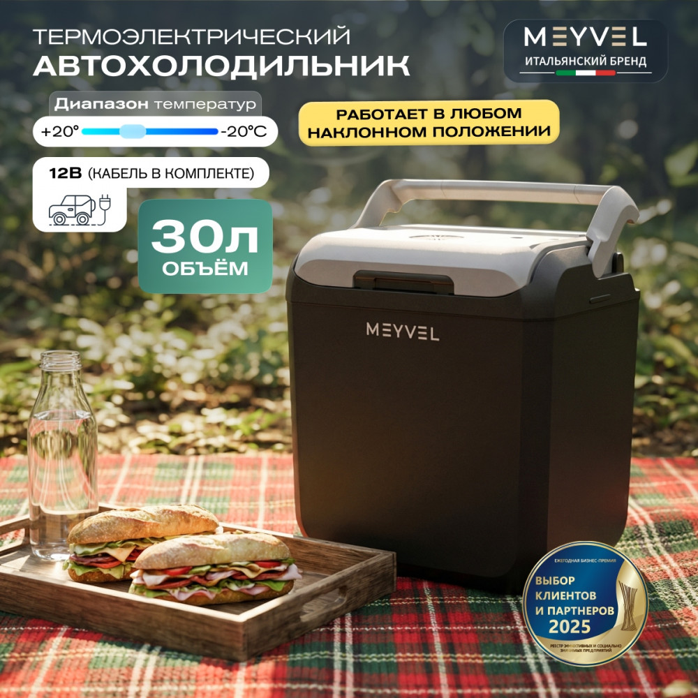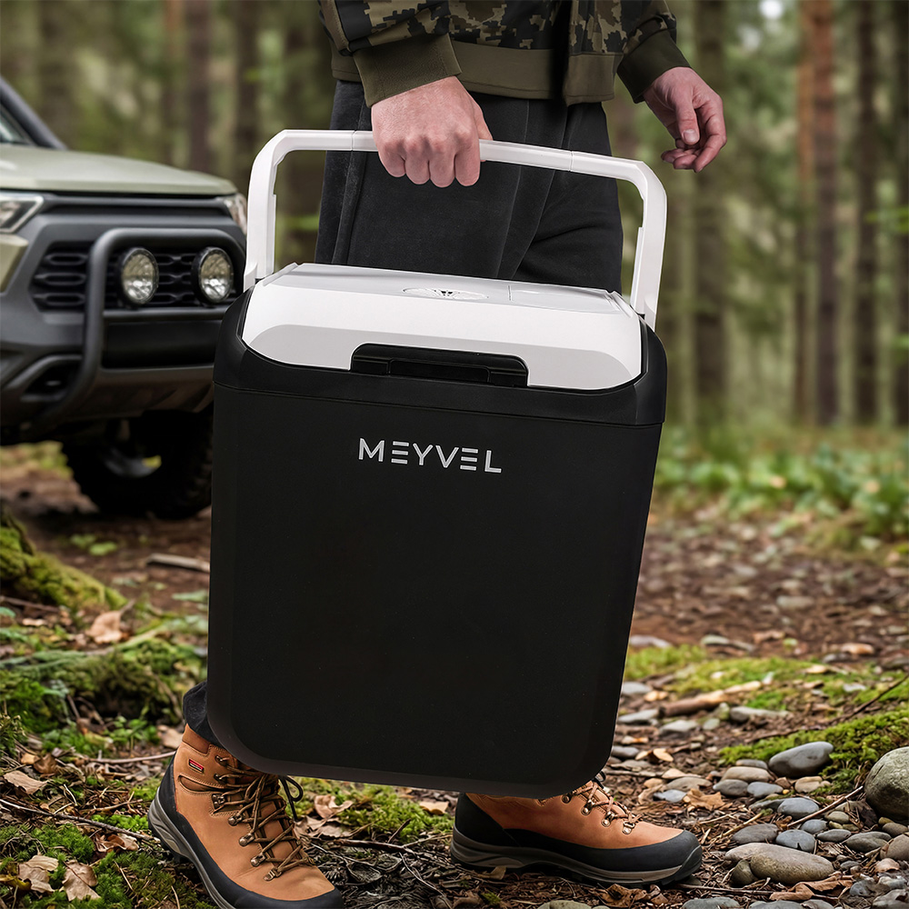 ОписаниеКомпактный термоэлектрический автохолодильник Meyvel AF-T30A (Чёрный) (Black) Автохолодильник Meyvel AF-T30A (Чёрный) (Black) — это небольшой, но удивительно функциональный дорожный мини-холодильник объёмом 30 л. Его берут в поездки, на рыбалку, в путешествия и даже просто на пикники. Он охлаждает напитки, подогревает еду и работает от прикуривателя, что идеально, когда хочется комфорта в любом месте. Формат, который удивляет удобством AF-T30A (Чёрный) (Black) компактен и умещается практически в любом салоне. Но при столь скромных габаритах он остаётся полноценным устройством: внутри достаточно пространства для нескольких бутылок, ланч-бокса или набора перекусов в дорогу. Термоэлектрическая система охлаждения без компрессора, а значит, работает тихо, не вибрирует и не требует обслуживания. Качественная теплоизоляция удерживает температуру, а плотная крышка не пропускает тепло. Вы можете поставить в него охлаждённые продукты, и они спокойно переживут несколько часов в дороге. Два режима: охлаждение и нагрев Meyvel AF-T30A (Чёрный) (Black) универсален: он охлаждает и умеет подогревать. Режим ОХЛАЖДЕНИЕ (COLD) снижает температуру на 18-20°C относительно окружающей среды. Если на улице +30°C, внутри будет около +10-12°C — идеальный режим для напитков, фруктов и лёгких закусок. Режим НАГРЕВ (HOT) прогревает камеру до +55°C. Это удобно, когда хотите довезти горячий обед. Переключатели «охлаждение», «нагрев» и «выкл» расположены на специальной панели. Важный момент, перед сменой режима стоит выключить устройство на 30 минут, чтобы защитить систему от резких перепадов. Питание и безопасность Автохолодильник работает от 12 В, комплектный кабель подключается к прикуривателю. Чтобы не посадить аккумулятор автомобиля, рекомендуется отключать автохолодильник до выключения зажигания. Это простое правило помогает избежать неприятных сюрпризов в дальней дороге, ведь в устройстве не предусмотрена функция защиты аккумулятора от разряда. Вентиляция: важный нюанс эксплуатации Как и все термоэлектрические модели, AF-T30A (Чёрный) (Black) нуждается в циркуляции воздуха. На корпусе предусмотрены решётки, и им нужно пространство: минимум 100 мм от каждой стороны; не закрывать автохолодильник вещами; периодически очищать вентиляционные отверстия от пыли. Это гарантирует стабильную работу и защищает устройство от перегрева. Преимущества Meyvel AF-T30A (Чёрный) (Black) Компактный формат — легко помещается в любом салоне и не занимает лишнего пространства.Ручка для переноски — удобная транспортировка. Два режима работы — охлаждает на 18-20°C от окружающей среды и подогревает до +55°C. Тихая термоэлектрическая система — отсутствие вибраций и минимальный шум при работе. Простое управление — понятная панель с тремя положениями: холод, тепло, выключение.Работа при любом угле наклона. Экономичное питание — работает от 12 В. Универсальность использования — подходит для напитков, перекусов, горячих блюд и хранения продуктов в дороге. Минимальный уход — термоэлектрическая система не требует обслуживания и проста в чистке. Meyvel AF-T30A (Чёрный) (Black) — это простой, компактный, но удивительно практичный автохолодильник. Он сочетает тихую работу, надёжность и возможность как охлаждать, так и подогревать продукты. Для тех, кто много времени проводит в пути или любит комфорт на природе — отличный выбор.