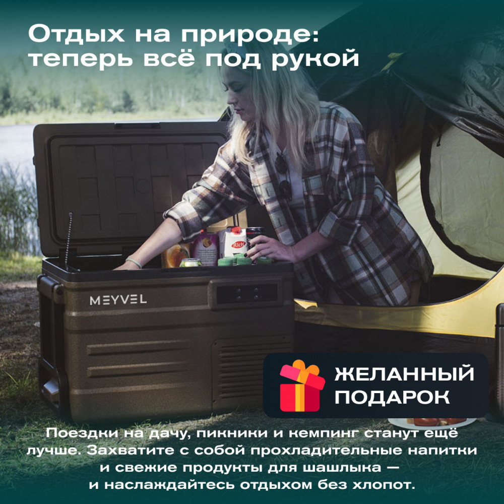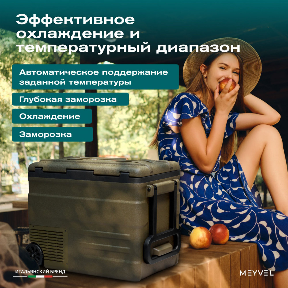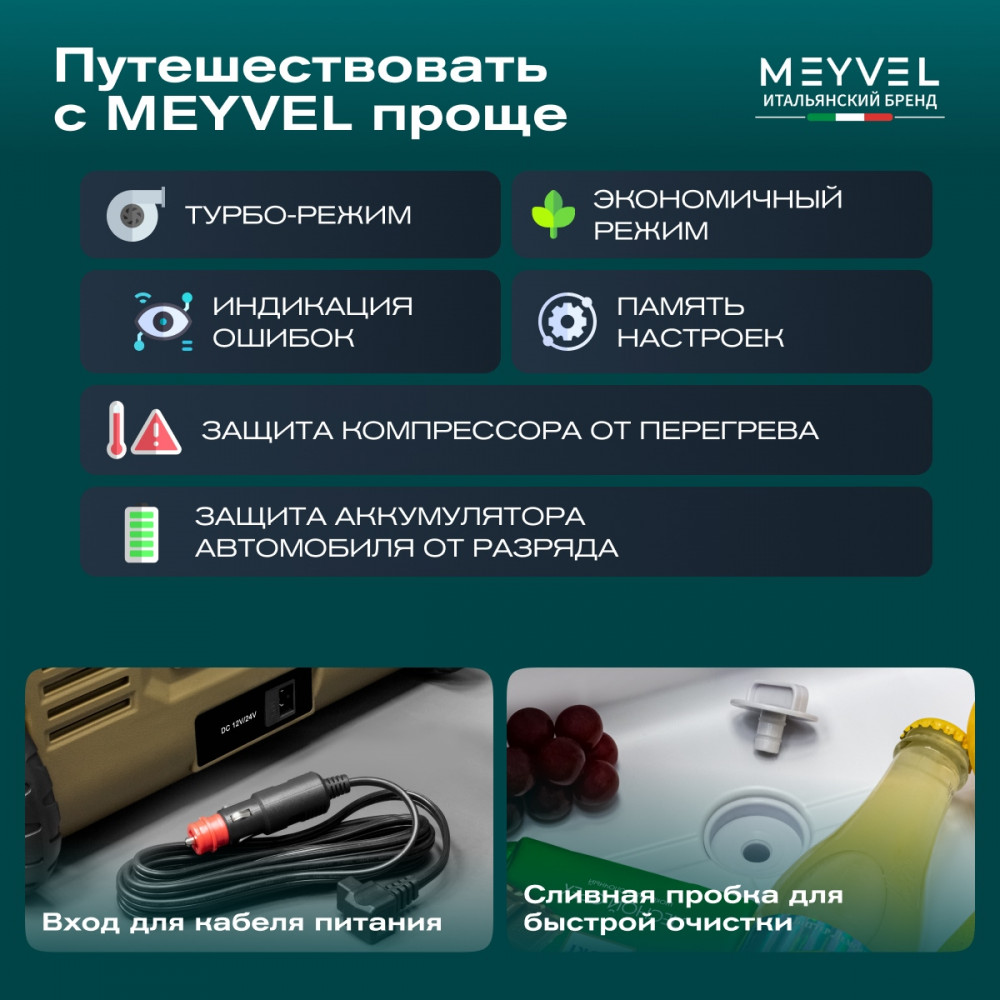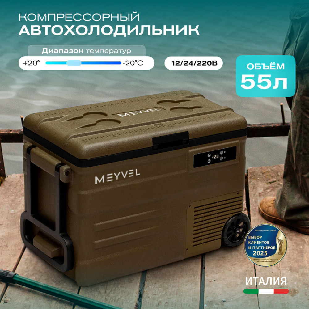 ОписаниеКомпрессорный автохолодильник Meyvel AF-U55-туристический (Meyvel AF-U55-travel) Итальянская компания MEYVEL разработала инновационную модель автомобильного холодильника AF-U55-туристический (AF-U55-travel), который отлично подойдет для транспортировки и хранения продуктов и напитков. Ключевой особенностью данной модели является тихий высокопроизводительный компрессор, имеющий напряжение 12/24 B, с системой защиты от разгерметизации. Благодаря оптимизированному программному обеспечению и регулируемой скорости вращения, Вы можете эффективно поддерживать нужную температуру в дороге и на природе. Автохолодильник закрывается на автоматическую защёлку, что исключает случайное открытие и потерю холода изнутри. AF-U55-туристический (AF-U55-travel) имеет 4 подстаканника, на которых можно надёжно расположить емкости с напитками. Любителей рыбалки, несомненно, порадует наличие на крышке линейки для измерения улова или других трофеев. Благодаря перечисленным особенностям, холодильник идеально подходит для отдыха на природе. Объёмное пространство внутри холодильника позволяет с легкостью разместить в нём большое количество разнообразных продуктов питания, сохраняя качество любимой еды и напитков, даже во время длительного путешествия. Простое и удобное управление На корпусе есть панель управления с дисплеем, с её помощью можно настроить рабочую температуру от +20 °C до -20 °C, автохолодильник будет автоматически поддерживать её. Так же можно выбрать один из двух режимов работы. Режим Максимальный позволит быстро заморозить продукты, благодаря работе на максимальной мощности. Выбрав Экономичный режим работы, холодильник будет дольше достигать заданного значения температуры, но при этом расходует меньше электроэнергии. В случае каких-либо сбоев в работе, на дисплее отображается код ошибки, что подскажет в чём именно проблема. Автохолодильник оснащён ручкой и колёсиками, что обеспечивает удобную ручную транспортировку. Высокие стандарты качества Благодаря использованию качественных комплектующих и высокотехнологичного производства, холодильники обладают высокой эффективностью и надежностью. Приобретая автохолодильник AF-U55-туристический (AF-U55-travel), Вы получите персональную консультацию по эксплуатации, а кроме того, мы гарантируем сервисную поддержку по всей стране. Вам больше не придется прерывать свое путешествие для того, чтобы перекусить в сомнительных закусочных и магазинах. С Meyvel любимая еда и напитки сохранят свой вкус и качество даже во время самого длительного путешествия! Отличительные особенности: внутренний объём – 55 литра; работа 12/24 В; два режима работы: Максимальный и Экономичный; температурный диапазон от +20 °C до -20 °C; охлаждение, заморозка, глубокая заморозка; защита от разрядки аккумулятора автомобиля; максимальный угол наклона компрессора 40°; память настроек; панель управления с дисплеем; индикация ошибок; ручки и колеса для удобной переноски. Видео Автохолодильники AF-U55-туристический