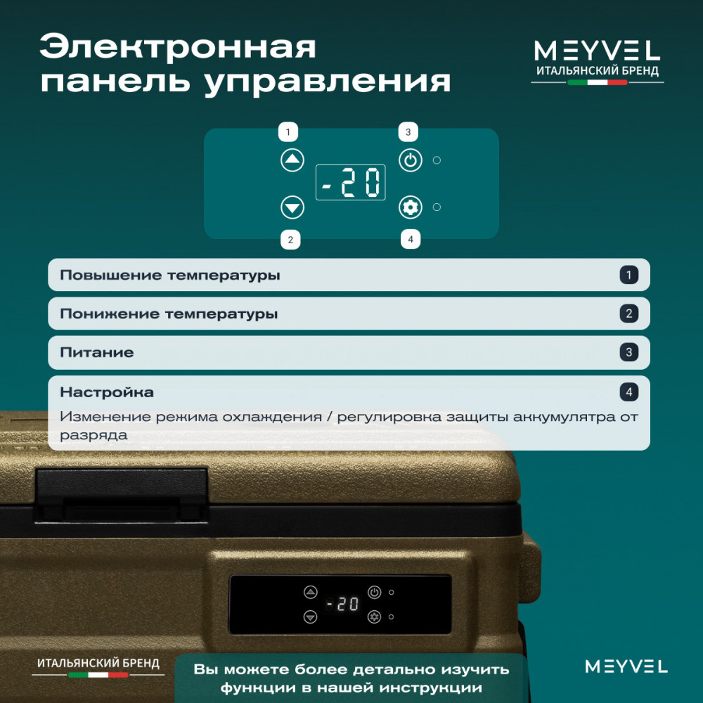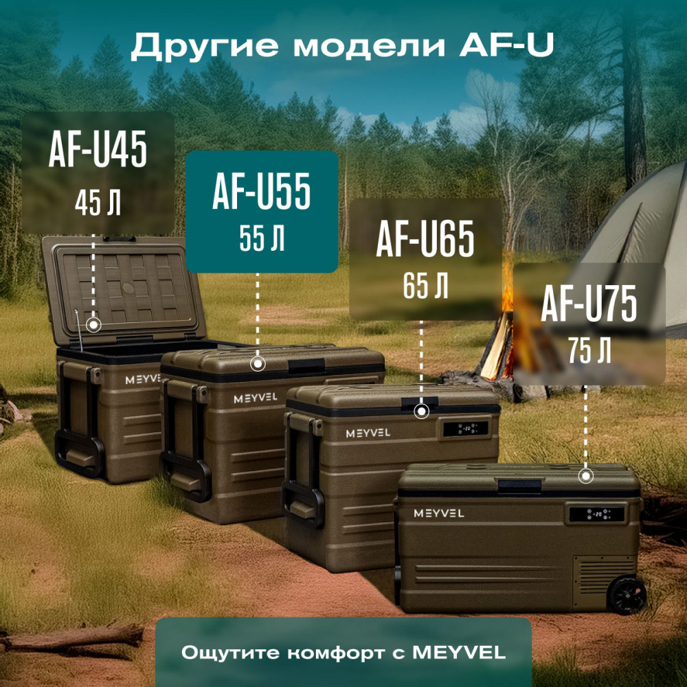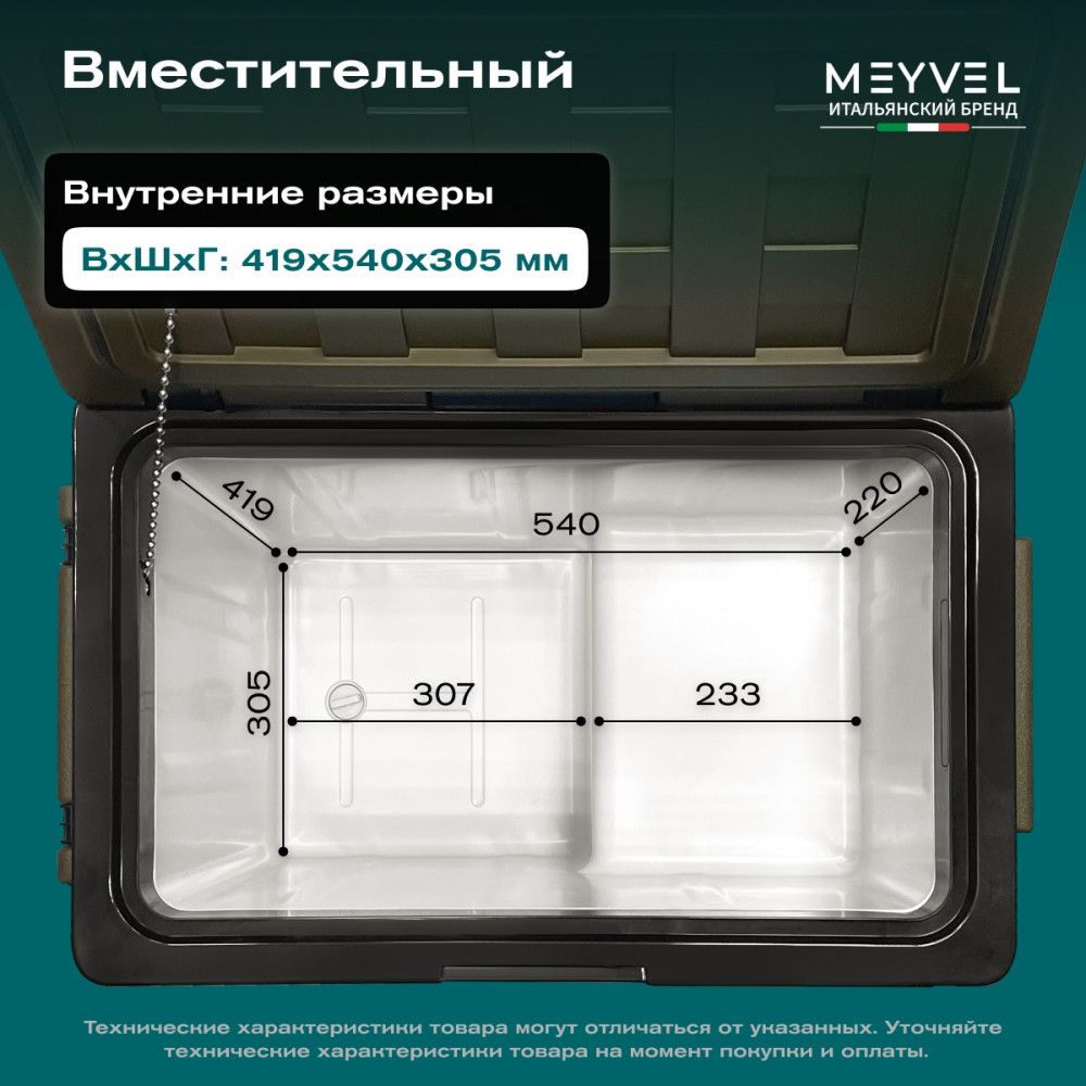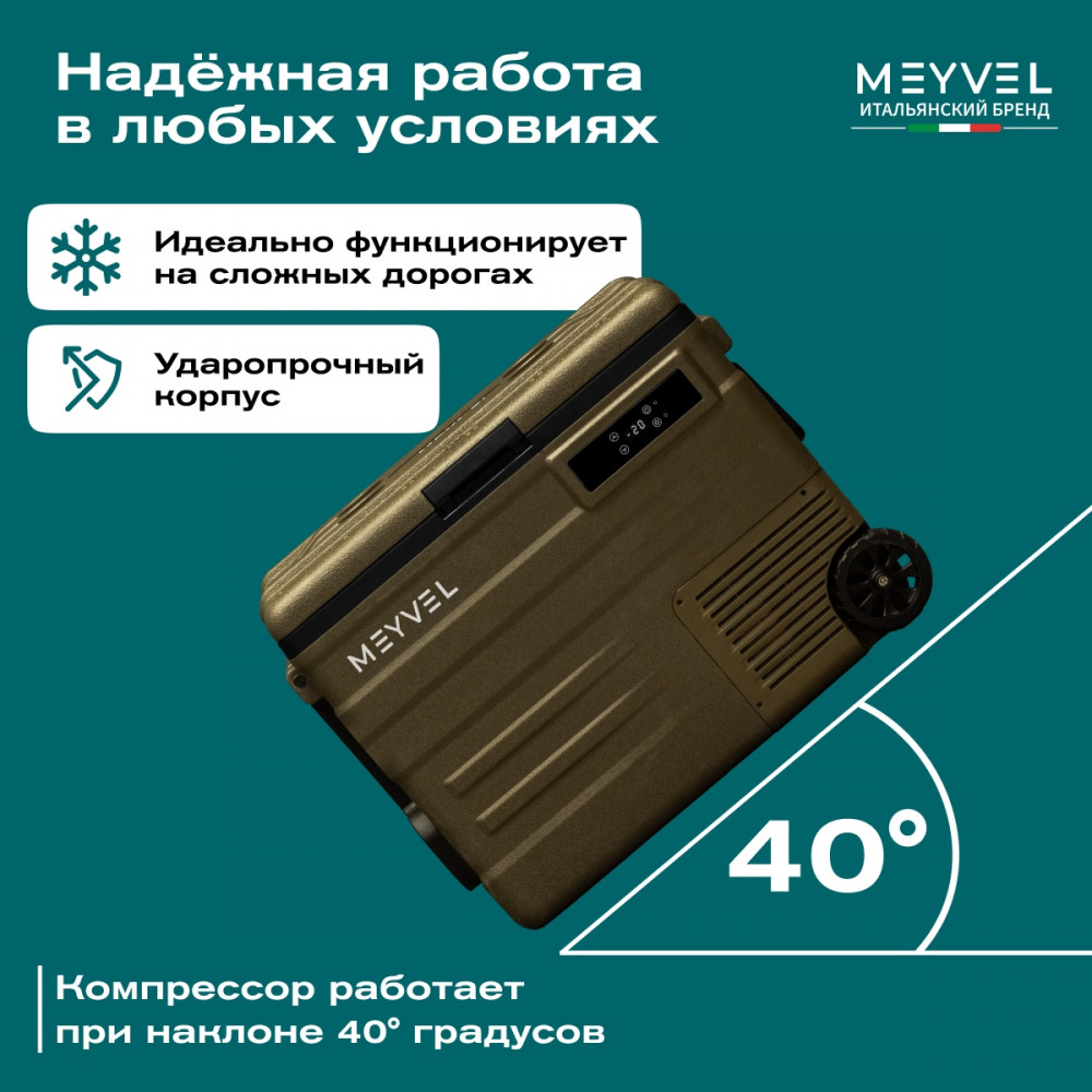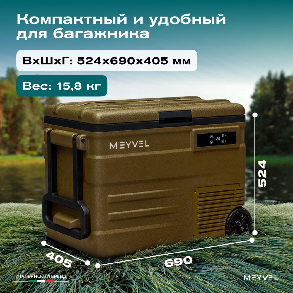 ОписаниеКомпрессорный автохолодильник Meyvel AF-U55-туристический (Meyvel AF-U55-travel) Итальянская компания MEYVEL разработала инновационную модель автомобильного холодильника AF-U55-туристический (AF-U55-travel), который отлично подойдет для транспортировки и хранения продуктов и напитков. Ключевой особенностью данной модели является тихий высокопроизводительный компрессор, имеющий напряжение 12/24 B, с системой защиты от разгерметизации. Благодаря оптимизированному программному обеспечению и регулируемой скорости вращения, Вы можете эффективно поддерживать нужную температуру в дороге и на природе. Автохолодильник закрывается на автоматическую защёлку, что исключает случайное открытие и потерю холода изнутри. AF-U55-туристический (AF-U55-travel) имеет 4 подстаканника, на которых можно надёжно расположить емкости с напитками. Любителей рыбалки, несомненно, порадует наличие на крышке линейки для измерения улова или других трофеев. Благодаря перечисленным особенностям, холодильник идеально подходит для отдыха на природе. Объёмное пространство внутри холодильника позволяет с легкостью разместить в нём большое количество разнообразных продуктов питания, сохраняя качество любимой еды и напитков, даже во время длительного путешествия. Простое и удобное управление На корпусе есть панель управления с дисплеем, с её помощью можно настроить рабочую температуру от +20 °C до -20 °C, автохолодильник будет автоматически поддерживать её. Так же можно выбрать один из двух режимов работы. Режим Максимальный позволит быстро заморозить продукты, благодаря работе на максимальной мощности. Выбрав Экономичный режим работы, холодильник будет дольше достигать заданного значения температуры, но при этом расходует меньше электроэнергии. В случае каких-либо сбоев в работе, на дисплее отображается код ошибки, что подскажет в чём именно проблема. Автохолодильник оснащён ручкой и колёсиками, что обеспечивает удобную ручную транспортировку. Высокие стандарты качества Благодаря использованию качественных комплектующих и высокотехнологичного производства, холодильники обладают высокой эффективностью и надежностью. Приобретая автохолодильник AF-U55-туристический (AF-U55-travel), Вы получите персональную консультацию по эксплуатации, а кроме того, мы гарантируем сервисную поддержку по всей стране. Вам больше не придется прерывать свое путешествие для того, чтобы перекусить в сомнительных закусочных и магазинах. С Meyvel любимая еда и напитки сохранят свой вкус и качество даже во время самого длительного путешествия! Отличительные особенности: внутренний объём – 55 литра; работа 12/24 В; два режима работы: Максимальный и Экономичный; температурный диапазон от +20 °C до -20 °C; охлаждение, заморозка, глубокая заморозка; защита от разрядки аккумулятора автомобиля; максимальный угол наклона компрессора 40°; память настроек; панель управления с дисплеем; индикация ошибок; ручки и колеса для удобной переноски. Видео Автохолодильники AF-U55-туристический