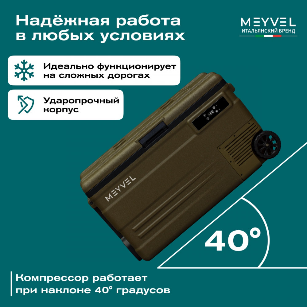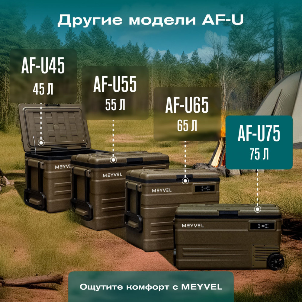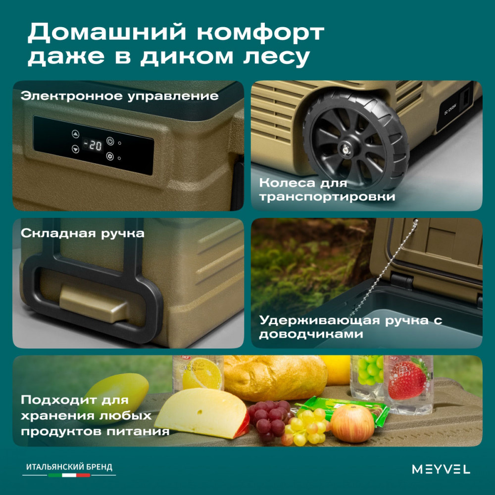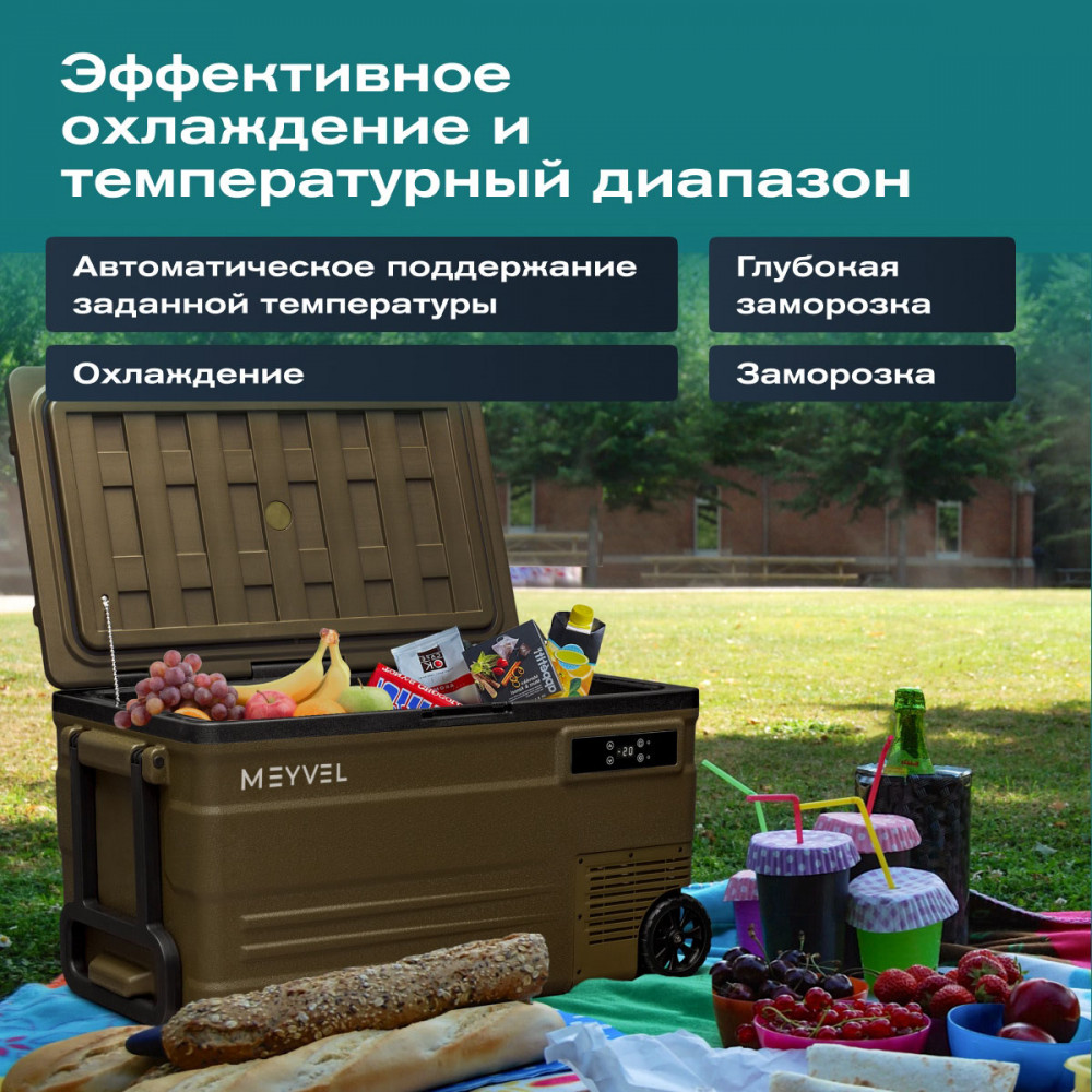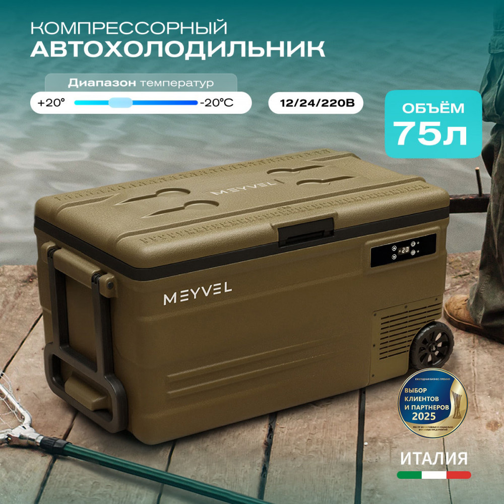 ОписаниеКомпрессорный автохолодильник Meyvel AF-U75-туристический (AF-U75-travel) Итальянская компания MEYVEL разработала инновационную модель автомобильного холодильника AF-U75-туристический (AF-U75-travel), который отлично подойдет для транспортировки и хранения продуктов и напитков. Ключевой особенностью данной модели является тихий высокопроизводительный компрессор, имеющий напряжение 12/24 B, с системой защиты от разгерметизации. Благодаря оптимизированному программному обеспечению и регулируемой скорости вращения, Вы можете эффективно поддерживать нужную температуру в дороге и на природе. Автохолодильник закрывается на автоматическую защёлку, что исключает случайное открытие и потерю холода изнутри. AF-U75-туристический (AF-U75-travel) имеет 4 подстаканника, на которых можно надёжно расположить емкости с напитками. Любителей рыбалки, несомненно, порадует наличие на крышке линейки для измерения улова или других трофеев. Благодаря перечисленным особенностям, холодильник идеально подходит для отдыха на природе. Объёмное пространство внутри холодильника позволяет с легкостью разместить в нём большое количество разнообразных продуктов питания, сохраняя качество любимой еды и напитков, даже во время длительного путешествия. Простое и удобное управление На корпусе есть панель управления с дисплеем, с её помощью можно настроить рабочую температуру от +20 °C до -20 °C, автохолодильник будет автоматически поддерживать её. Так же можно выбрать один из двух режимов работы. Режим Максимальный позволит быстро заморозить продукты, благодаря работе на максимальной мощности. Выбрав Экономичный режим работы, холодильник будет дольше достигать заданного значения температуры, но при этом расходует меньше электроэнергии. В случае каких-либо сбоев в работе, на дисплее отображается код ошибки, что подскажет в чём именно проблема. Автохолодильник оснащён ручкой и колёсиками, что обеспечивает удобную ручную транспортировку. Высокие стандарты качества Благодаря использованию качественных комплектующих и высокотехнологичного производства, холодильники обладают высокой эффективностью и надежностью. Приобретая автохолодильник AF-U75-туристический (AF-U75-travel), Вы получите персональную консультацию по эксплуатации, а кроме того, мы гарантируем сервисную поддержку по всей стране. Вам больше не придется прерывать свое путешествие для того, чтобы перекусить в сомнительных закусочных и магазинах. С Meyvel любимая еда и напитки сохранят свой вкус и качество даже во время самого длительного путешествия! Отличительные особенности: внутренний объём – 75 литра; работа 12/24 В; два режима работы: Максимальный и Экономичный; температурный диапазон от +20 °C до -20 °C; охлаждение, заморозка, глубокая заморозка; защита от разрядки аккумулятора автомобиля; максимальный угол наклона компрессора 40°; память настроек; панель управления с дисплеем; индикация ошибок; ручки и колеса для удобной переноски. Видео Автохолодильники AF-U65-туристический