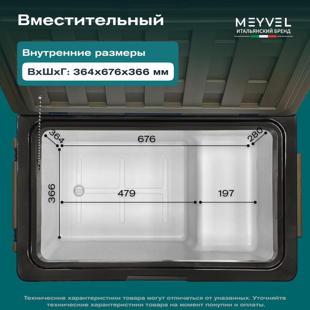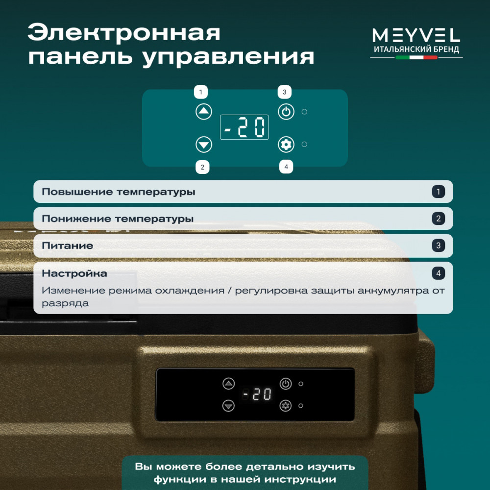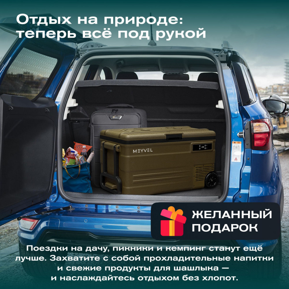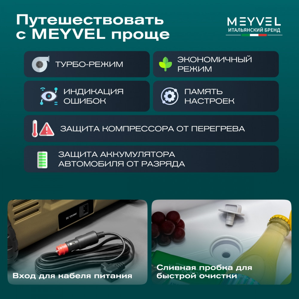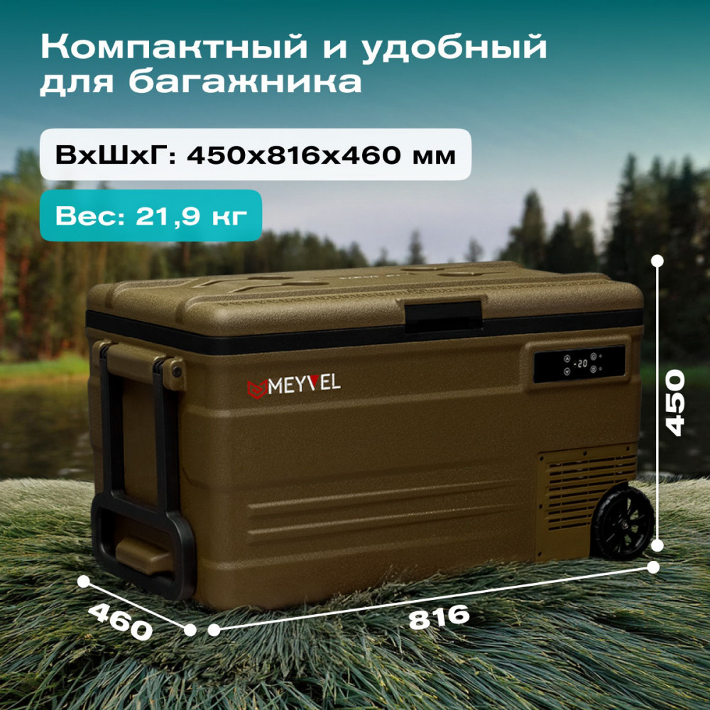 ОписаниеКомпрессорный автохолодильник Meyvel AF-U75-туристический (AF-U75-travel) Итальянская компания MEYVEL разработала инновационную модель автомобильного холодильника AF-U75-туристический (AF-U75-travel), который отлично подойдет для транспортировки и хранения продуктов и напитков. Ключевой особенностью данной модели является тихий высокопроизводительный компрессор, имеющий напряжение 12/24 B, с системой защиты от разгерметизации. Благодаря оптимизированному программному обеспечению и регулируемой скорости вращения, Вы можете эффективно поддерживать нужную температуру в дороге и на природе. Автохолодильник закрывается на автоматическую защёлку, что исключает случайное открытие и потерю холода изнутри. AF-U75-туристический (AF-U75-travel) имеет 4 подстаканника, на которых можно надёжно расположить емкости с напитками. Любителей рыбалки, несомненно, порадует наличие на крышке линейки для измерения улова или других трофеев. Благодаря перечисленным особенностям, холодильник идеально подходит для отдыха на природе. Объёмное пространство внутри холодильника позволяет с легкостью разместить в нём большое количество разнообразных продуктов питания, сохраняя качество любимой еды и напитков, даже во время длительного путешествия. Простое и удобное управление На корпусе есть панель управления с дисплеем, с её помощью можно настроить рабочую температуру от +20 °C до -20 °C, автохолодильник будет автоматически поддерживать её. Так же можно выбрать один из двух режимов работы. Режим Максимальный позволит быстро заморозить продукты, благодаря работе на максимальной мощности. Выбрав Экономичный режим работы, холодильник будет дольше достигать заданного значения температуры, но при этом расходует меньше электроэнергии. В случае каких-либо сбоев в работе, на дисплее отображается код ошибки, что подскажет в чём именно проблема. Автохолодильник оснащён ручкой и колёсиками, что обеспечивает удобную ручную транспортировку. Высокие стандарты качества Благодаря использованию качественных комплектующих и высокотехнологичного производства, холодильники обладают высокой эффективностью и надежностью. Приобретая автохолодильник AF-U75-туристический (AF-U75-travel), Вы получите персональную консультацию по эксплуатации, а кроме того, мы гарантируем сервисную поддержку по всей стране. Вам больше не придется прерывать свое путешествие для того, чтобы перекусить в сомнительных закусочных и магазинах. С Meyvel любимая еда и напитки сохранят свой вкус и качество даже во время самого длительного путешествия! Отличительные особенности: внутренний объём – 75 литра; работа 12/24 В; два режима работы: Максимальный и Экономичный; температурный диапазон от +20 °C до -20 °C; охлаждение, заморозка, глубокая заморозка; защита от разрядки аккумулятора автомобиля; максимальный угол наклона компрессора 40°; память настроек; панель управления с дисплеем; индикация ошибок; ручки и колеса для удобной переноски. Видео Автохолодильники AF-U65-туристический