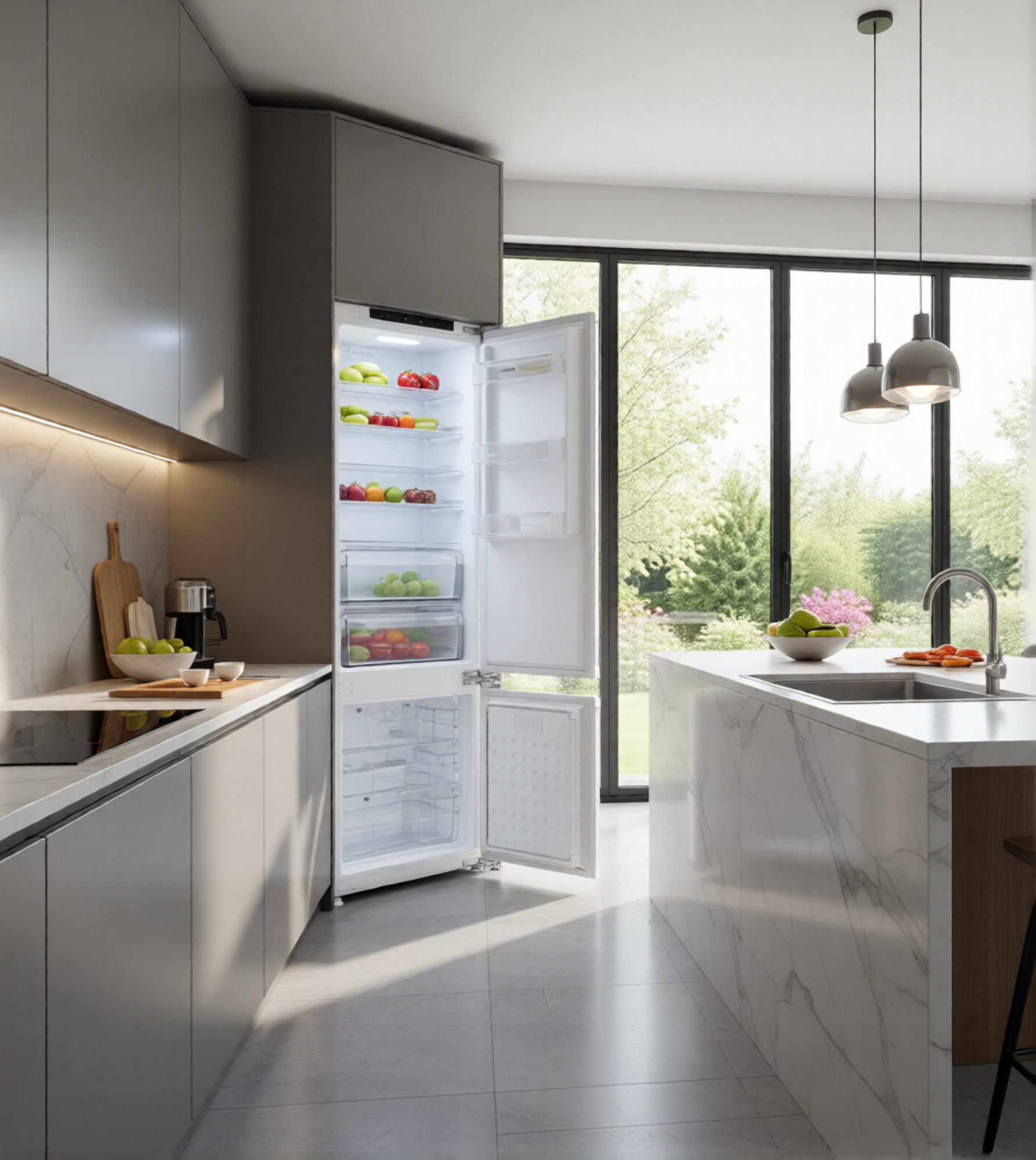 Технология Zero Clearance и гибкость установки: Благодаря специальным петлям Zero Clearance холодильник можно установить в угол кухни — при открывании двери на 90 градусов все ящики свободно и полностью выдвигаются. Возможность перевешивания дверей позволяет адаптировать открывание под любую планировку .
