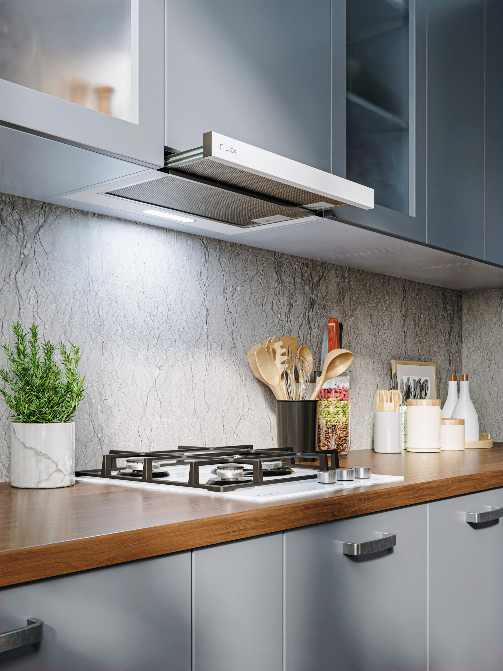 Интегрированная вытяжка сочетает в себе эстетику и гибкость эксплуатации.